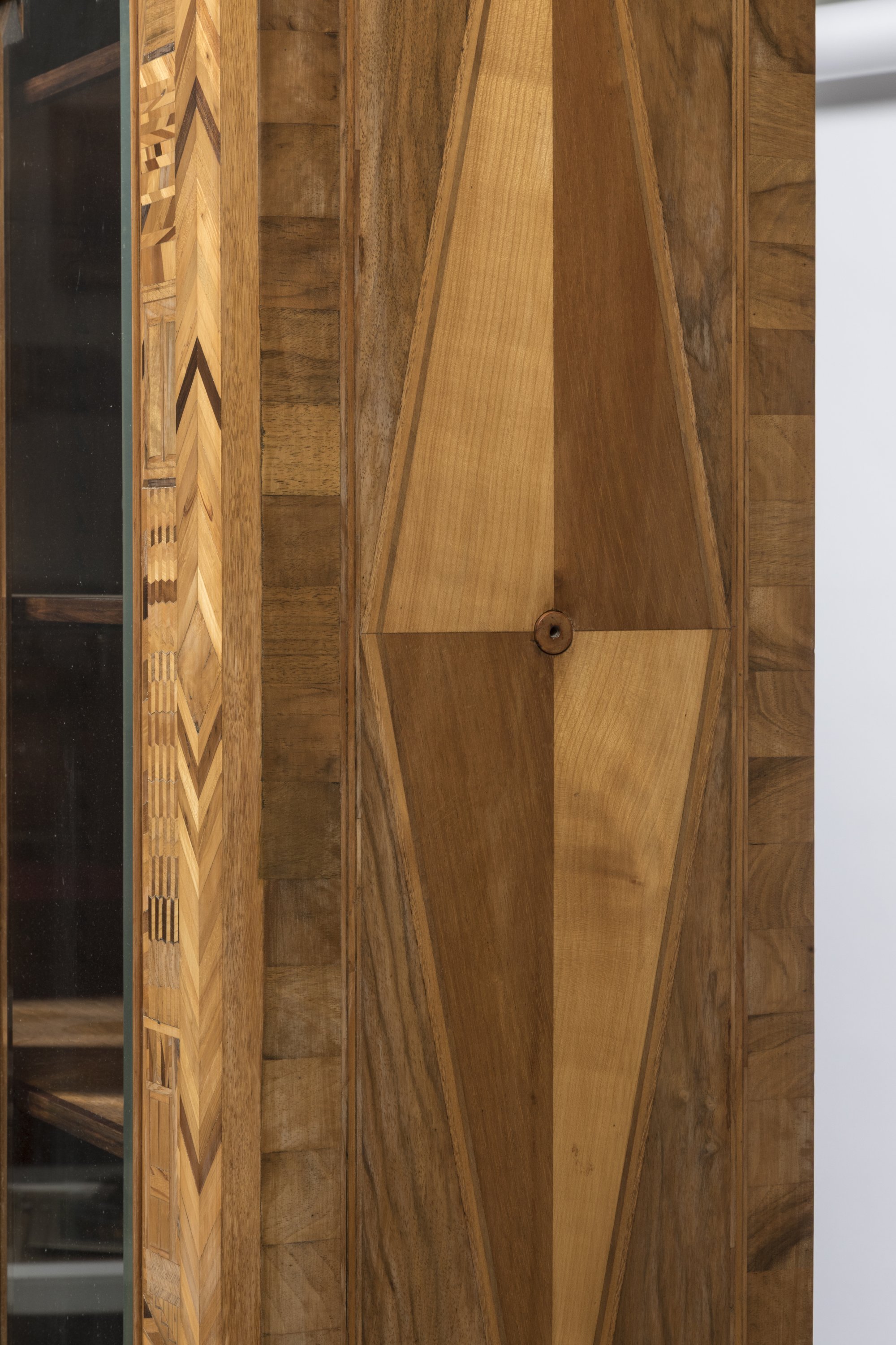 Coiffé d'un fronton mouvementé, il se compose en partie haute de deux portes vitrées biseautées dont l'ouverture est actionnée par un bouton placé sur le côté. L'ensemble est souligné d'encadrements aux formes géométriques. La partie basse ouvre par deux tiroirs et deux vantaux décorés de châteaux. Il repose sur quatre pieds.
