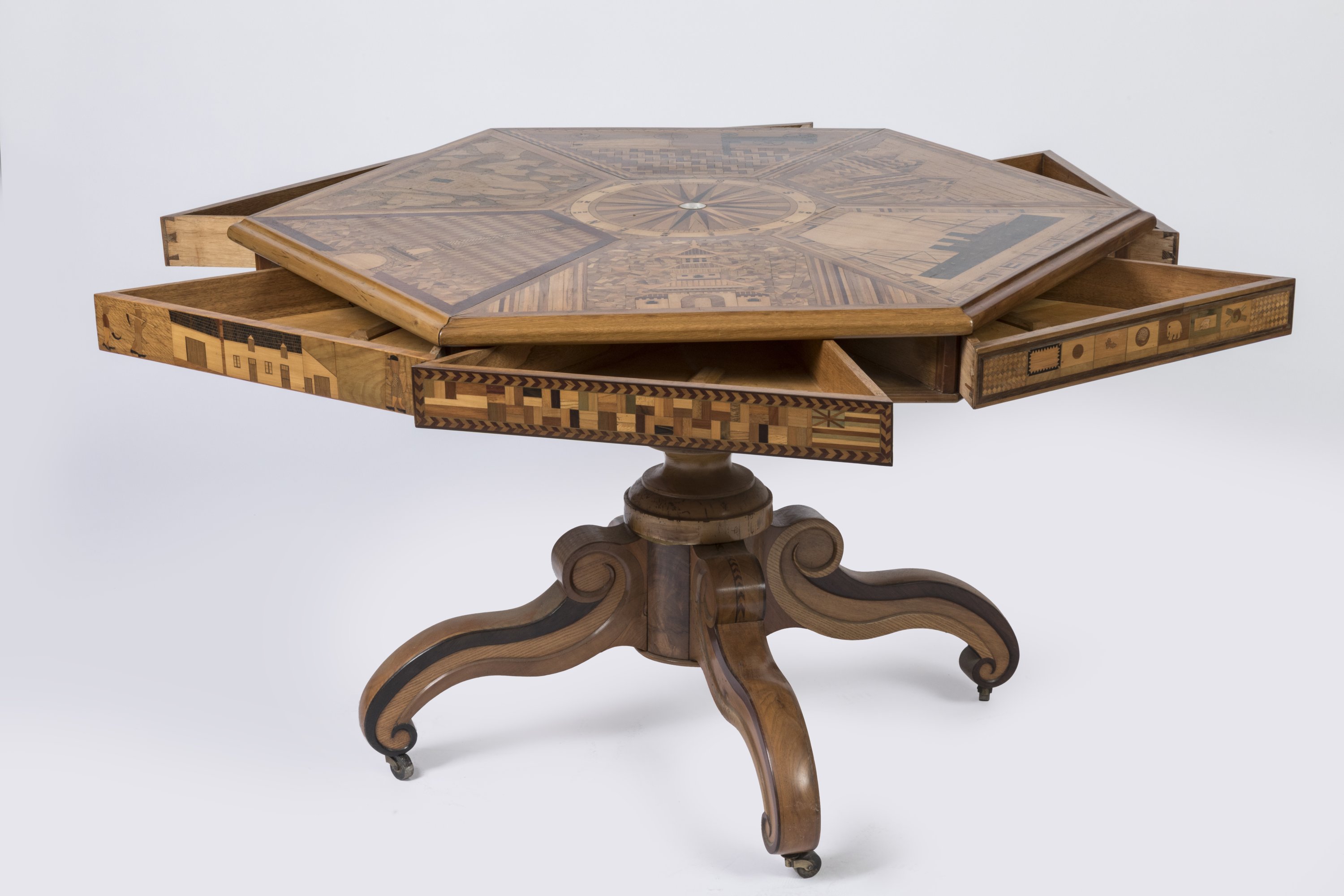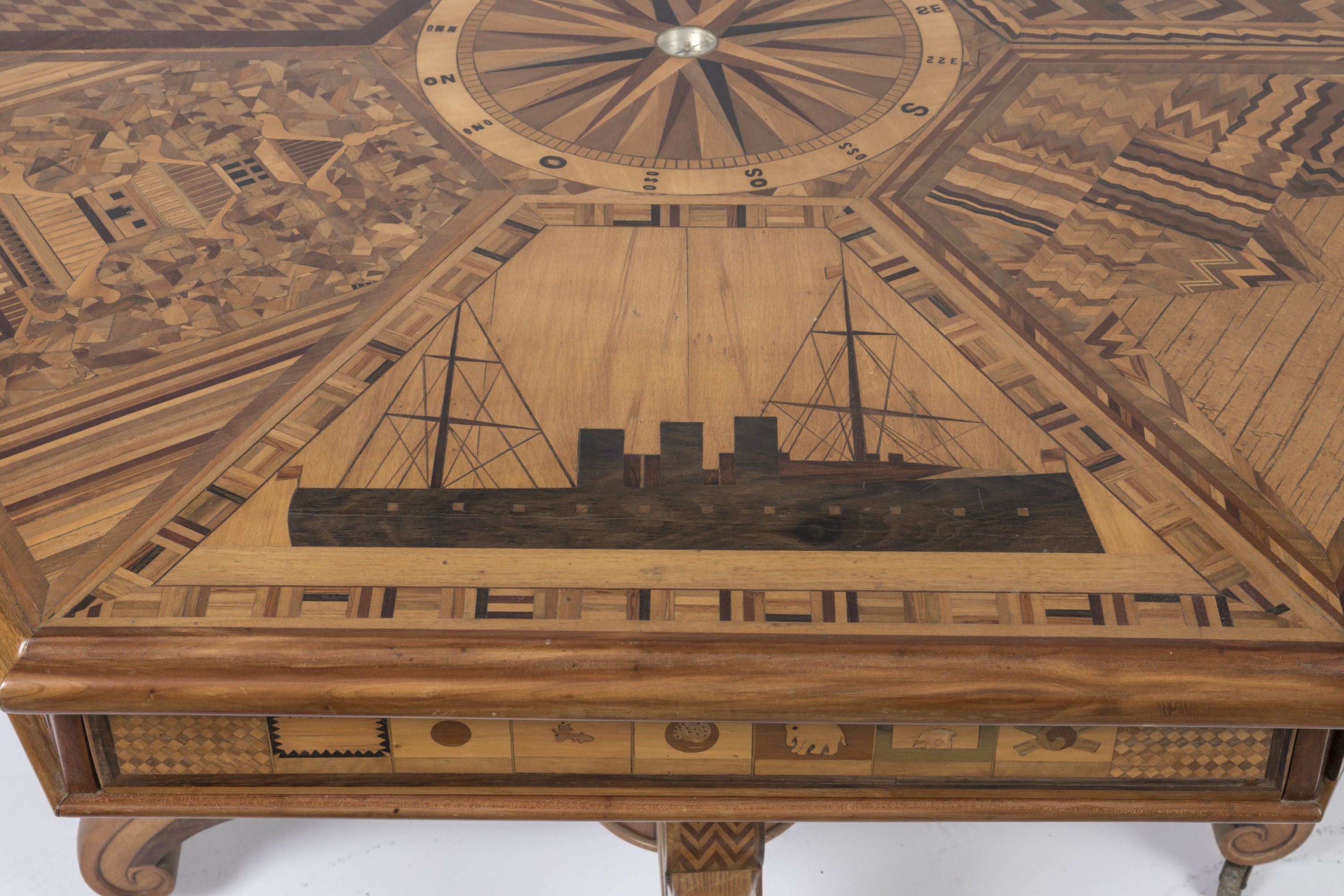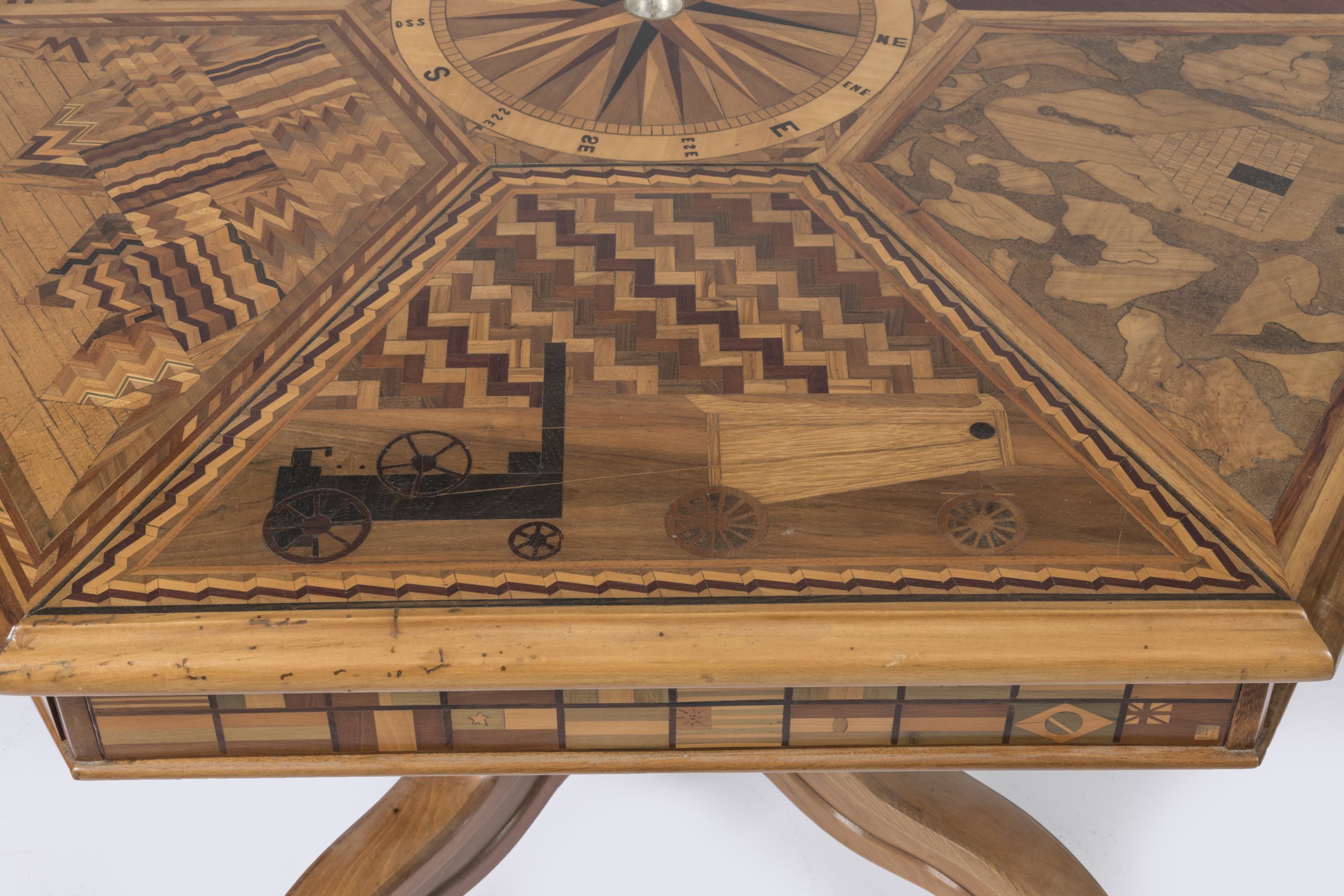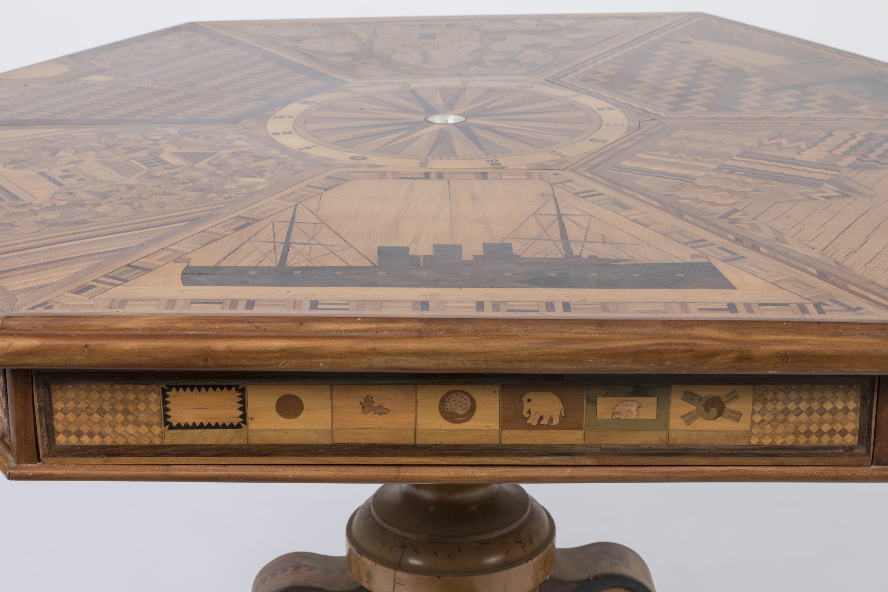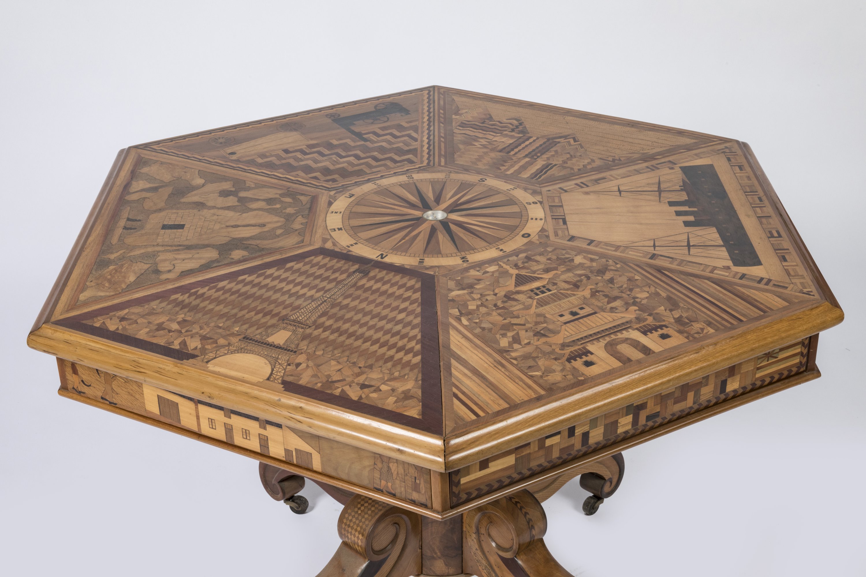 An octogonal marquetry table depicting the part played by France around the world. Made in honor of the 1889 Paris Exposition.