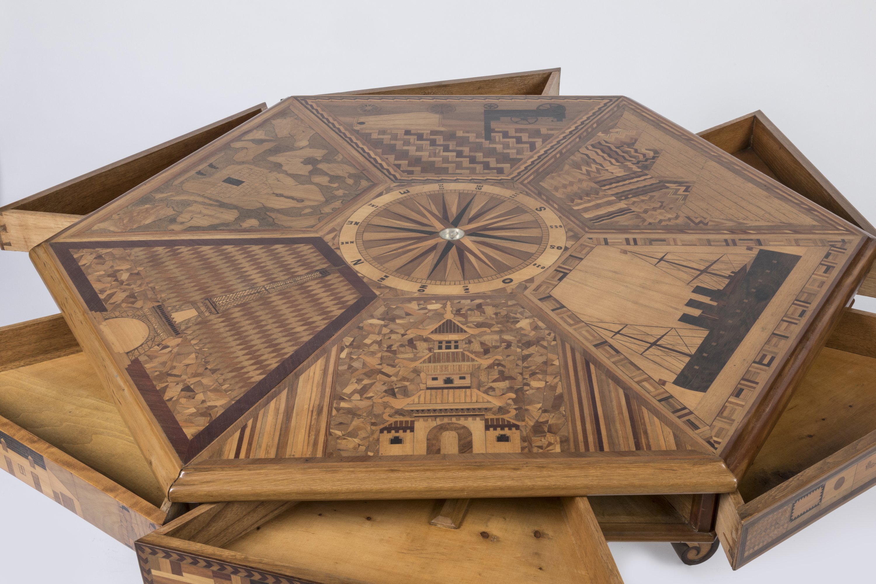 Bois de placage. De forme octogonale, au plateau marqueté d'un bateau à vapeur, d'une machine à vapeur, de la Tour Eiffel, des pyramides symbolisant le percement du canal de Suez, d'une case africaine et d'une pagode indochinoise dans des cartouches entourant une boussole. Les tiroirs à système sont décorés des drapeaux du monde et de scènes rurales. Le piétement quadripode est terminé par des roulettes.