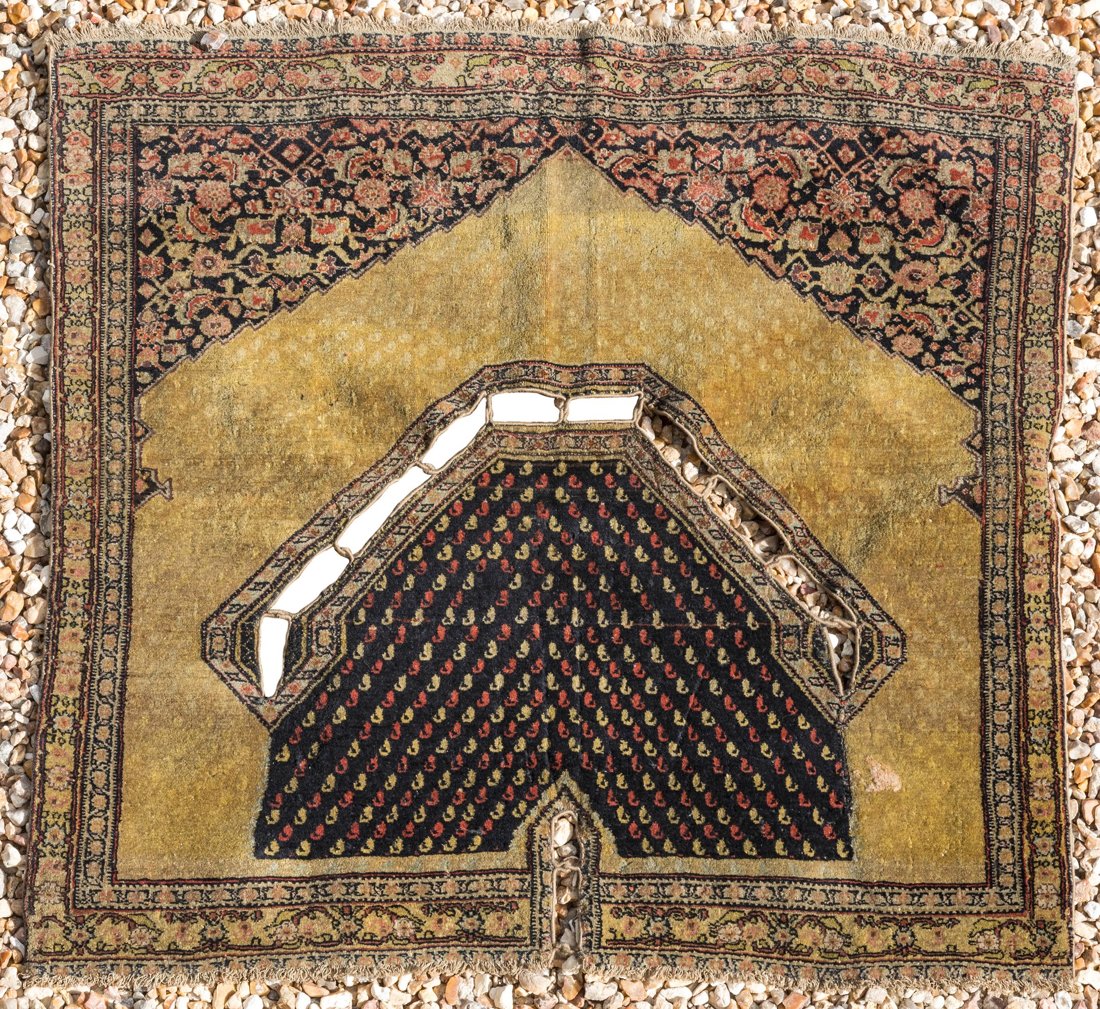 Orné de palmes avec jours pour la bosse du dromadaire sous une arcature jaune, écoinçons noirs, à dense décor herati de fleurs et palmes, bordure d’un galon de fleurs.