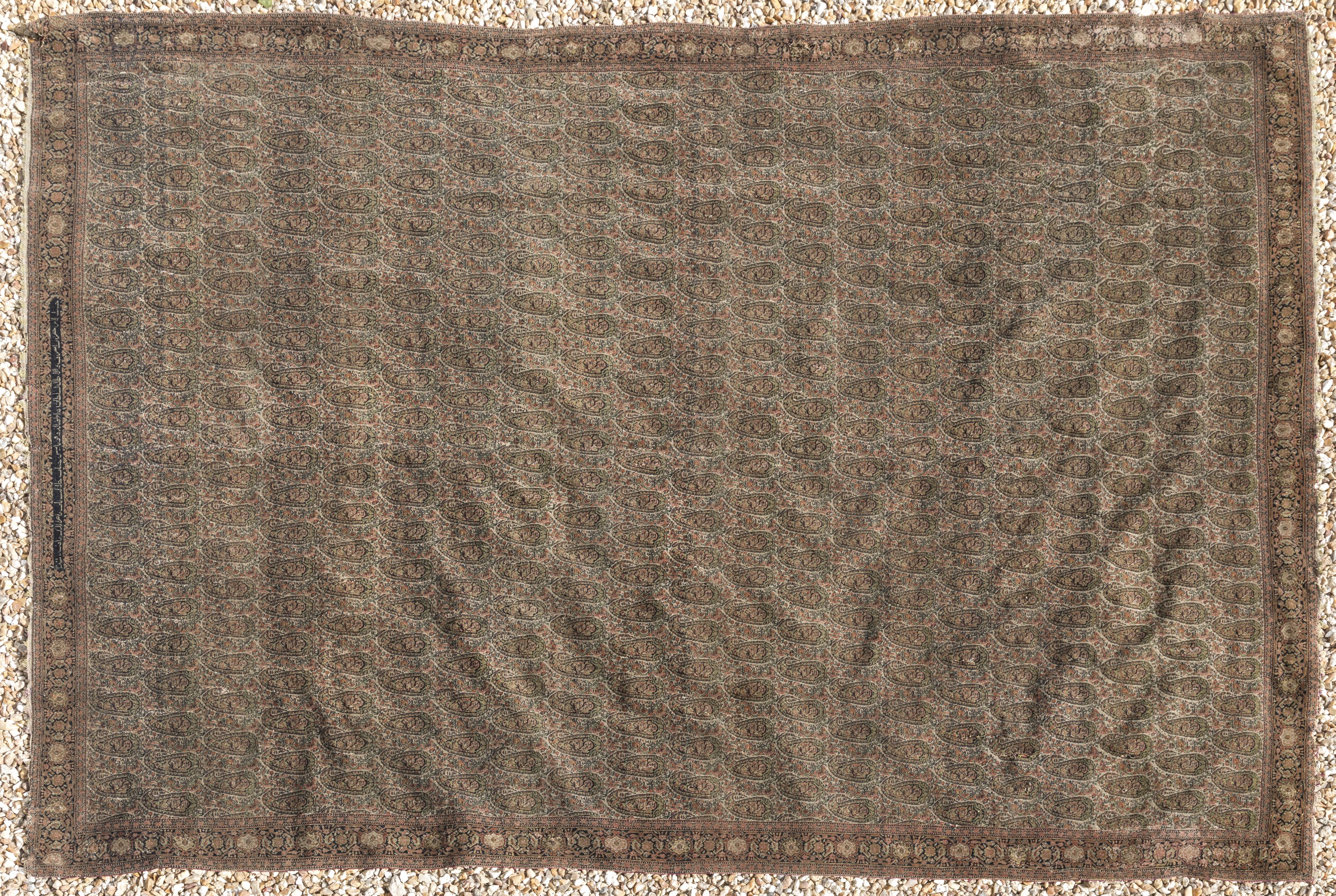 A Senneh rug featuring a paisley pattern on an ivory background. Inscribed "ordered by the Sultan's inner circle member, His Excellency the Noble and Just Naser-al-Molk (?) in 1301".