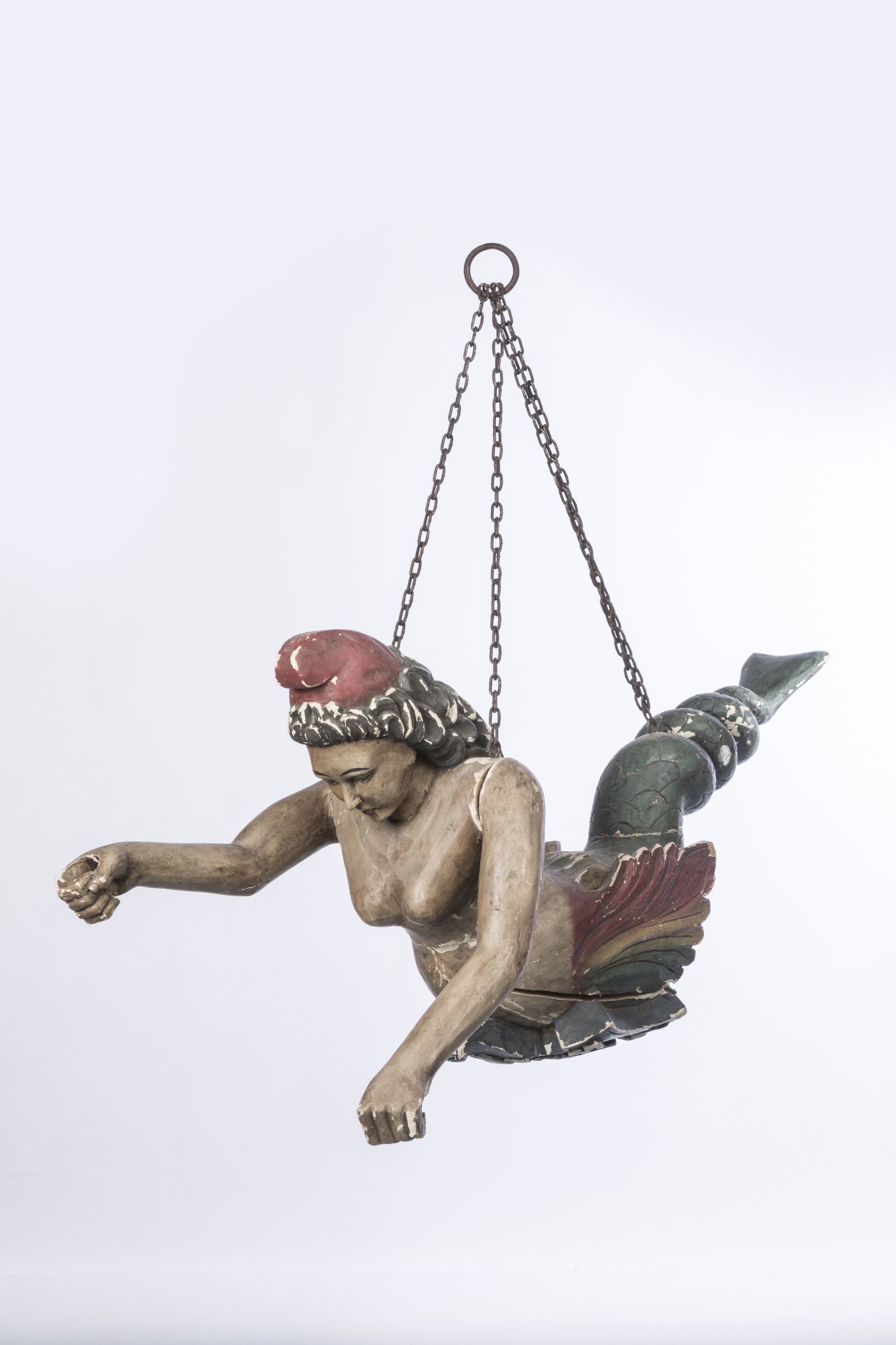 An 1877 polychrome carved wood and stucco shop sign featuring a mermaid.