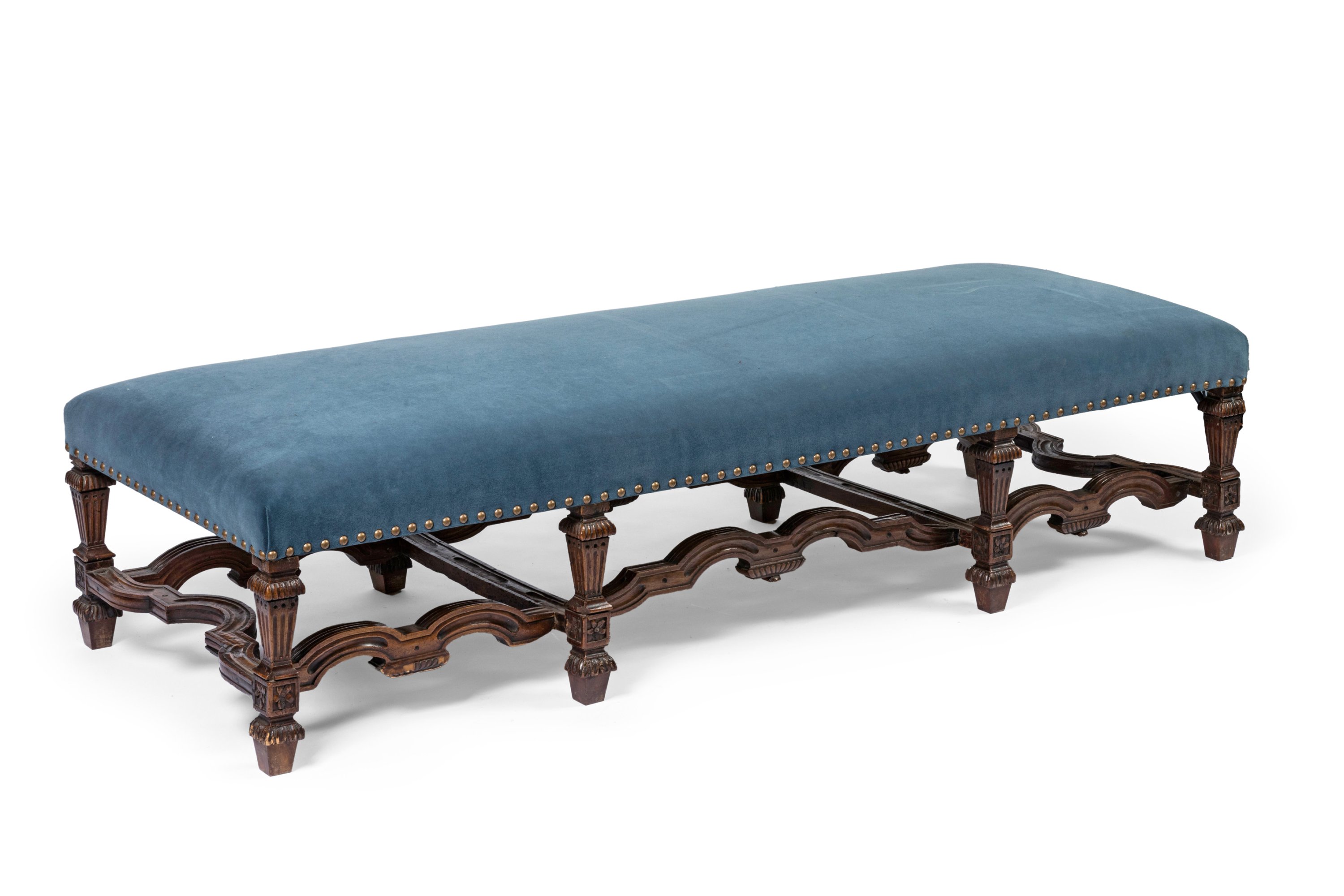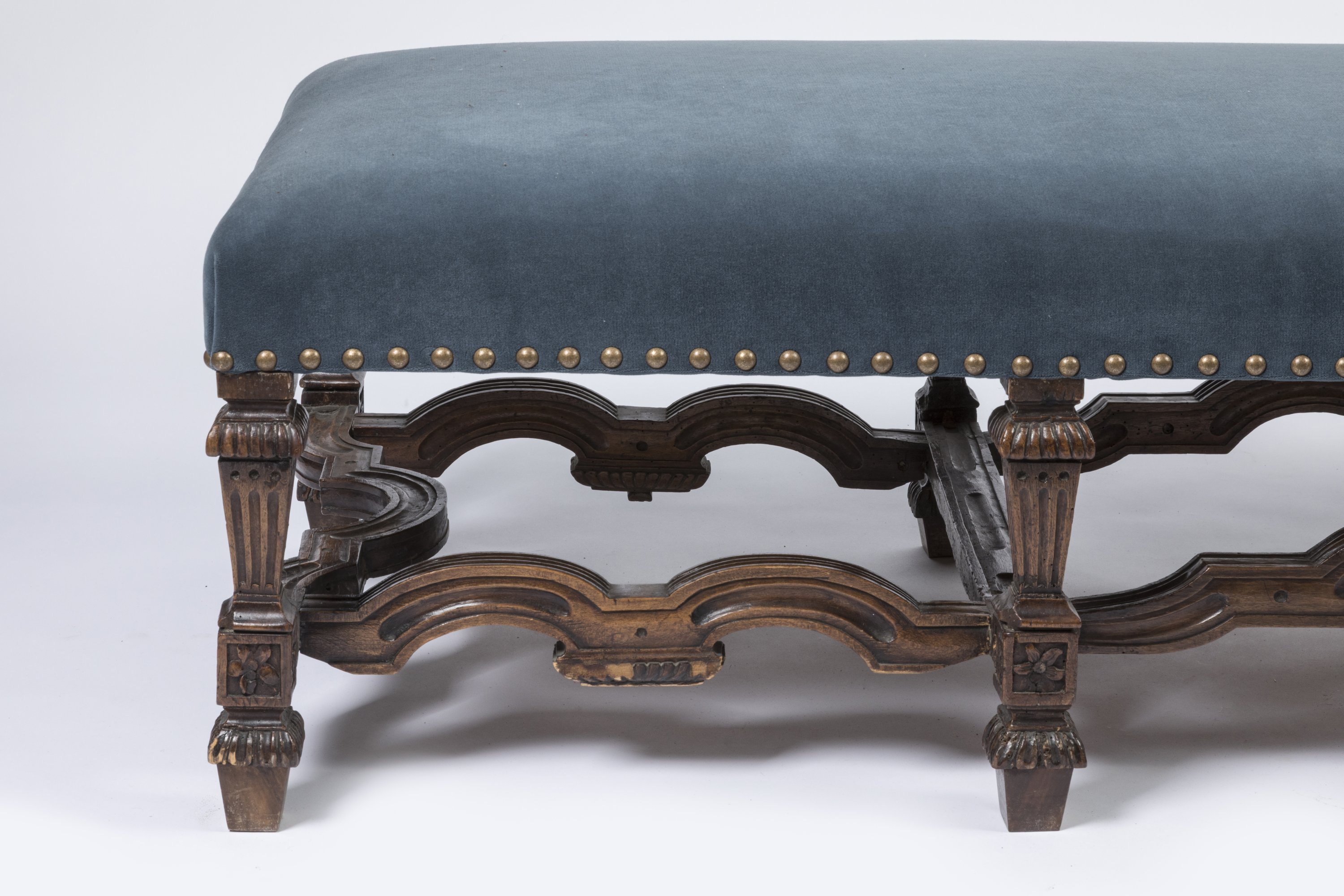 A moulded and carved walnut bench. Blue velvet upholstery.