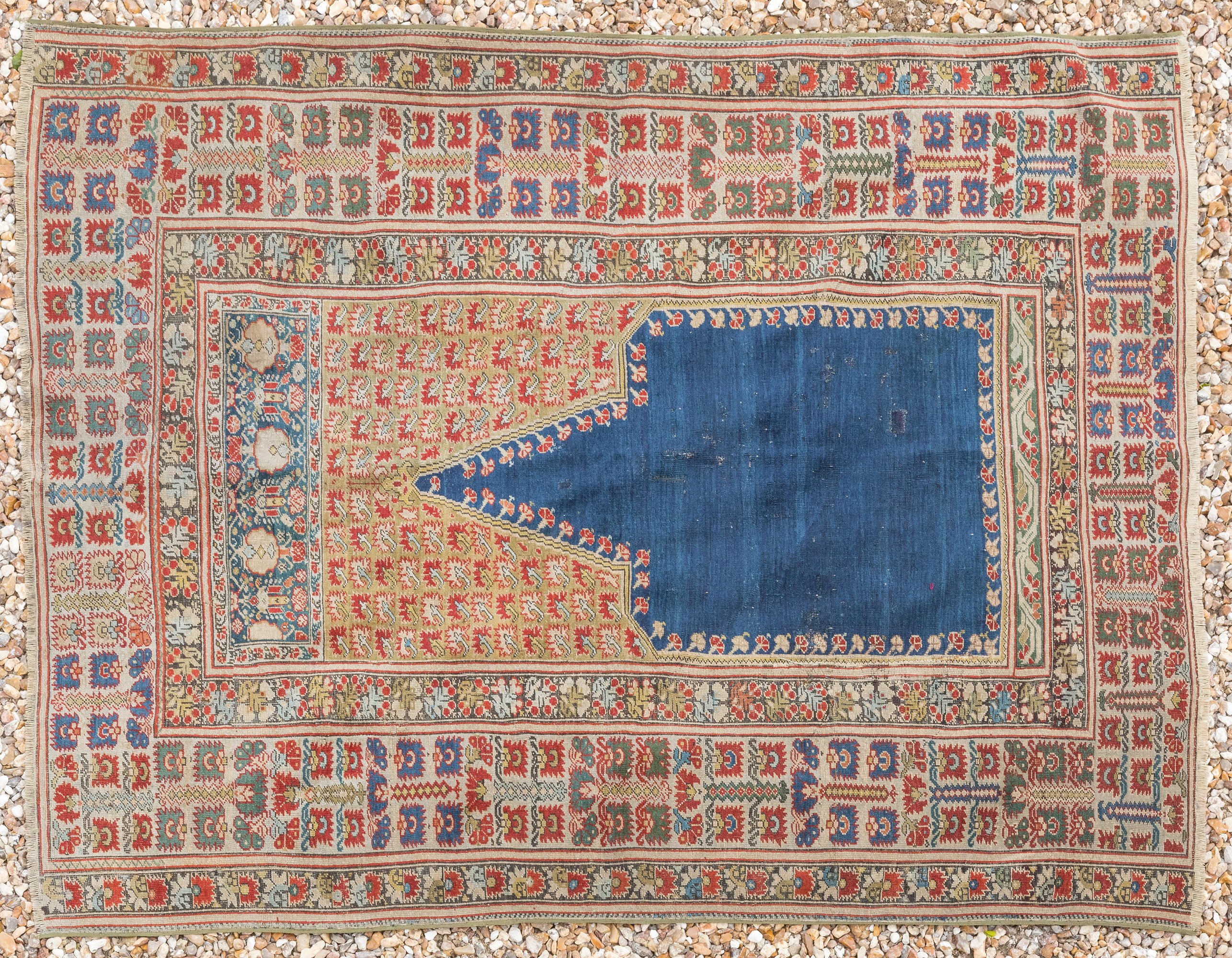 A Turkish Ghiordes prayer rug featuring a navy blue mihrab surrounded by an intricate border.