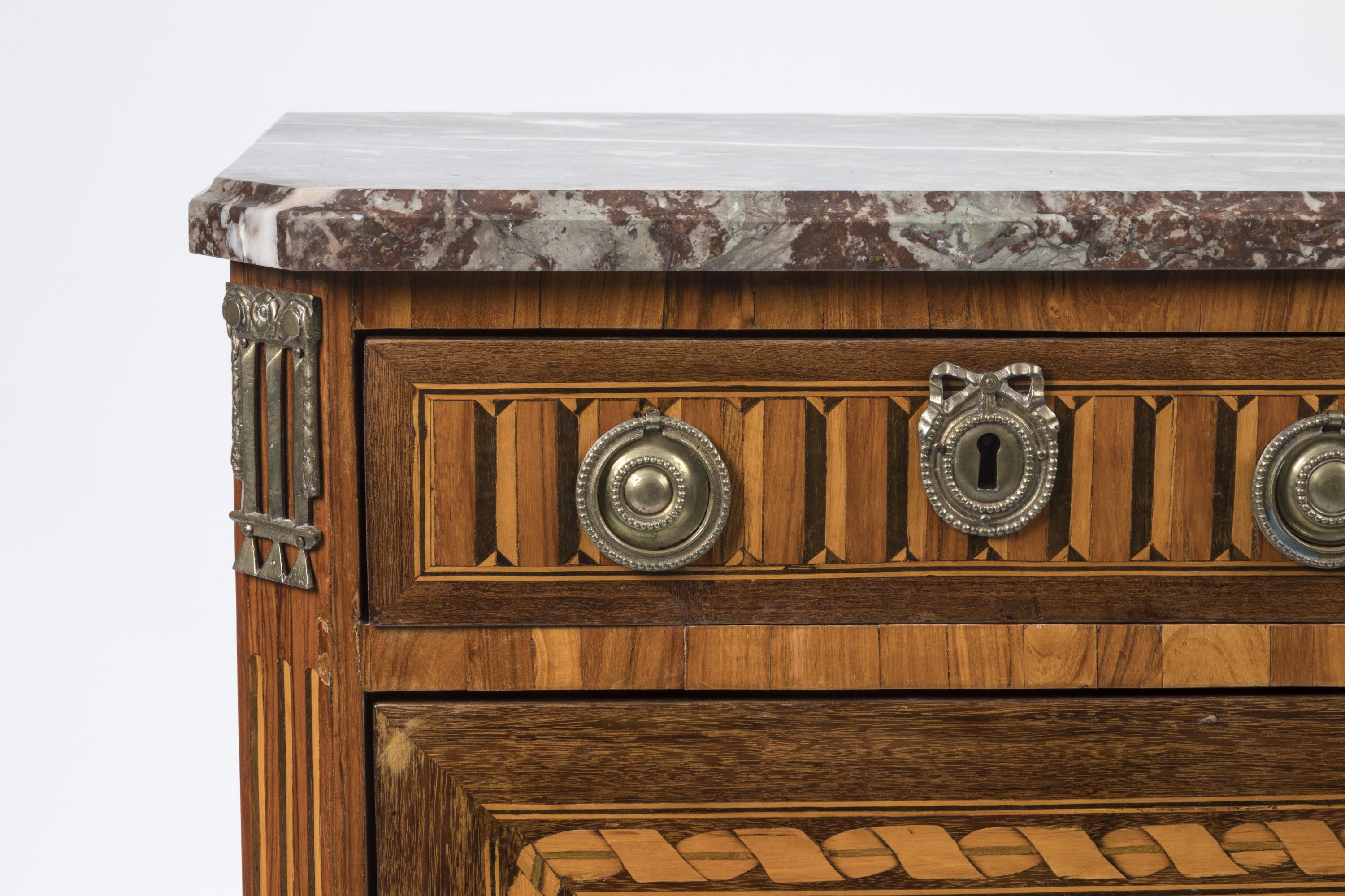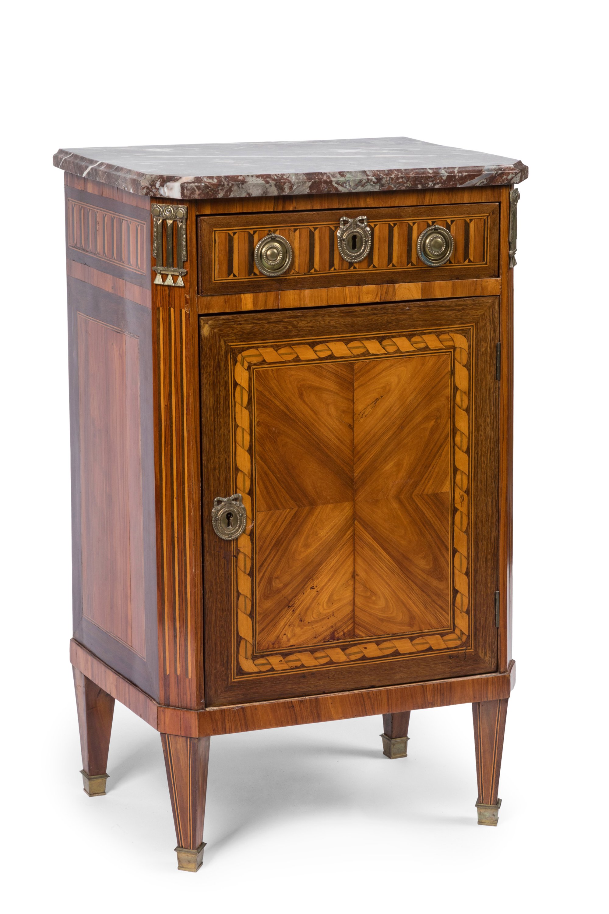 Il ouvre par un tiroir à décor géométrique et un vantail en aile de papillon dans un entourage de filets et un phylactère enrubanné. Les montants à pans coupés sont soulignés de cannelures simulées. Il repose sur quatre pieds en gaine.
