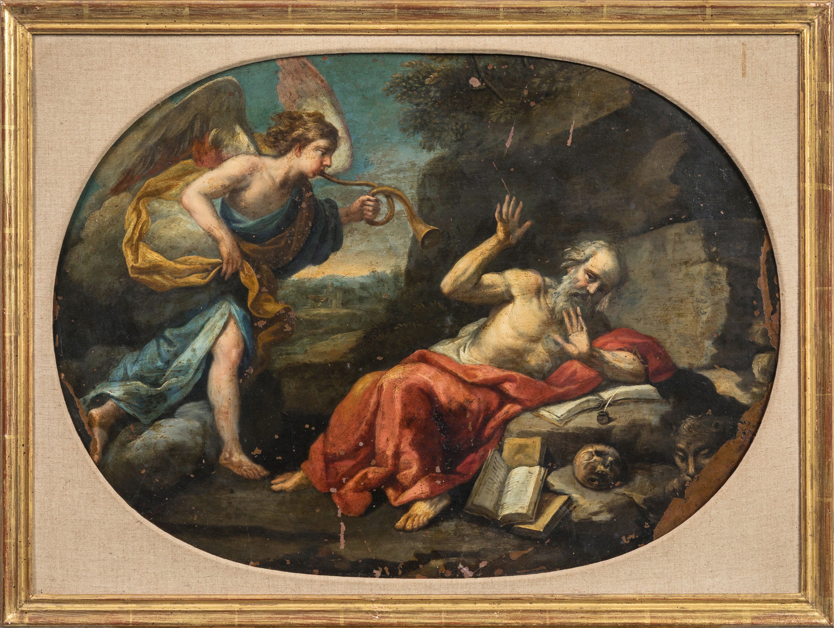 A painting featuring Saint Jerome and the Angel by the entourage of Giacinto Gimignani. Oil on oval copper plate. Roman School, 17th century.