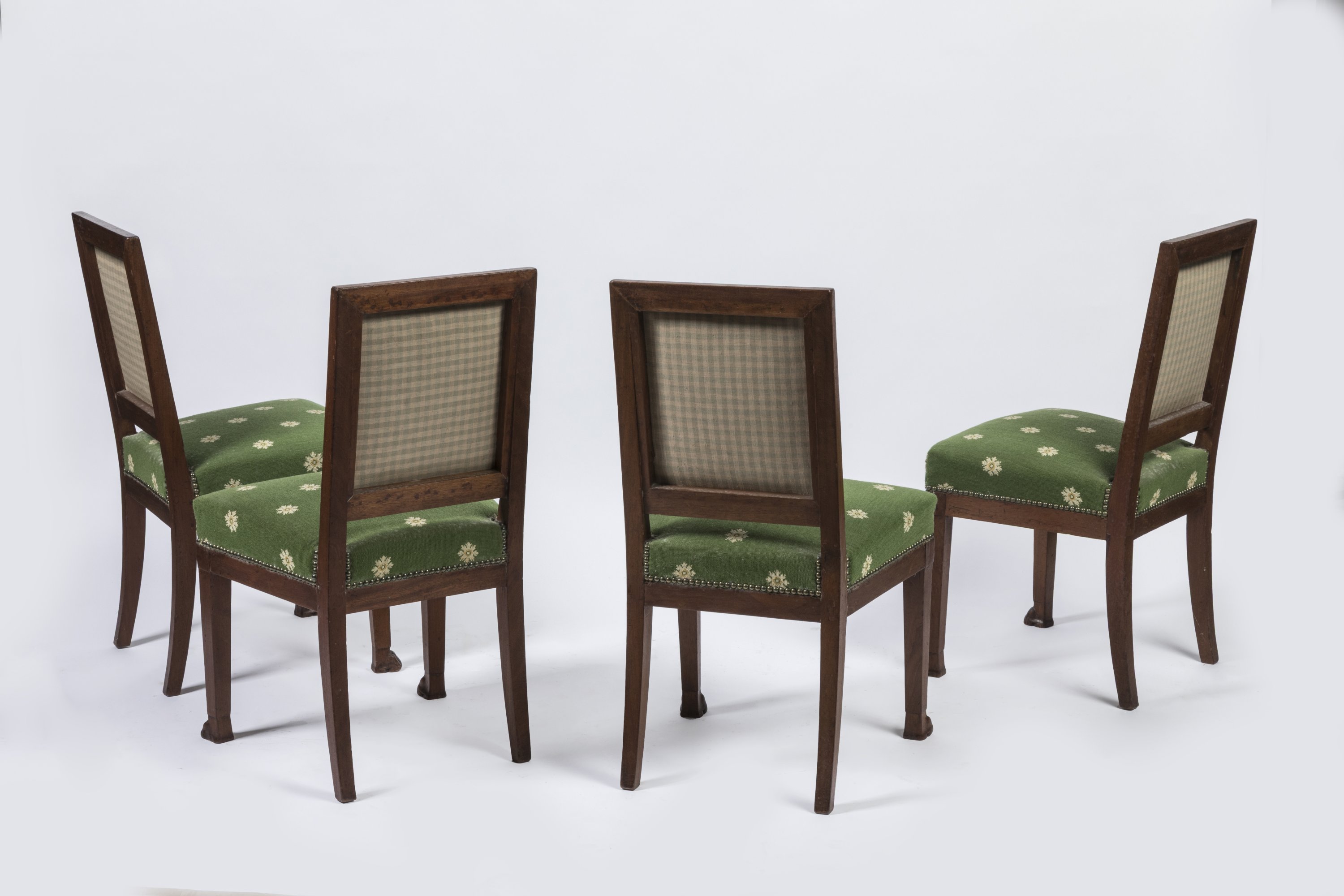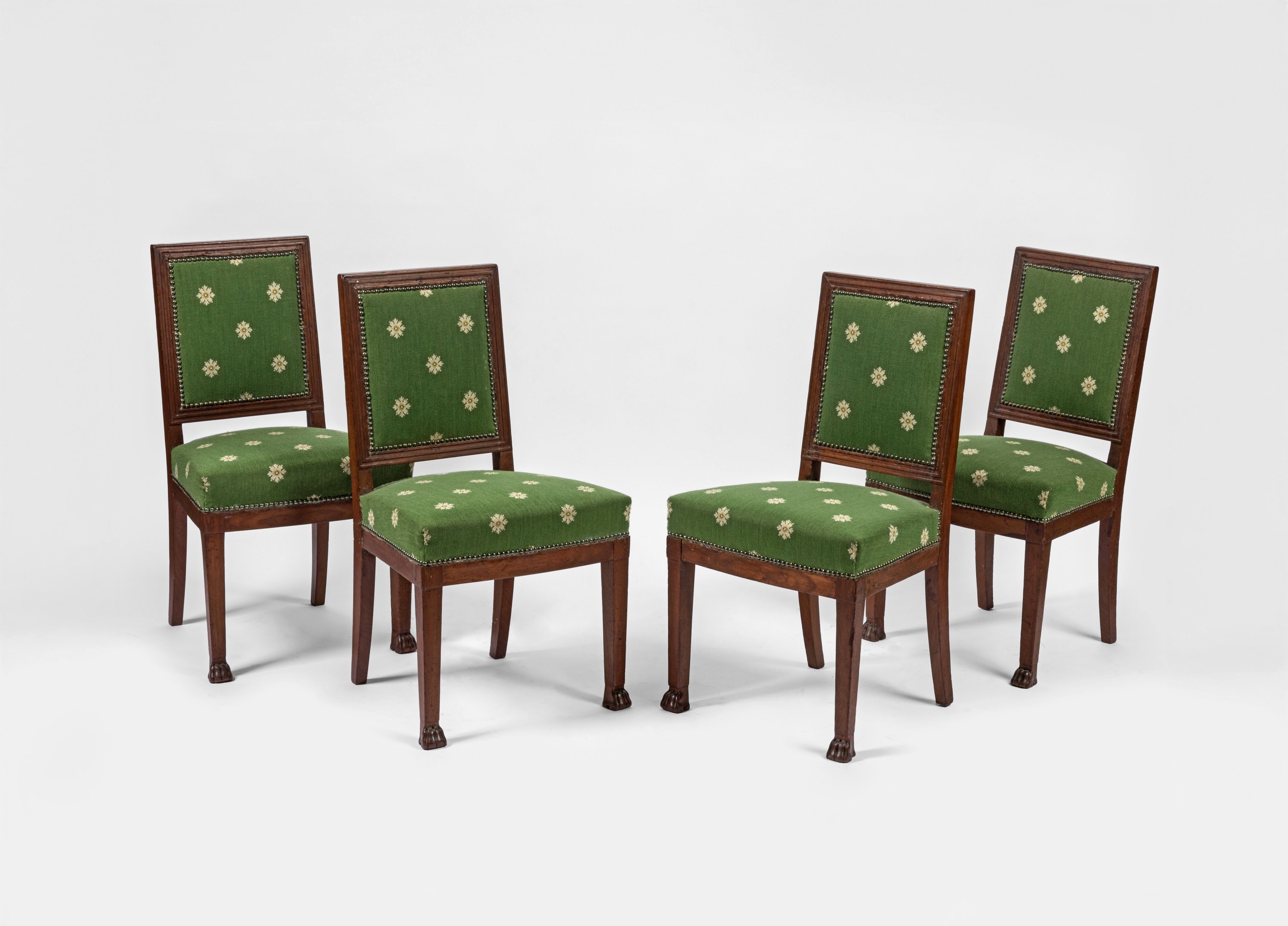 A set of four mahogany armchairs and four chairs. Green upholstery. Restauration Period.