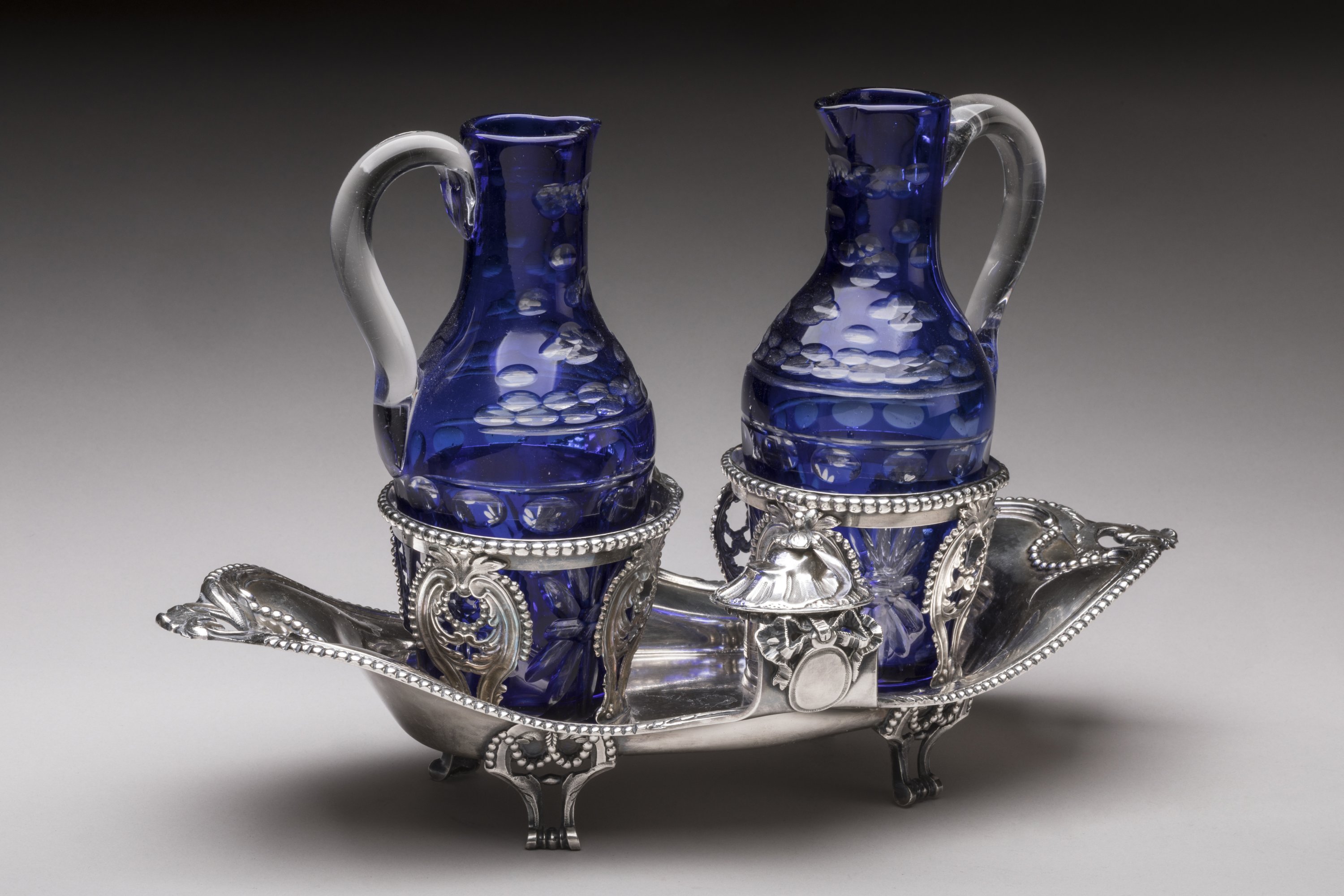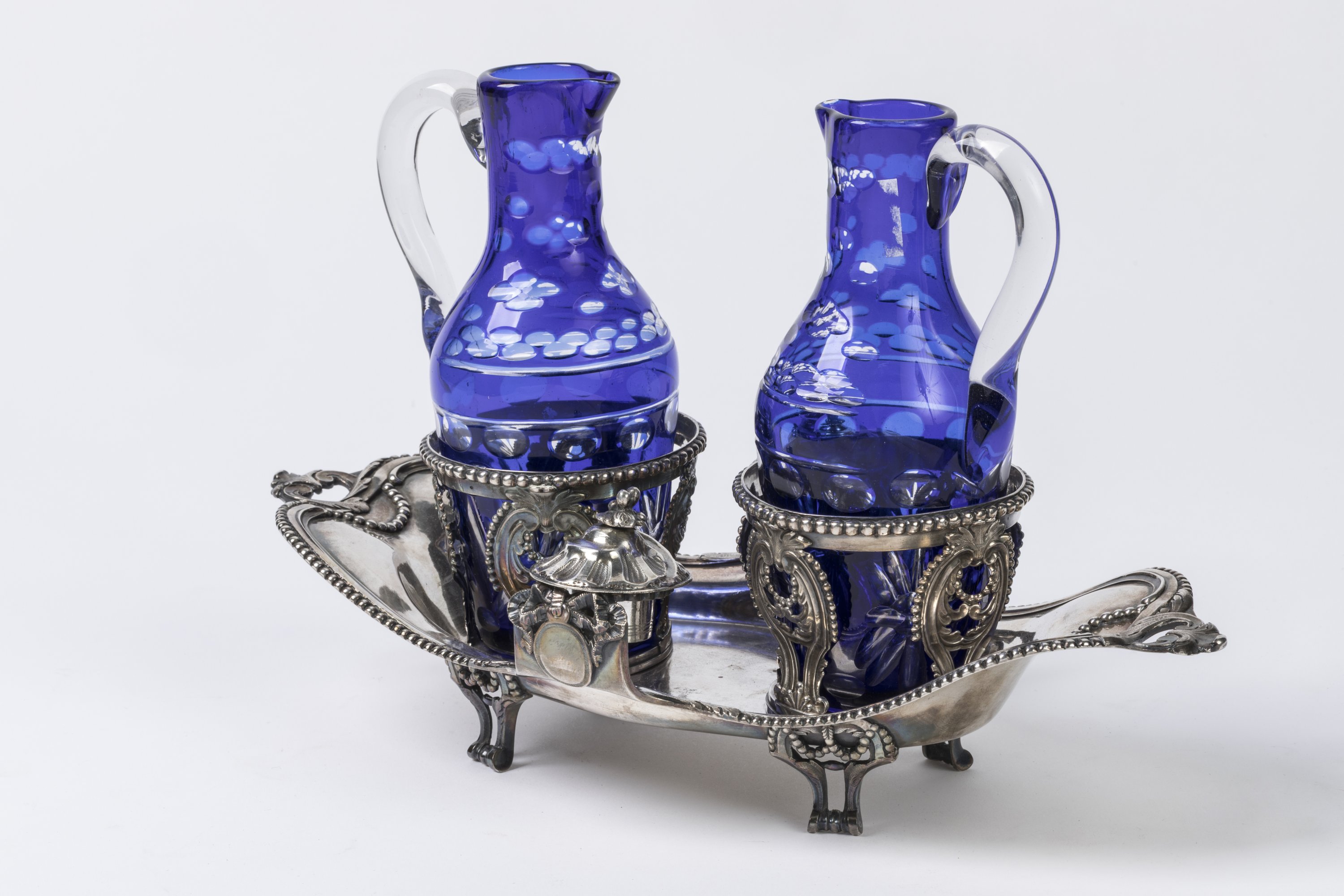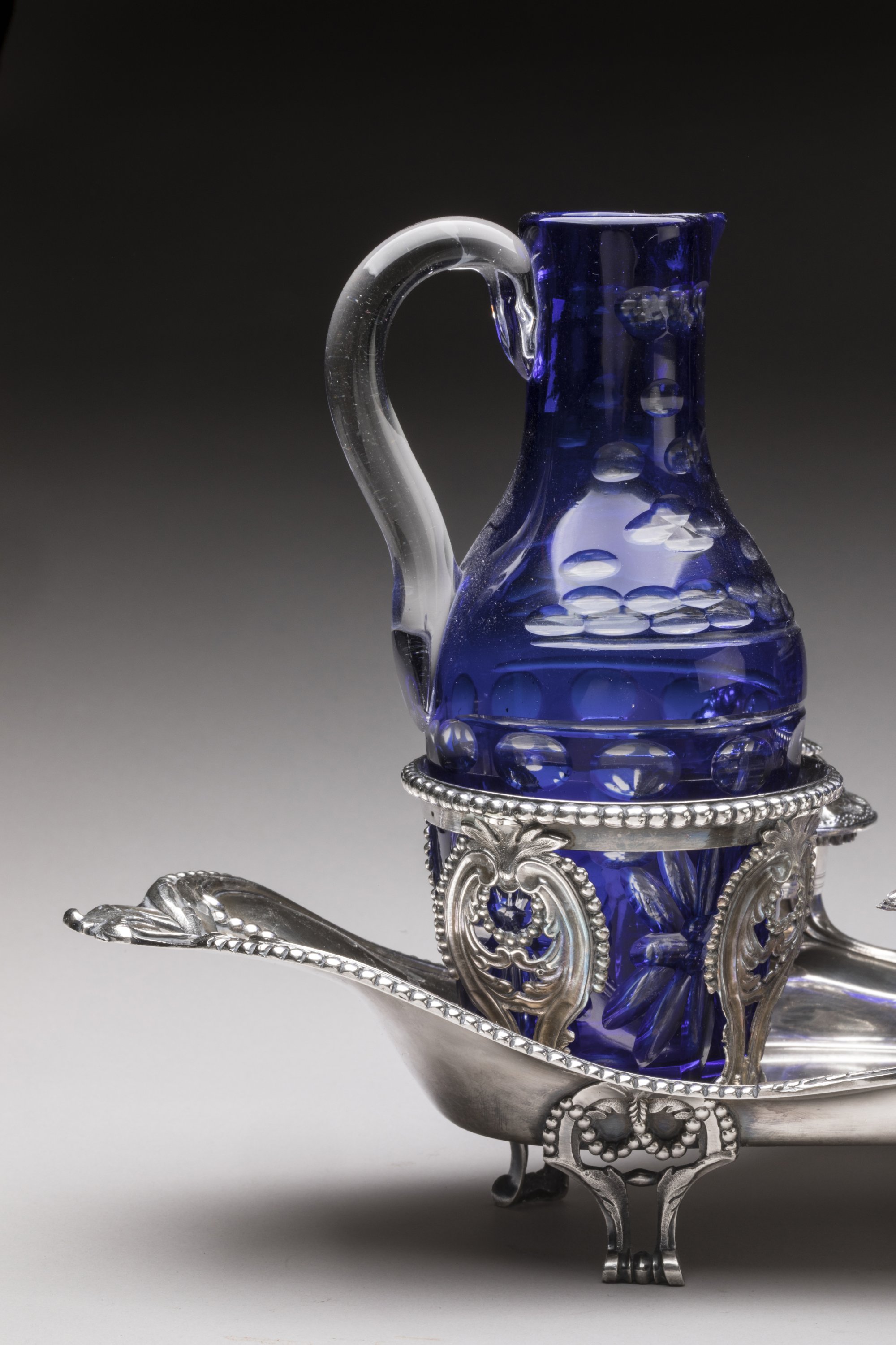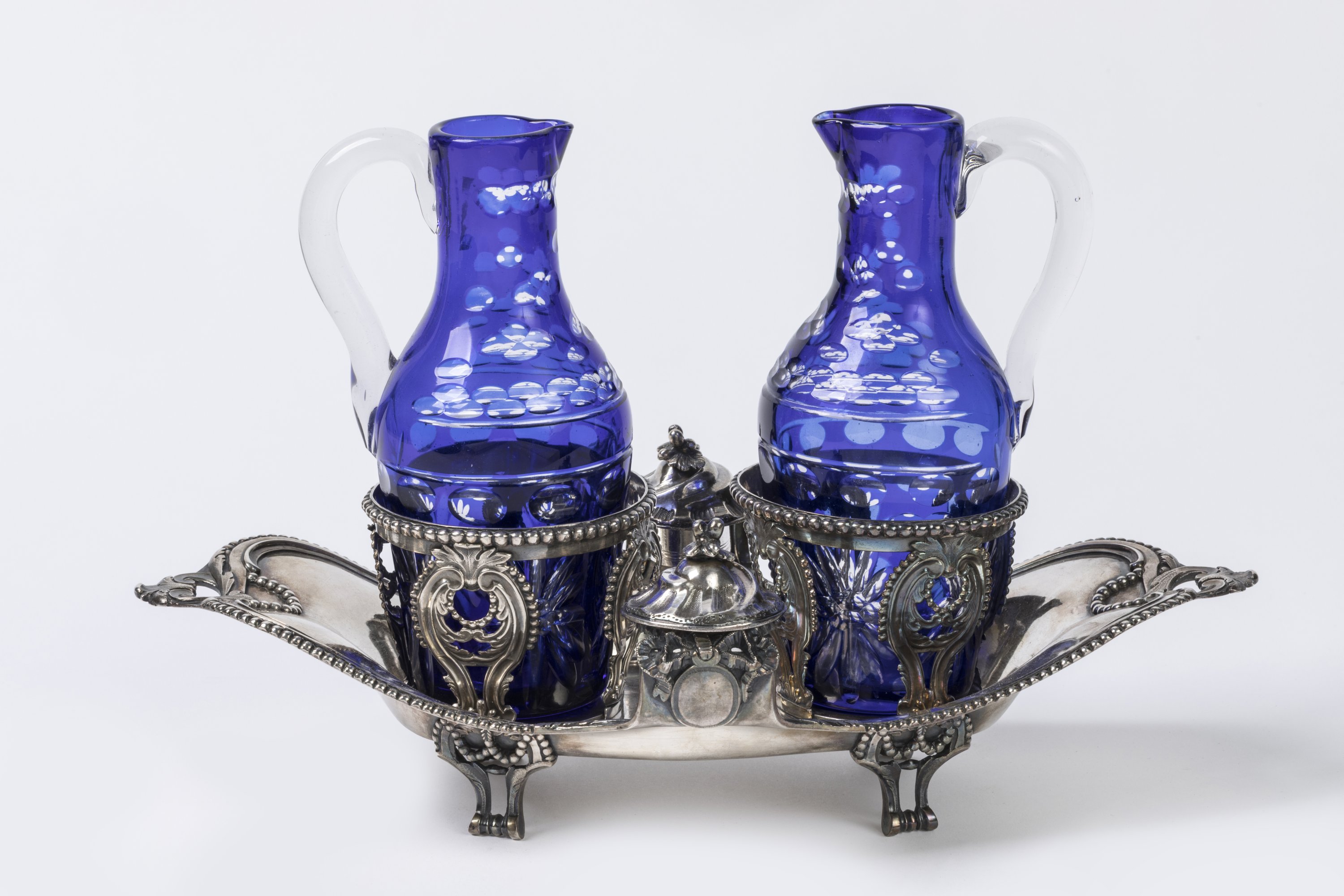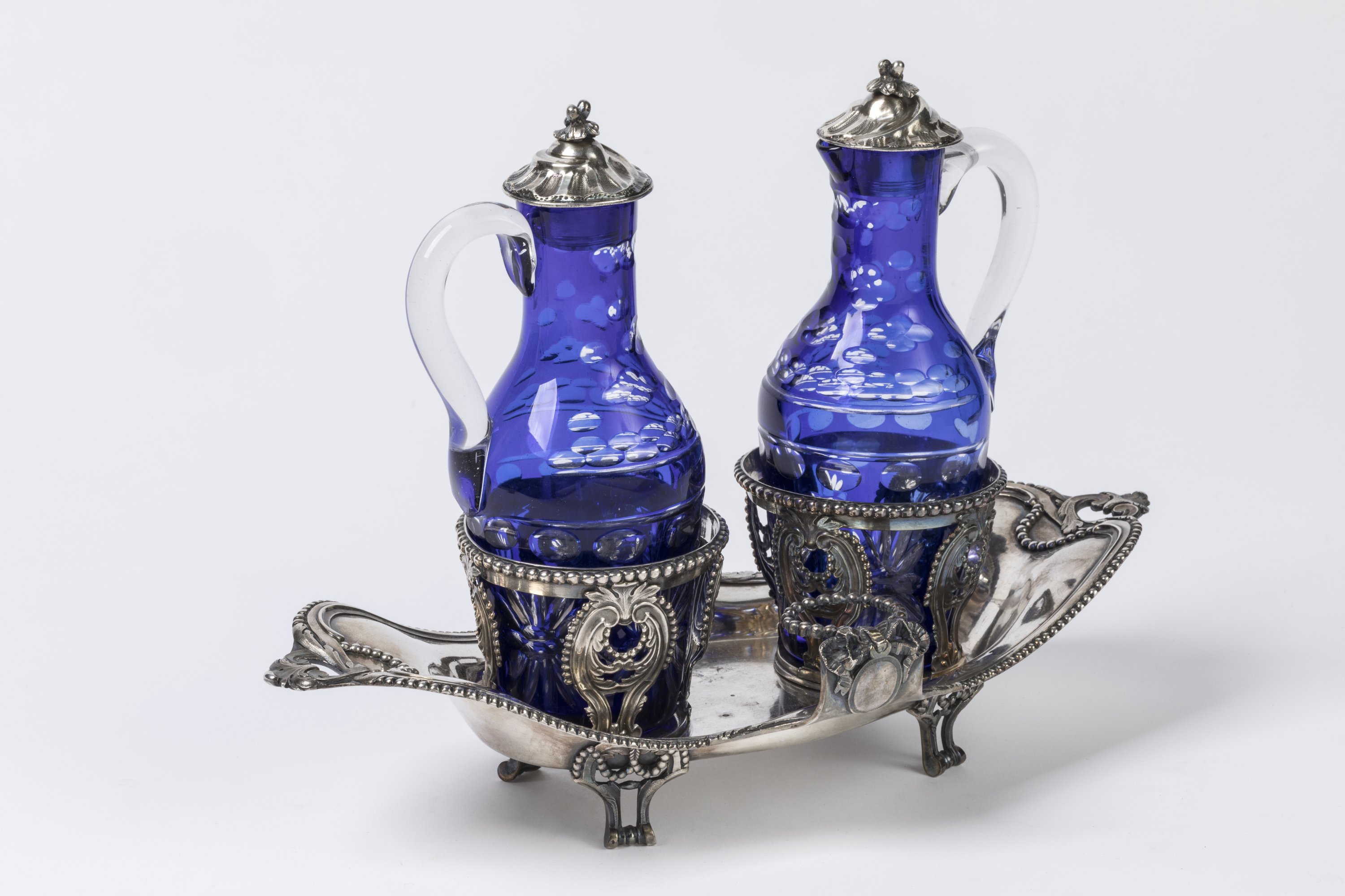 De forme mouvementée, la bordure est soulignée d'un rang de perles et se termine par deux anses à décor de feuilles d'acanthe. Les supports des bouchons sont surmontés de noeuds et médaillons. Il repose sur quatre pieds en enroulements.