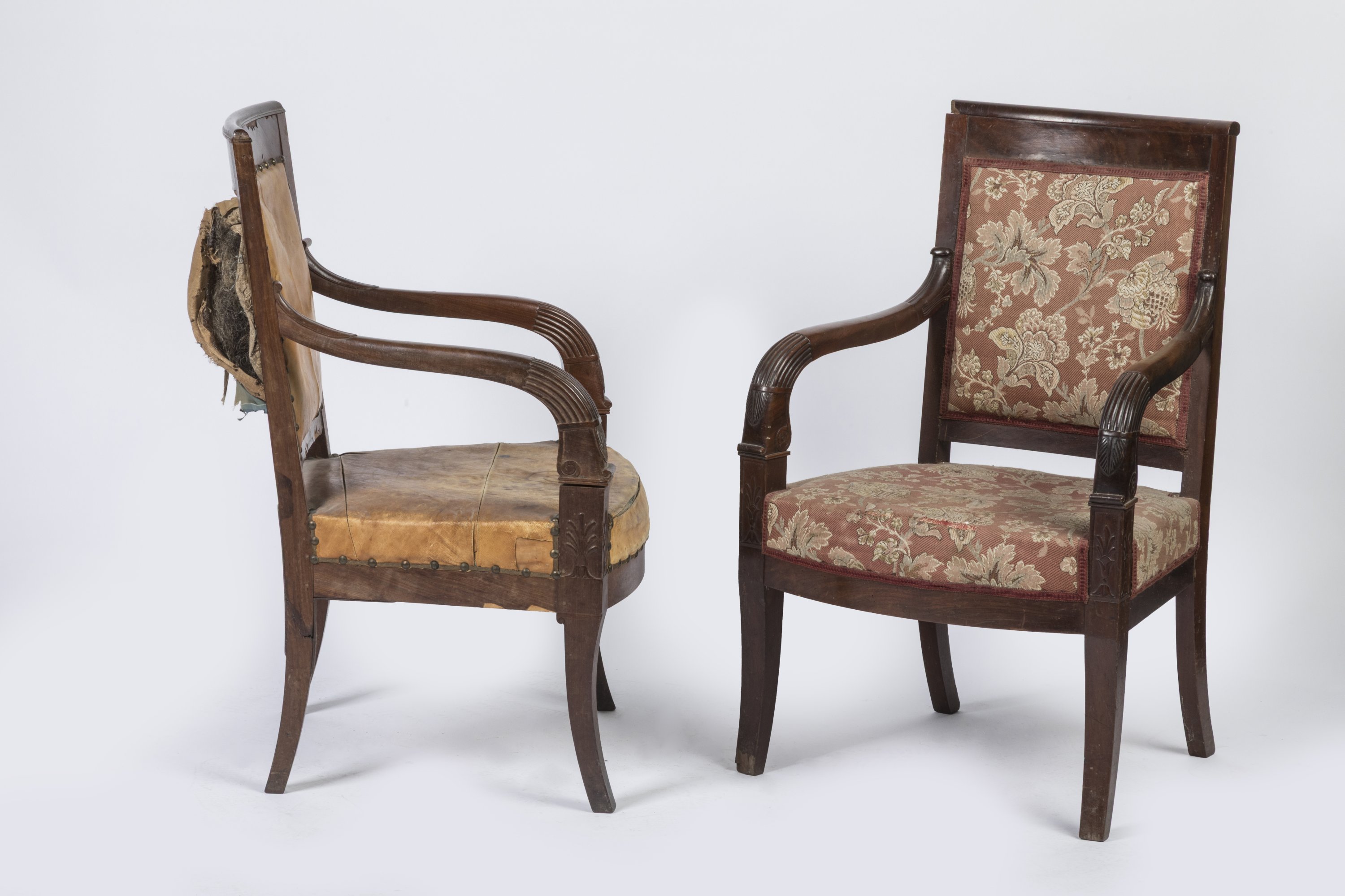 A set of four moulded and carved mahogany armchairs. Empire Period, early 19th century.