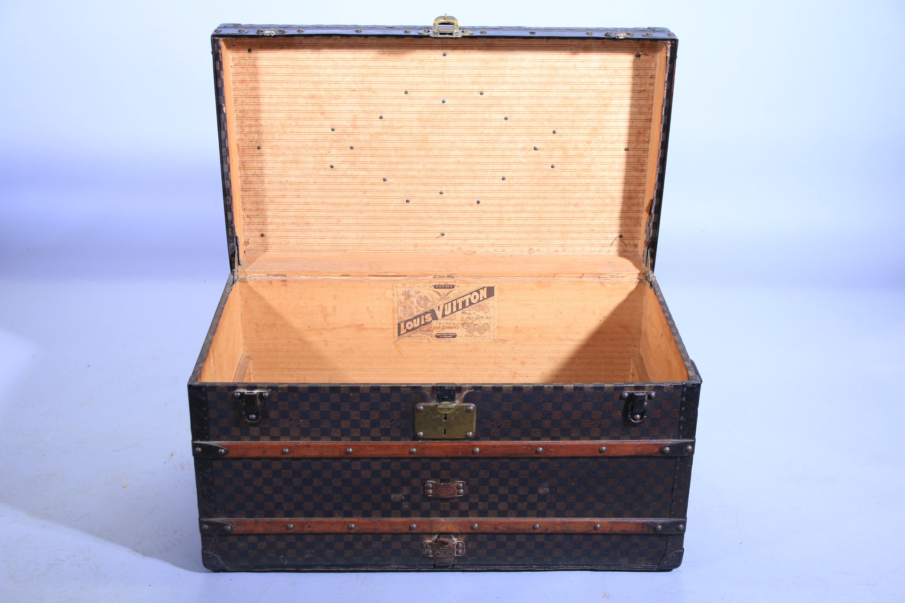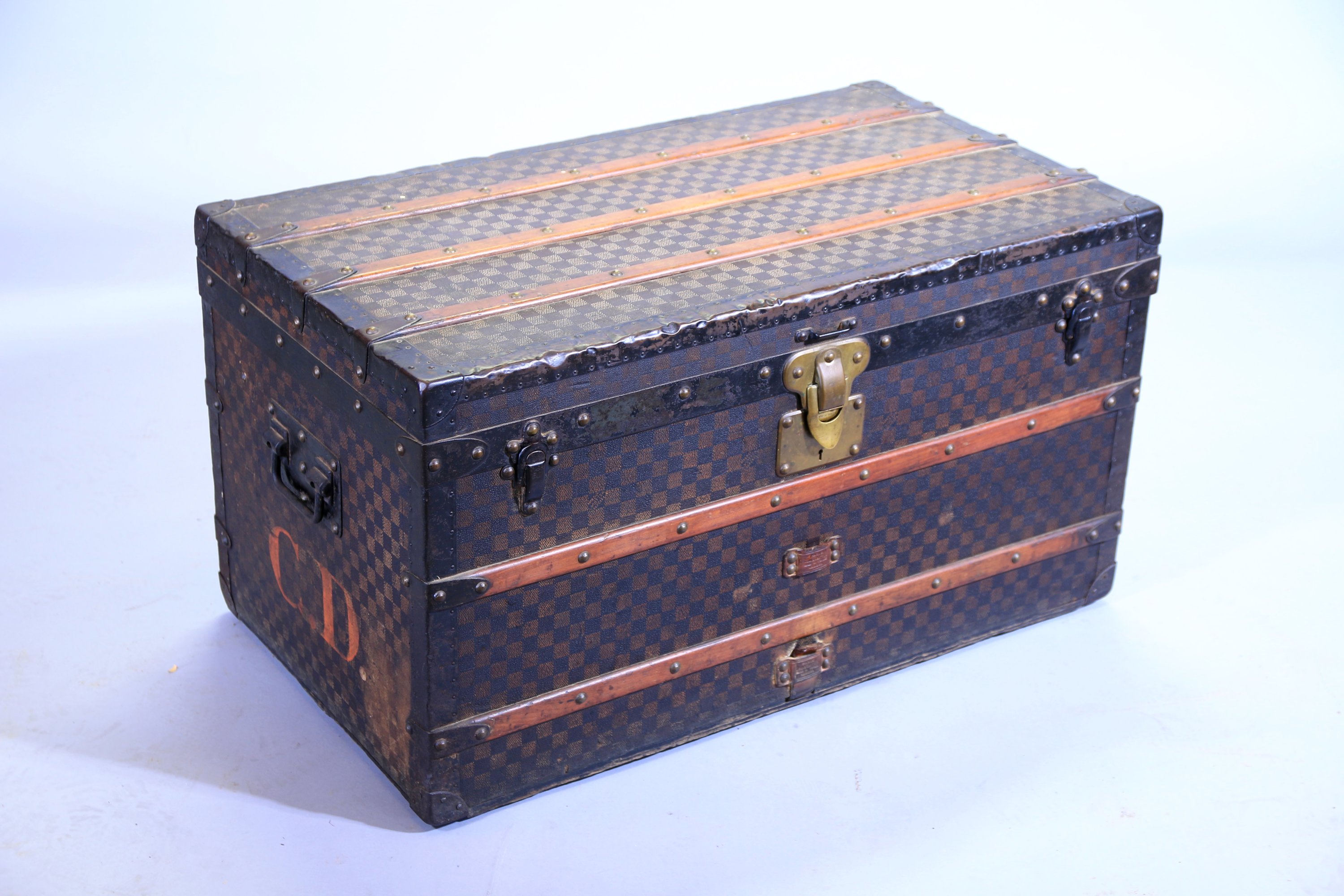 Bois gainé d'une toile enduite dite "damier", renforcé de bois cloutés de laiton et finition "mauresque". Garniture interne à croisillons capitonnés. Etiquette intérieure "Louis Vuitton / 1 rue Scribe 149 , New Bond St London" et numérotée "200535". Poignées latérales en laiton et monogramme "C.D."
