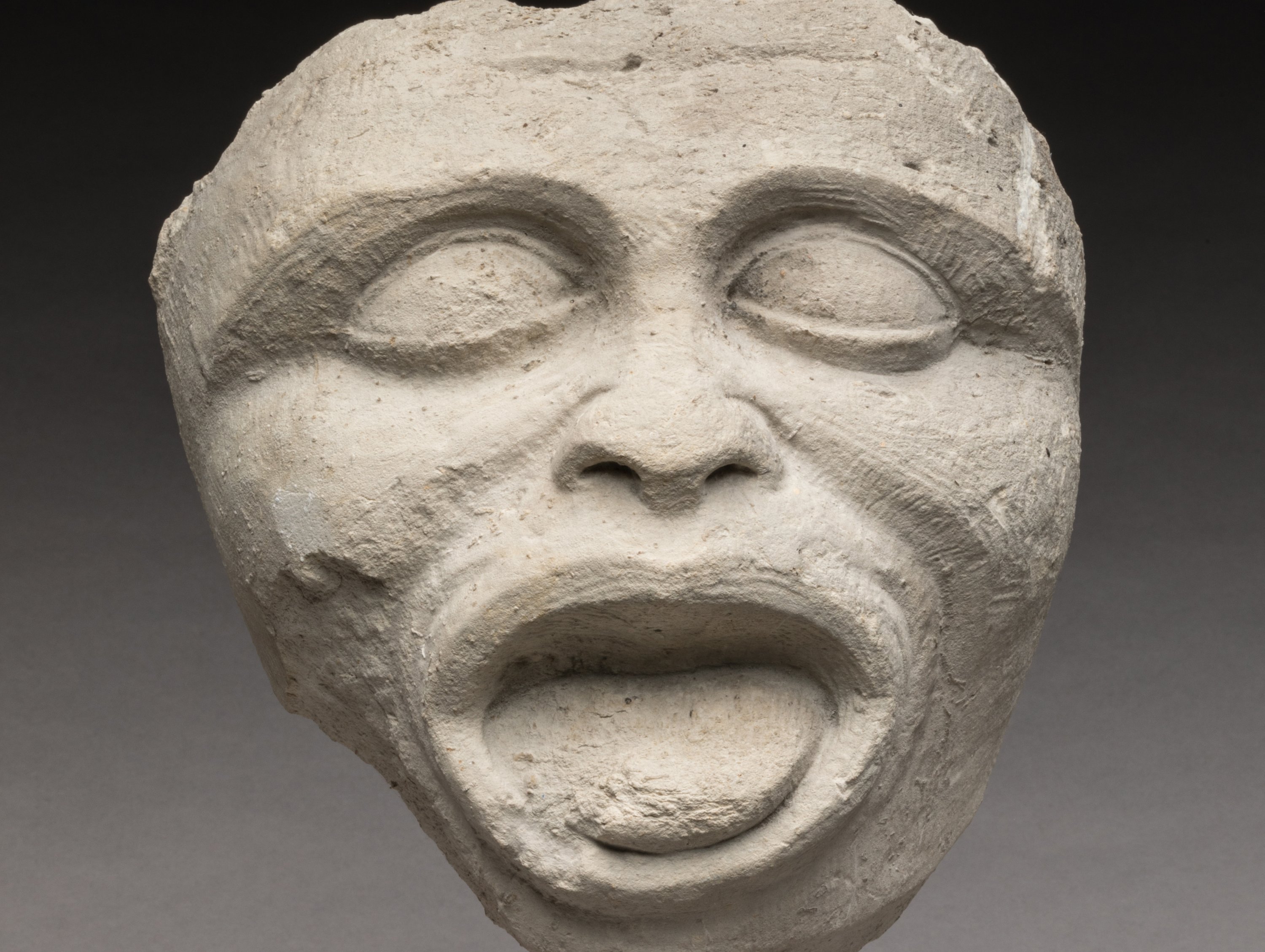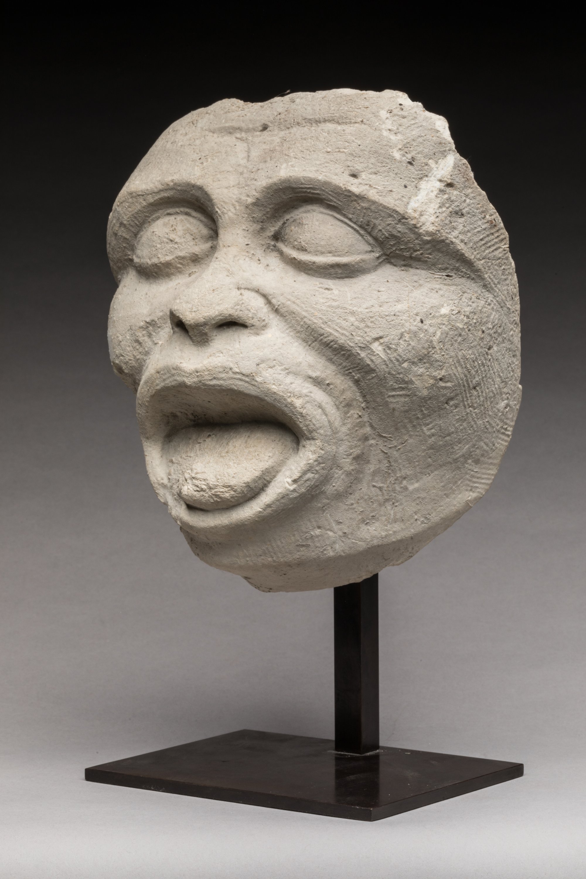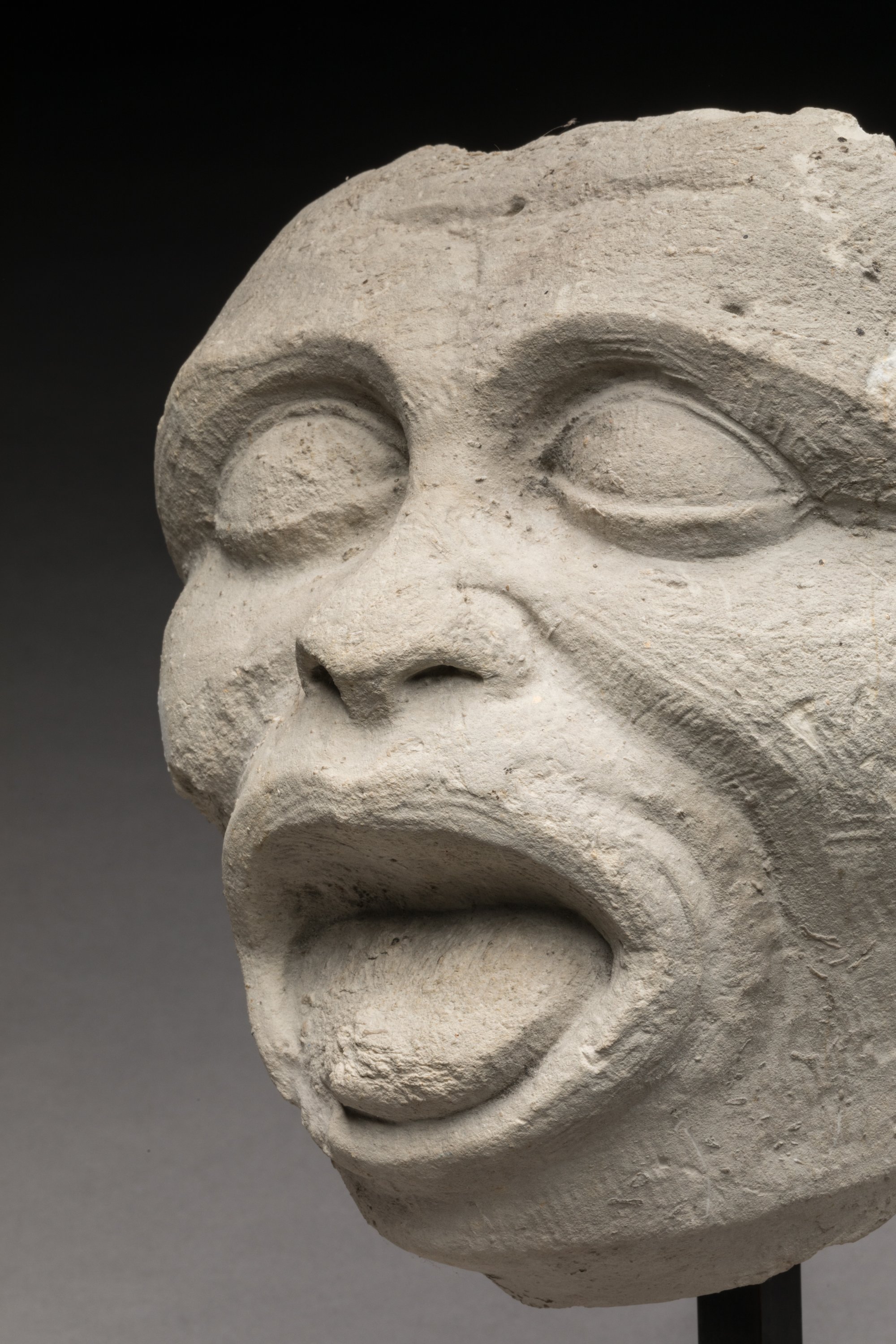 Pierre calcaire sculptée représentant une tête aux yeux proéminents en amande bordés de paupières épaisses, sillons nasaux marqués, nez épaté, bouche ouverte montrant la langue.