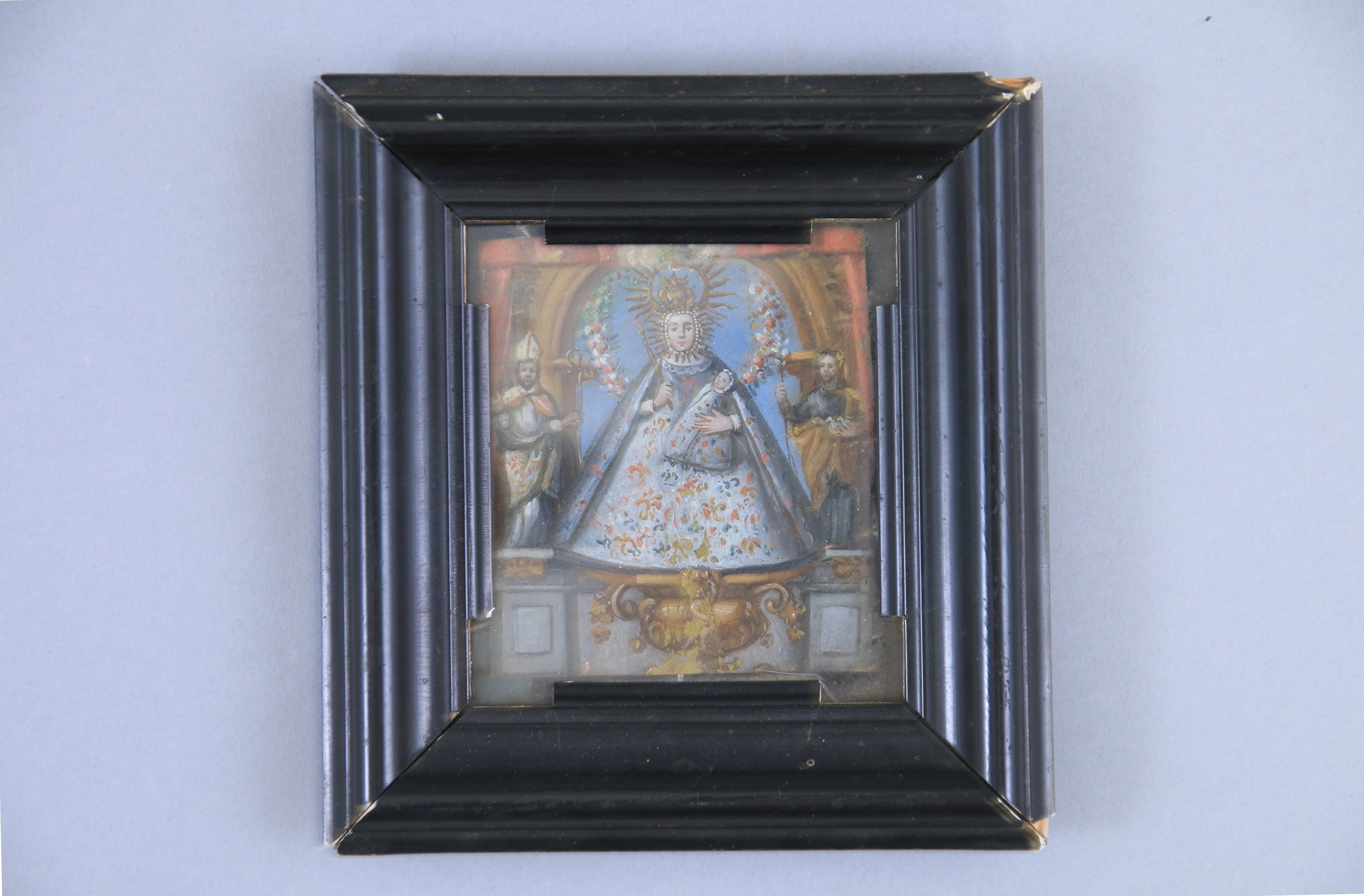 Vierge à l’Enfant entourée d’un saint évêque et de saint Joseph tenant le bâton fleuri et deux colombes