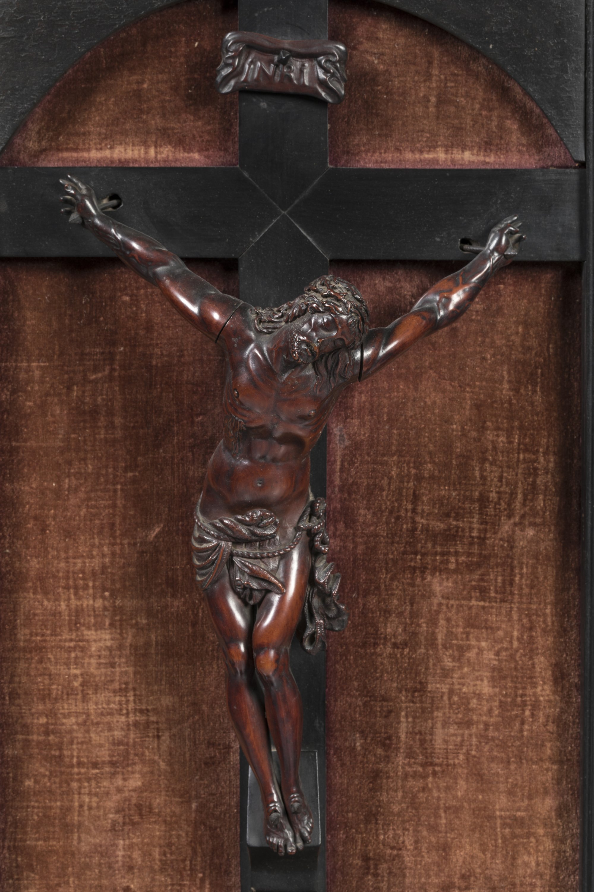A boxwood sculpture depicting a crucifixion scene. Velvet background, ebony frame. Germany, 17th century.