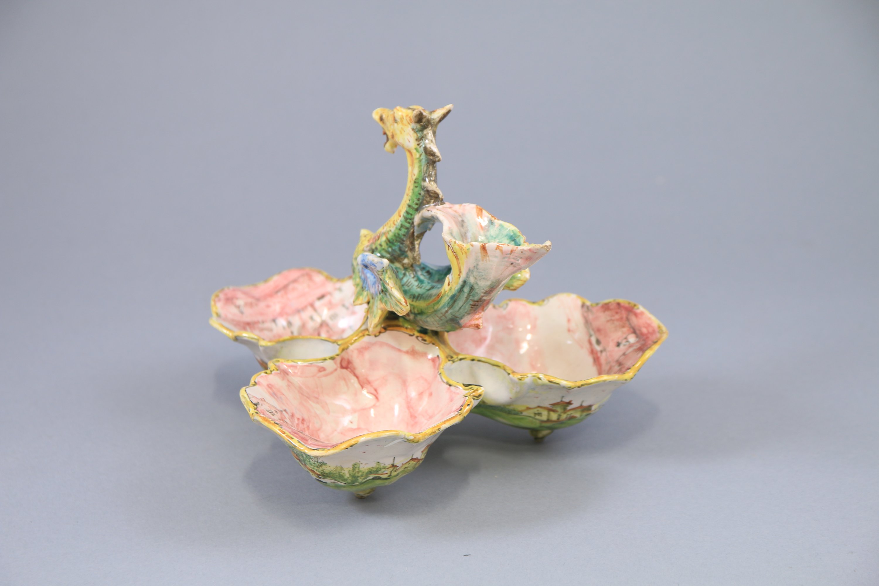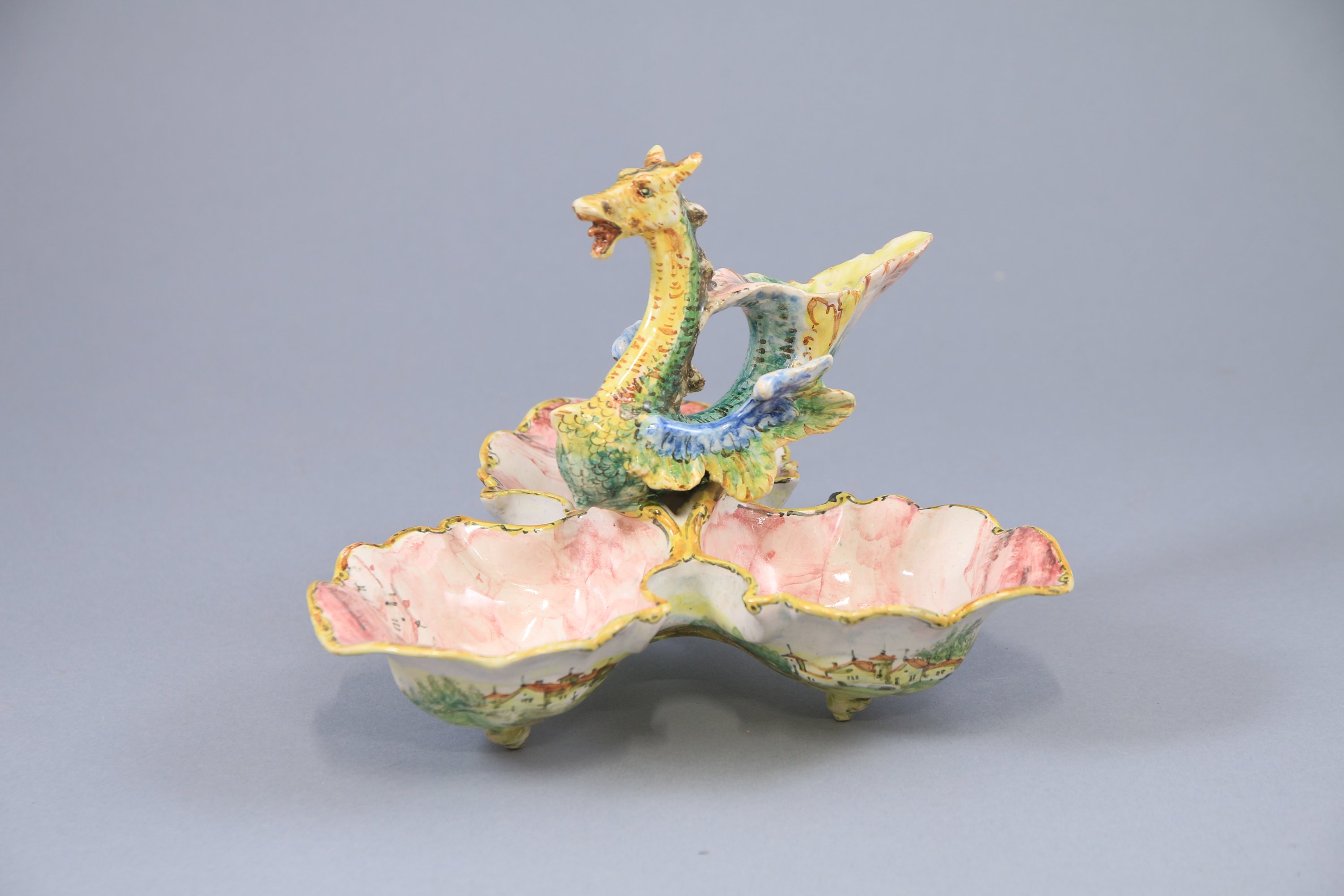 Céramique polychrome. A trois compartiments décorés de personnages et bâtiments surmontés d'un hippocampe.