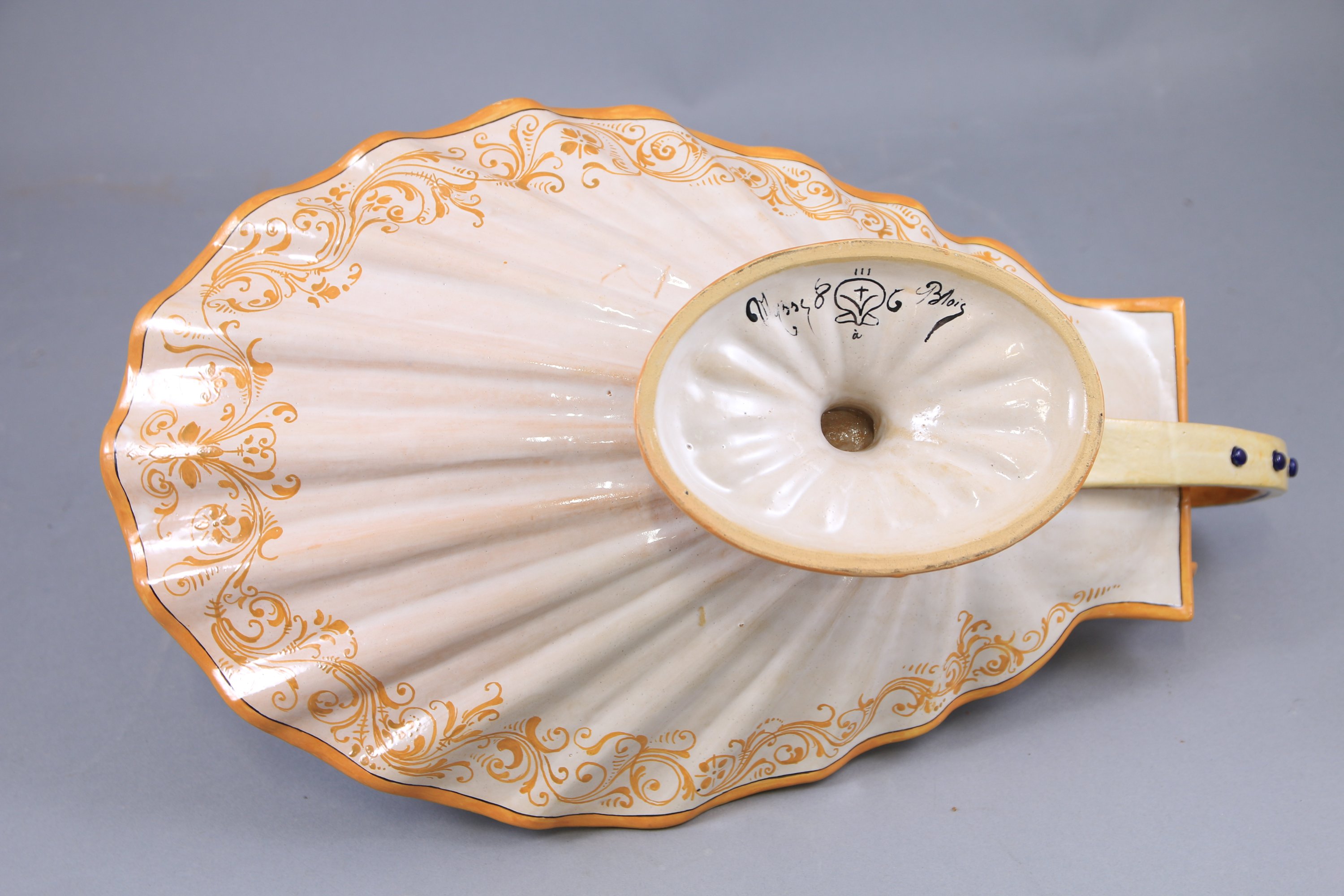 Faïence à décor de rinceaux bleus en alternance avec un motif de fleurs de lys et au cygne de Claude de France. L’anse en forme de chimère, pied oblong.