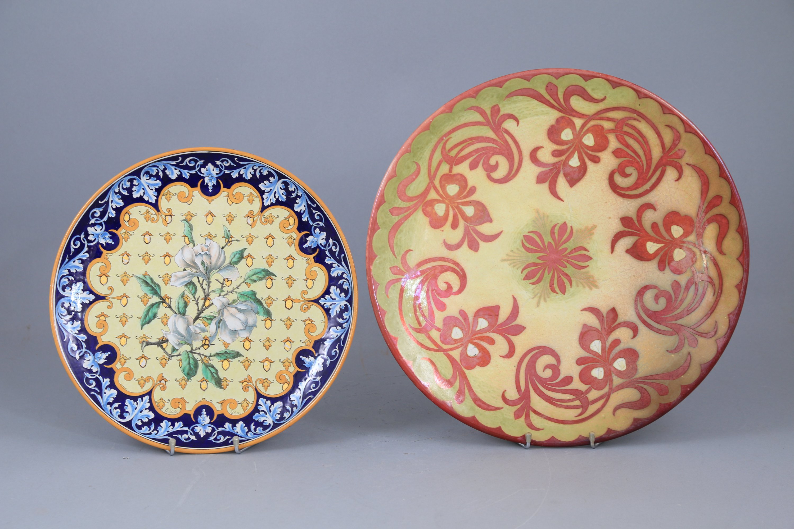 - Plat, 1899. Faïence polychromée à décor de branches de magnolia sur fond de semi. L'entourage de rinceaux. Signé et daté "IX 99". Diam. 30 cm. (usures à la dorure) ;