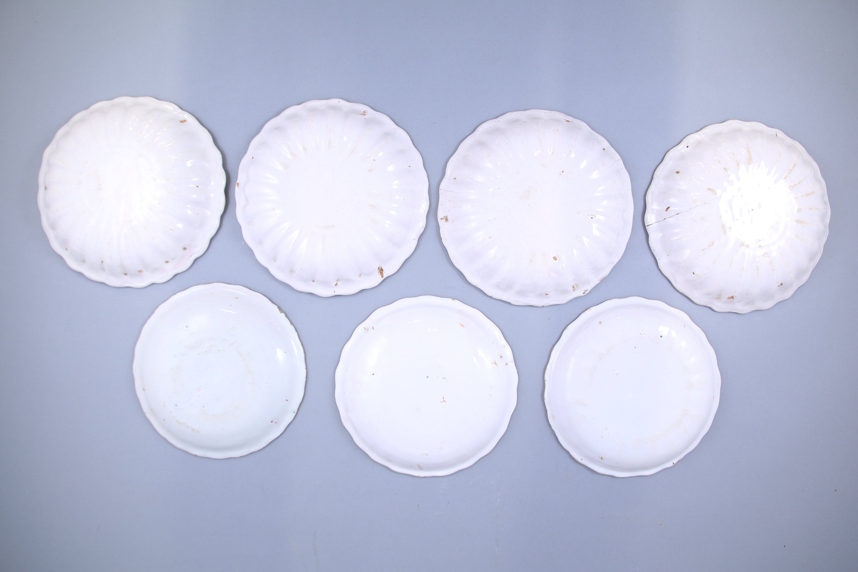 Faïence. A décor de fleurs sur fond blanc, bordure soulignée d'une ligne pourpre et aile godronnée.