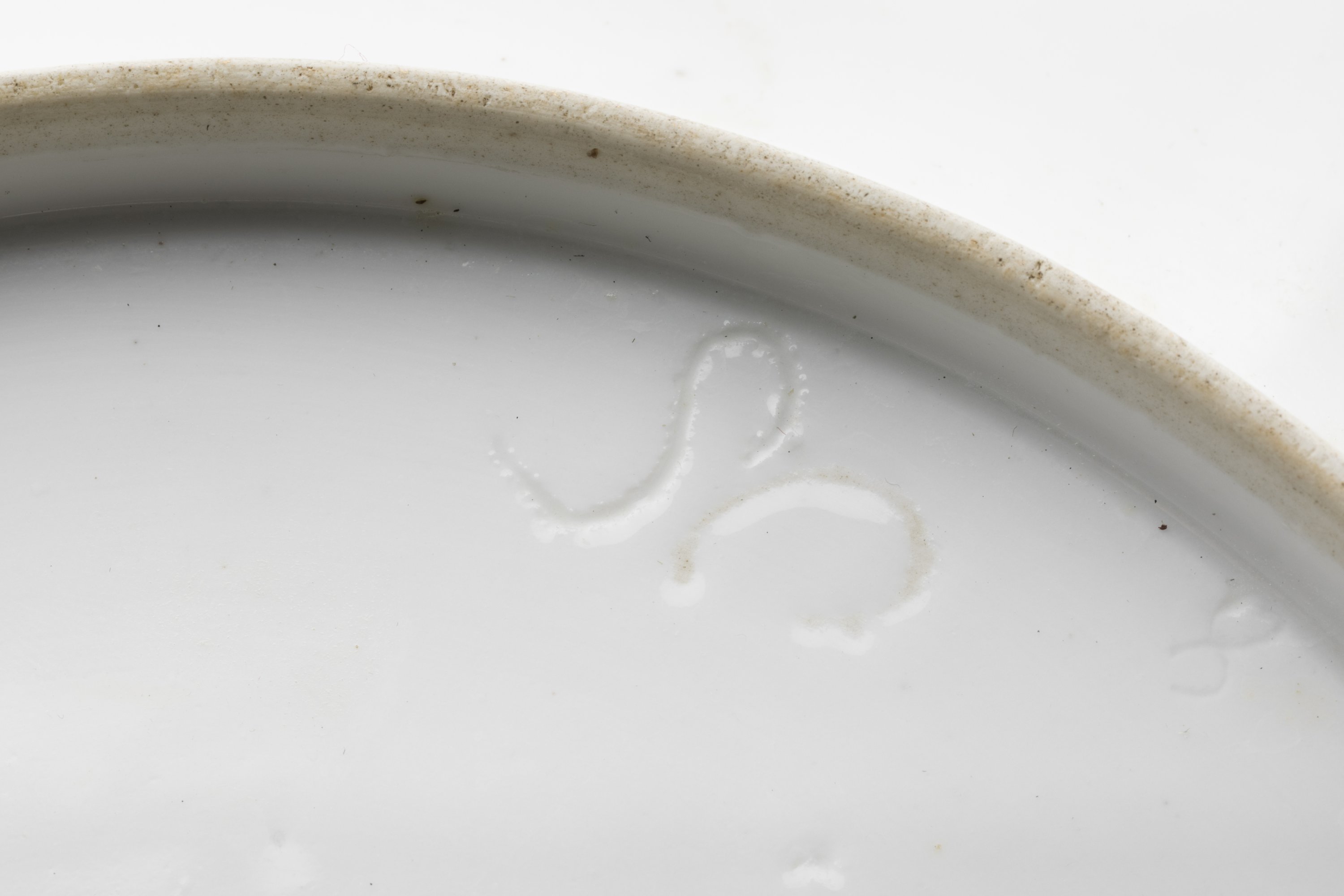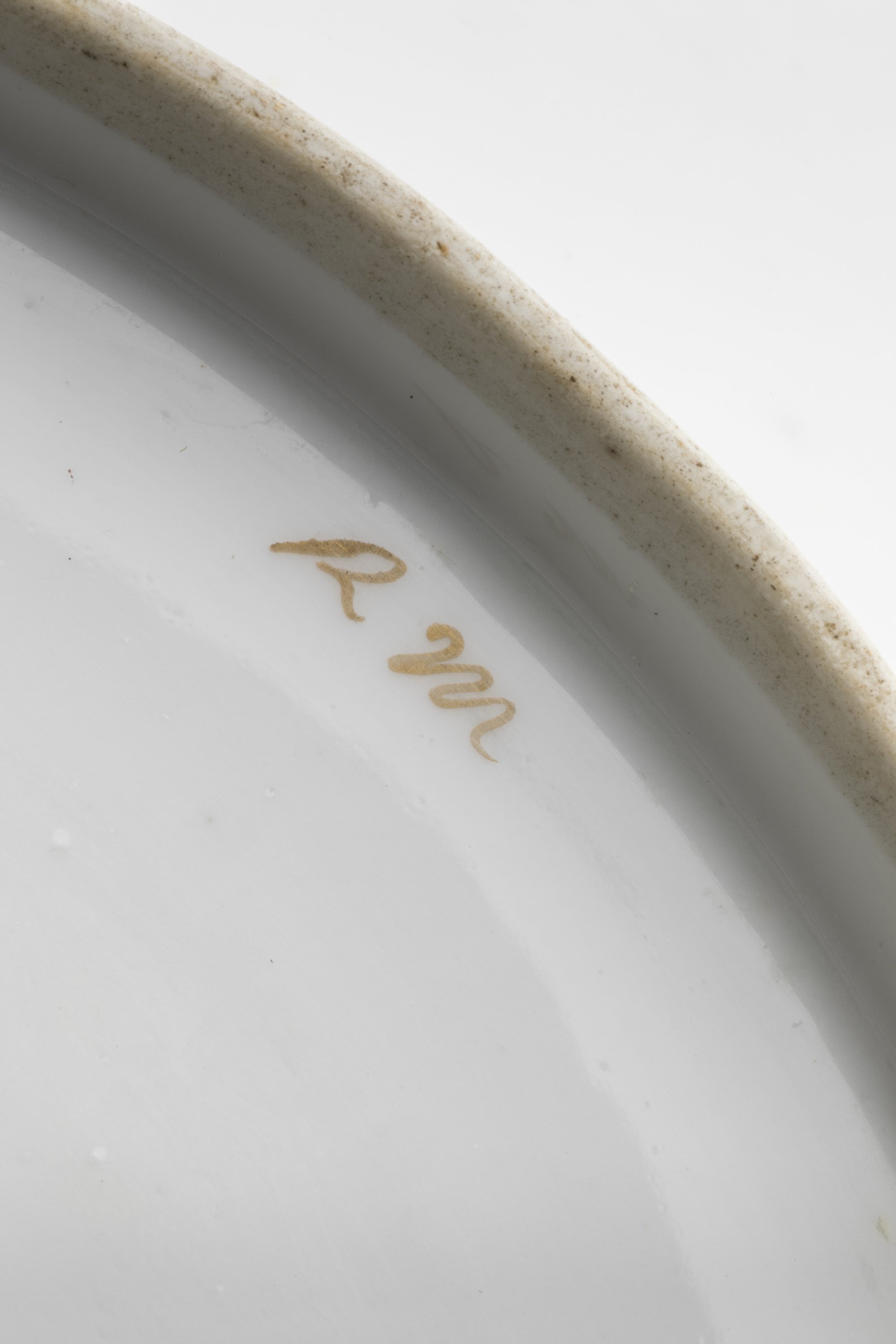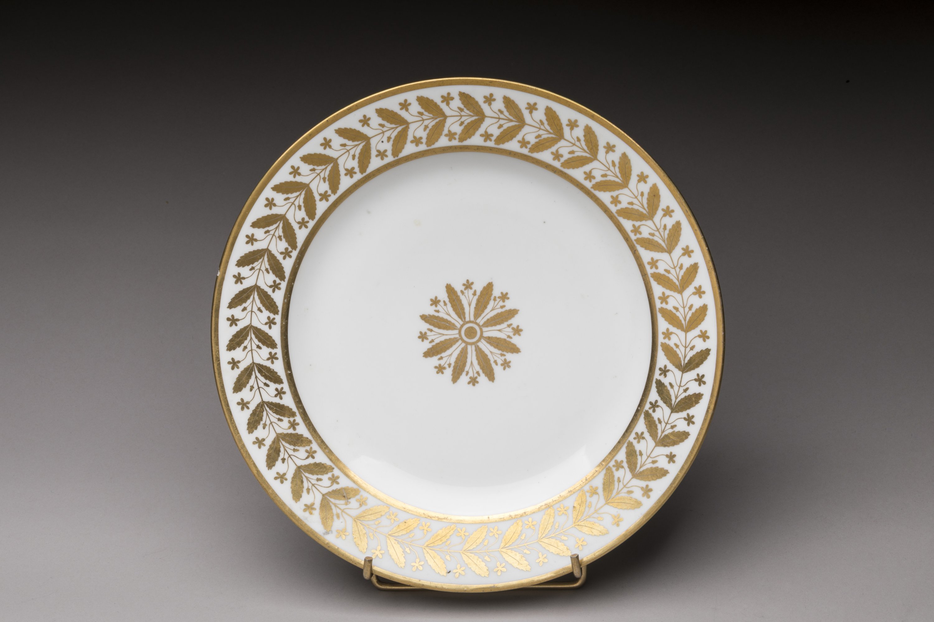 Provenance: Le 19 août 1808, la manufacture de Sèvres livre pour le compte de l’Empereur au Palais de Rambouillet un service décrit frise d’or Capraire entré au magasin de vente de la manufacture le 9 mars 1808 et le 4 mai 1808 (Arch. Sèvres, Vu1 f° 56, et f° 58v et Vbb1, f° 65). Il se composait d’un service d’entrée comportant 40 assiettes à soupe, 8 beurriers navette, 6 saladiers à pied, 16 pots à jus et 4 melonnières. Le service de dessert comportait 144 assiettes plates à 9 francs chaque, 8 compotiers coupes, 2 sucriers et 4 glacières forme vase. Une autre partie du service est achetée par Martial Daru le 7 mars 1808 pour son usage personnel (Vz1, f° 226). Les marques effacées sous nos assiettes désignent plus certainement le service de l’Empereur à Rambouillet. A la première Restauration, entre avril 1814 et mars 1815, un certain nombre de porcelaines de Sèvres présentes dans les résidences impériales, notamment les assiettes du service des Quartiers Généraux conservées aux Tuileries, sont envoyées à la manufacture de Sèvres afin de faire meuler la marque impériale de la manufacture de Sèvres et parfois la faire recouvrir de deux grands L entrelacés gravés et peints en noir.