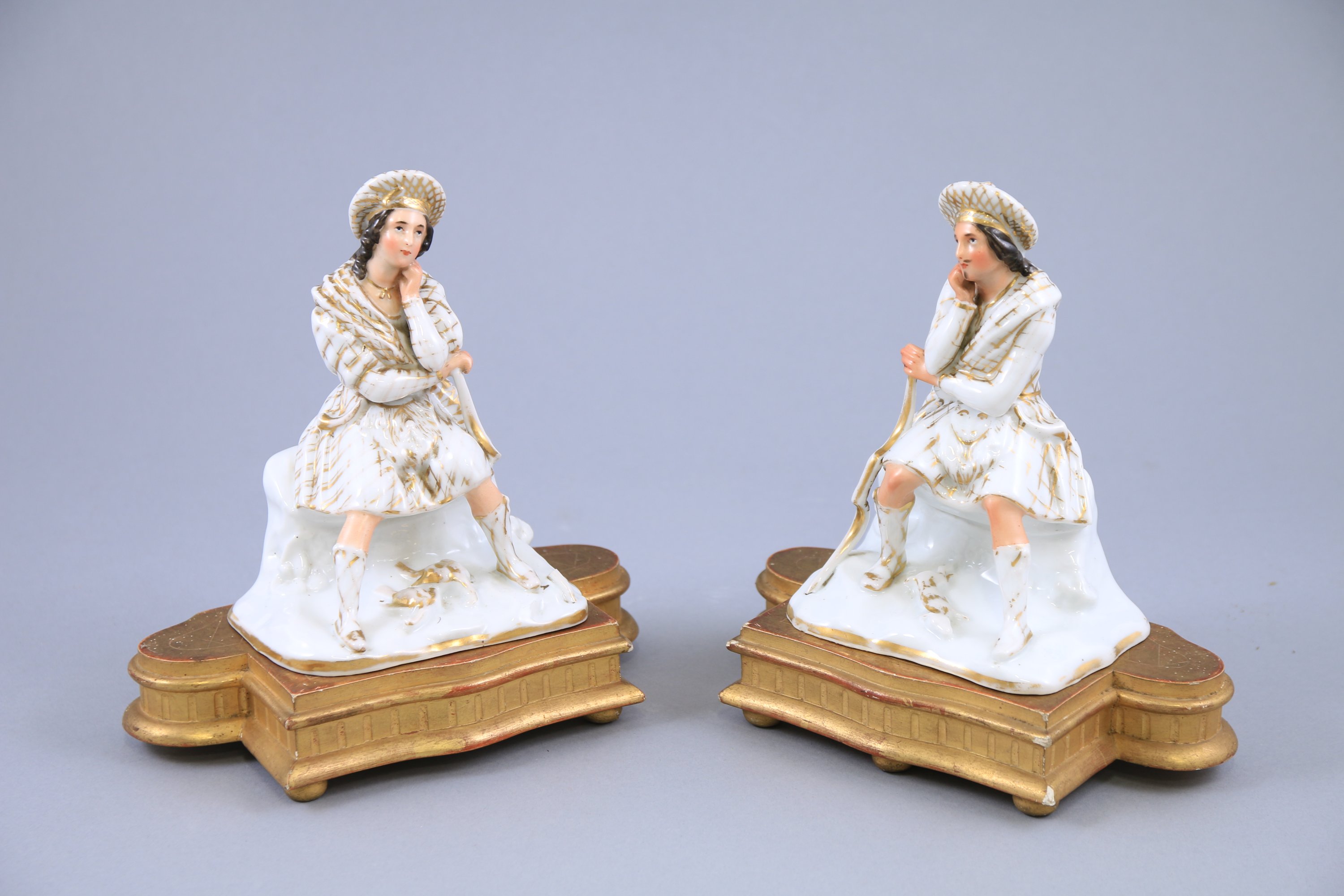 Paire de flacons à décor polychrome, blanc et or. L'air pensifs appuyés sur leurs arcs, aux pieds de l'un se trouve deux oiseaux et de l'autre un lapin.