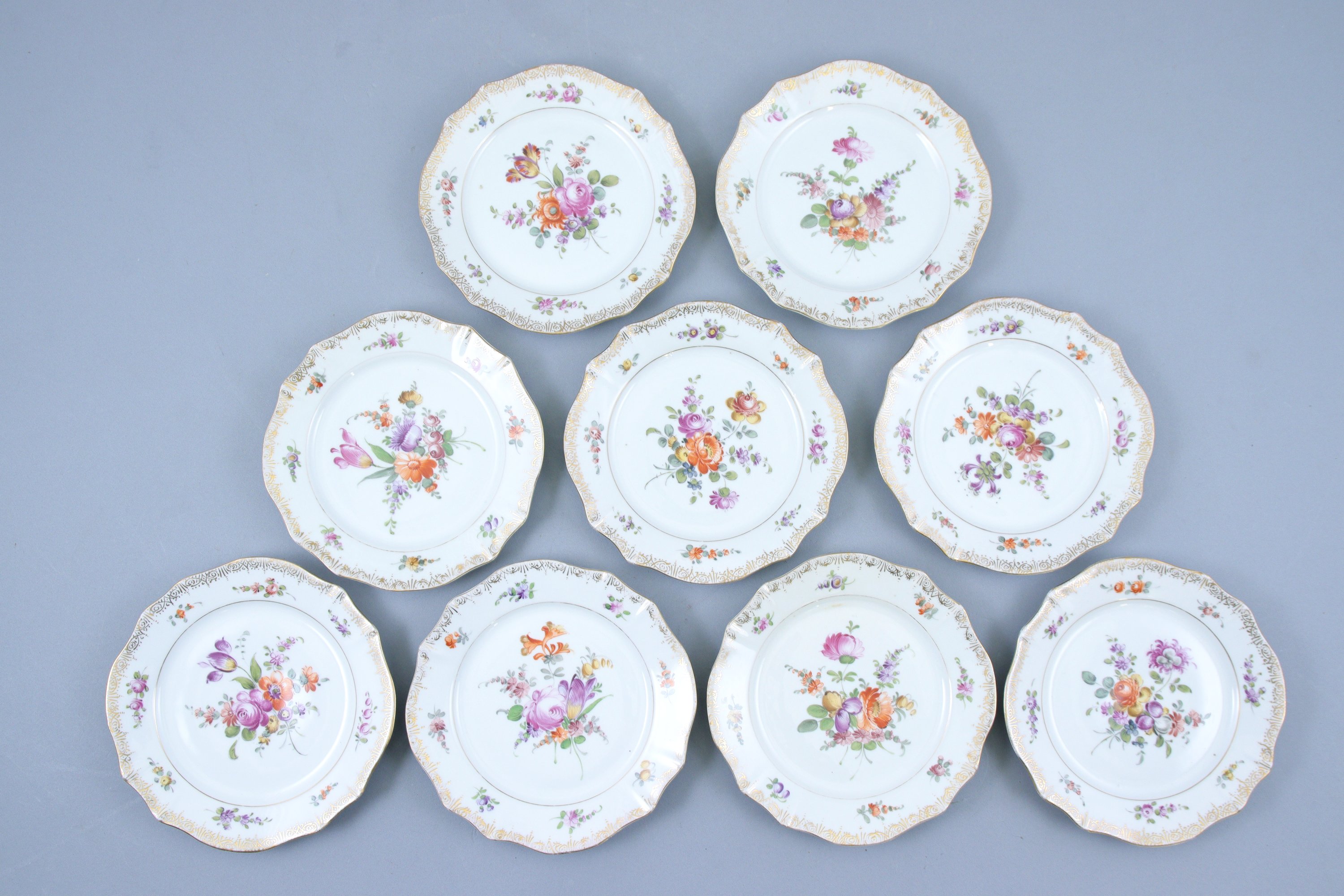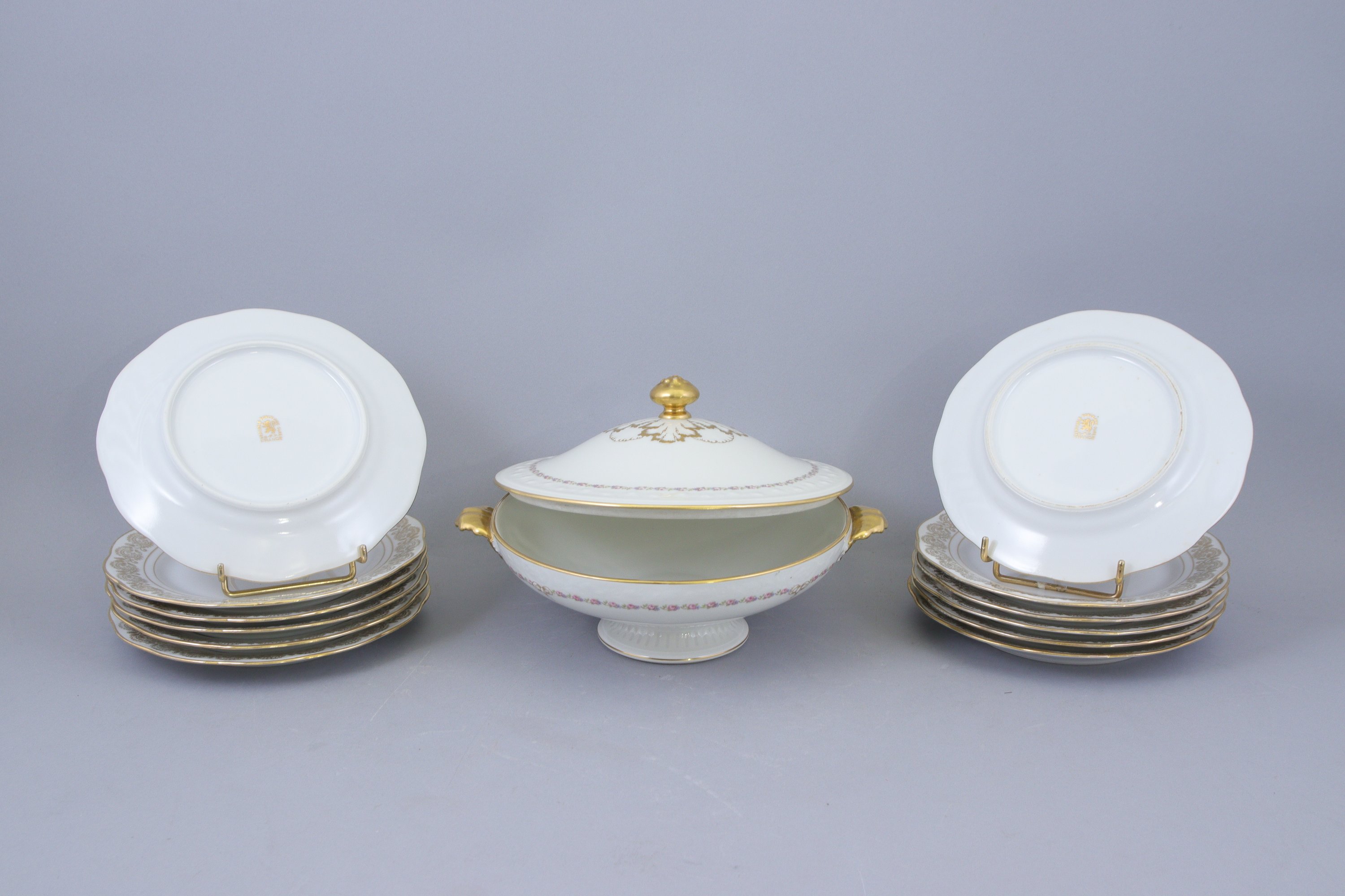 - 12 Assiettes à dessert en porcelaine blanche et dorée et argentée à décor de rinceaux et filets. Cachet au revers.