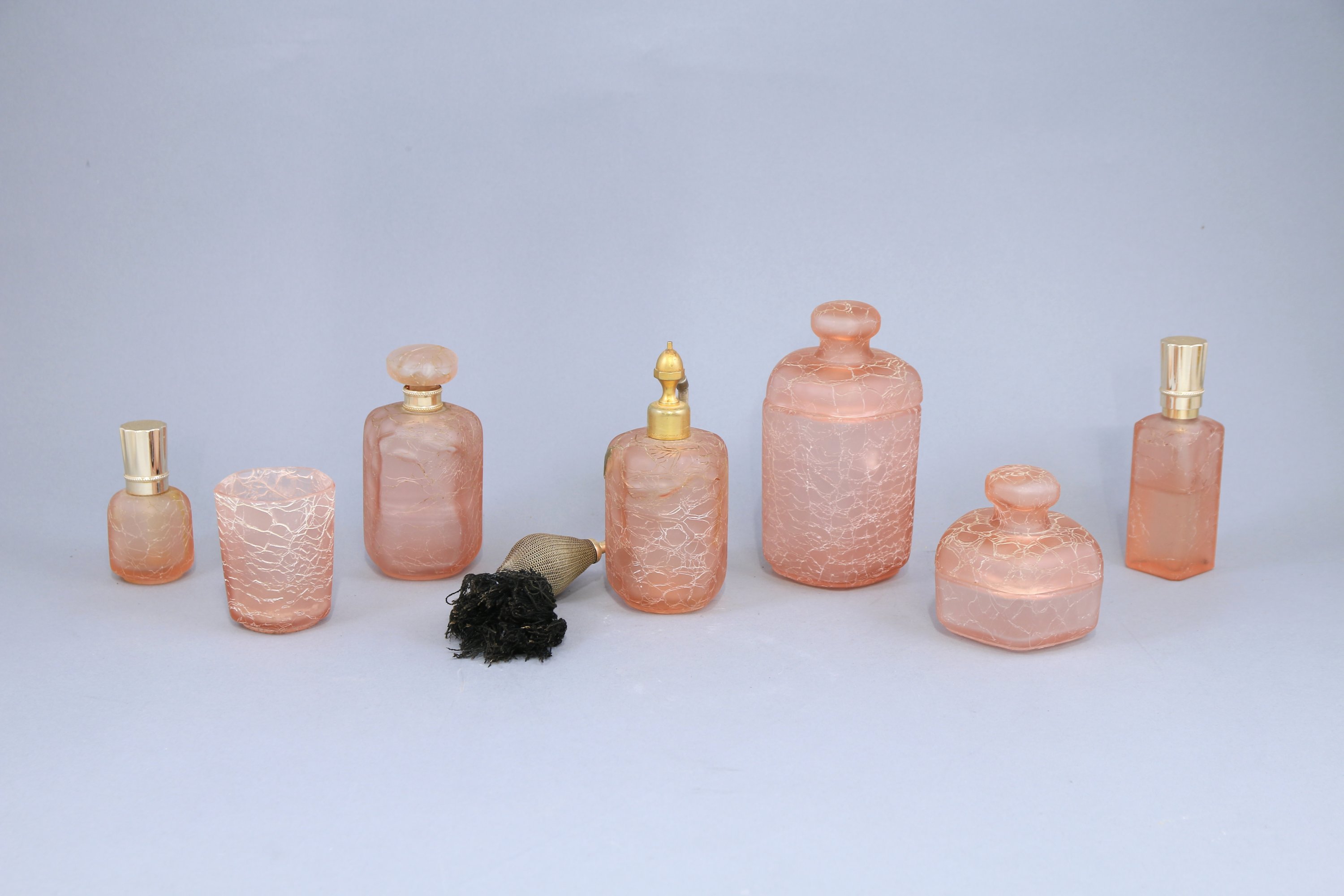 - un en verre givré rose composé de trois flacons, trois vaporisateurs (un de la marque Marcel Franck), une boite et un gobelet. Haut. de 10,5 à 18,5 cm.