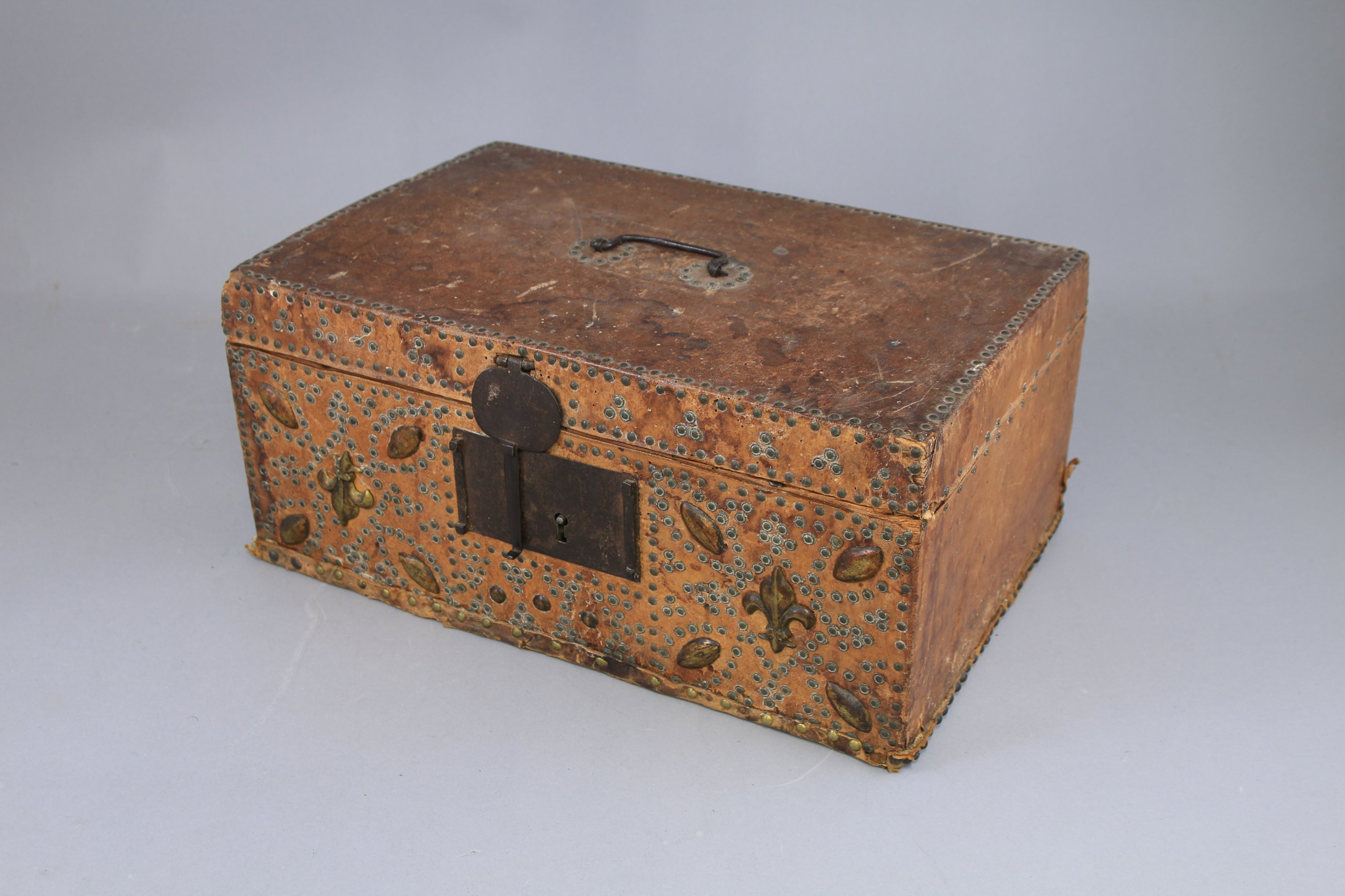 Ame en bois recouvert de cuir à décor clouté en façade dont deux figurant des fleurs de lys, poignée sommitale et moraillon en fer forgé.