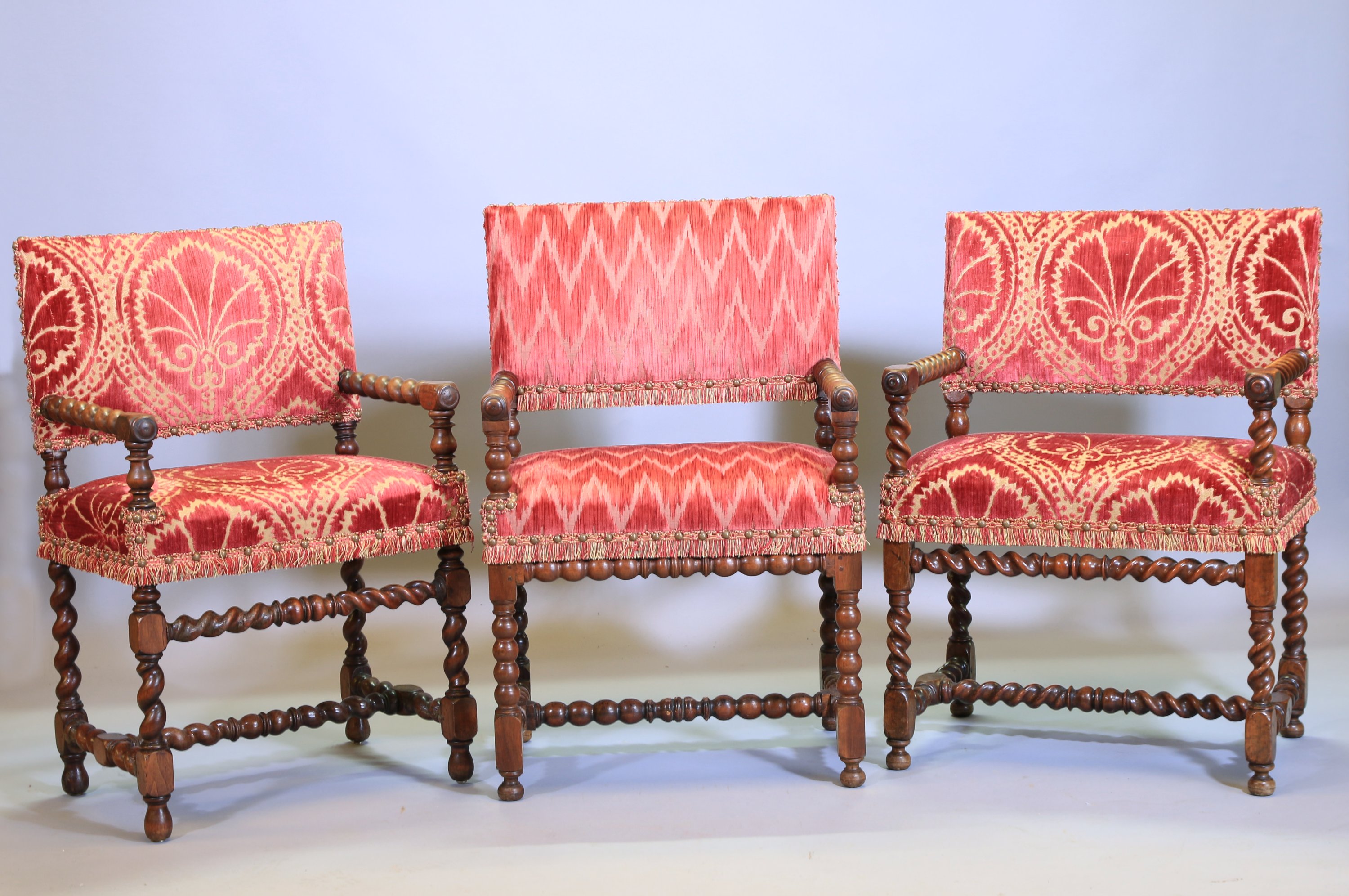 Noyer mouluré et sculpté. Accotoirs et pieds torsadés pour deux et en chapelet pour le dernier reliés par une entretoise en H.