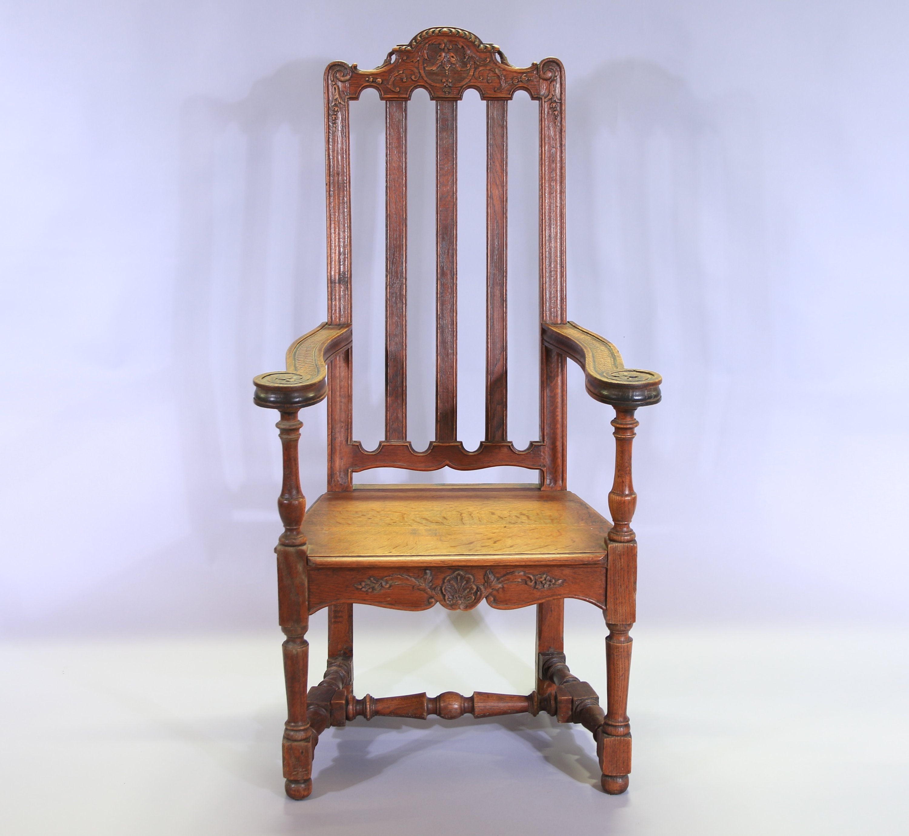 Chêne mouluré et sculpté, le dossier ajouré est décoré de frises et de motifs végétaux. Les accotoirs renversés finissent en volutes décorées en leur centre de fleurs. Assise trapezoïdale ornée en ceinture de motifs végétaux et floraux. L'ensemble repose sur deux pieds antérieurs de forme balustre et deux pieds arrières droits rejoints par une entretoise.