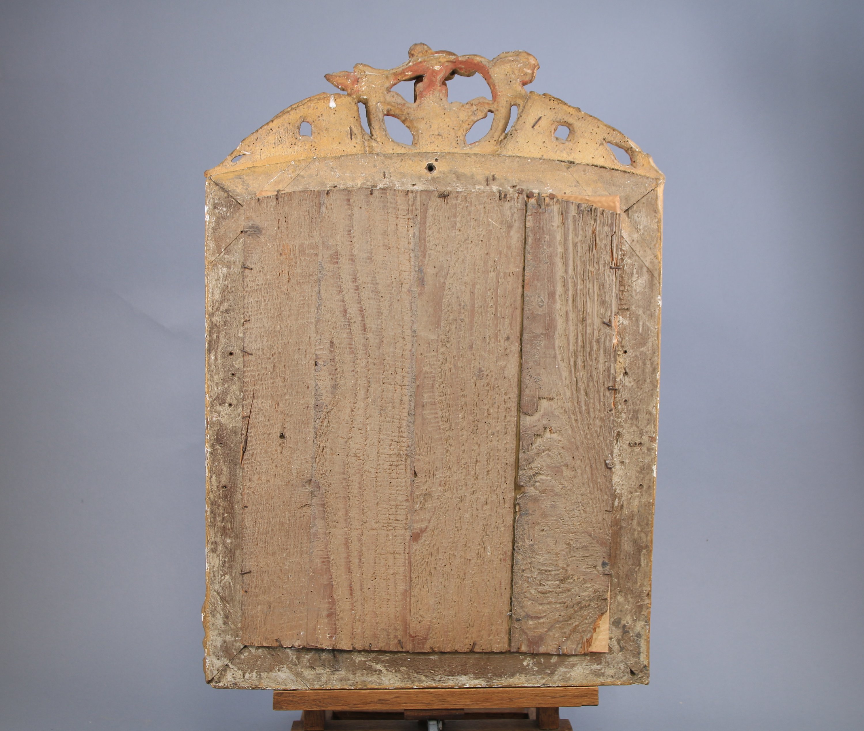 Bois sculpté et redoré. Le fronton à décor d’un bouquet dans des des rinceaux ajourés surmontant un cadre baguette "à la Berain".