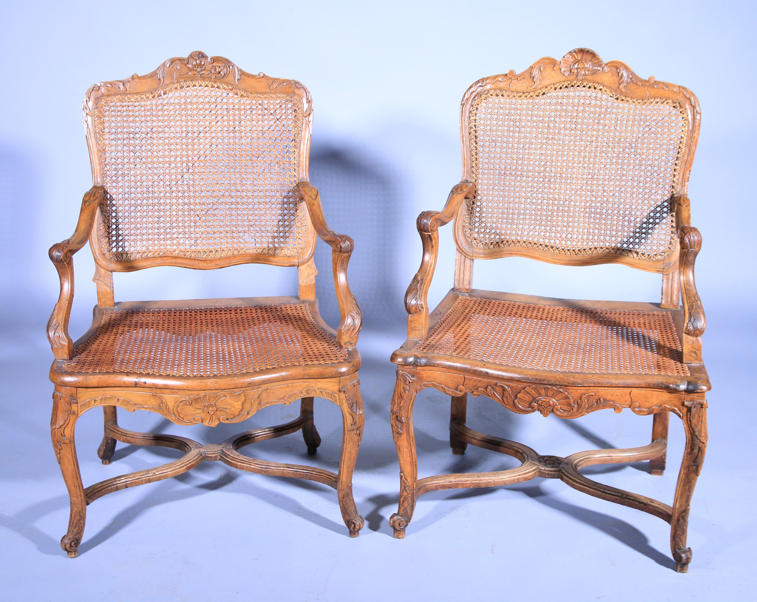 Pouvant former fausse paire les assises et les dossiers cannés. L'amortissement du dossier est surmonté pour l'un d'une coquille et de feuilles d'acanthes et pour l'autre de fleurs. Les accotoirs en retrait et mouvementés sont ornés de coquilles et d'acanthes, la ceinture chantournée est décorée de fleurs et de coquilles. Ils reposent sur quatre pieds galbés reliés par une entretoise en X centré d'une fleurette pour l'un.