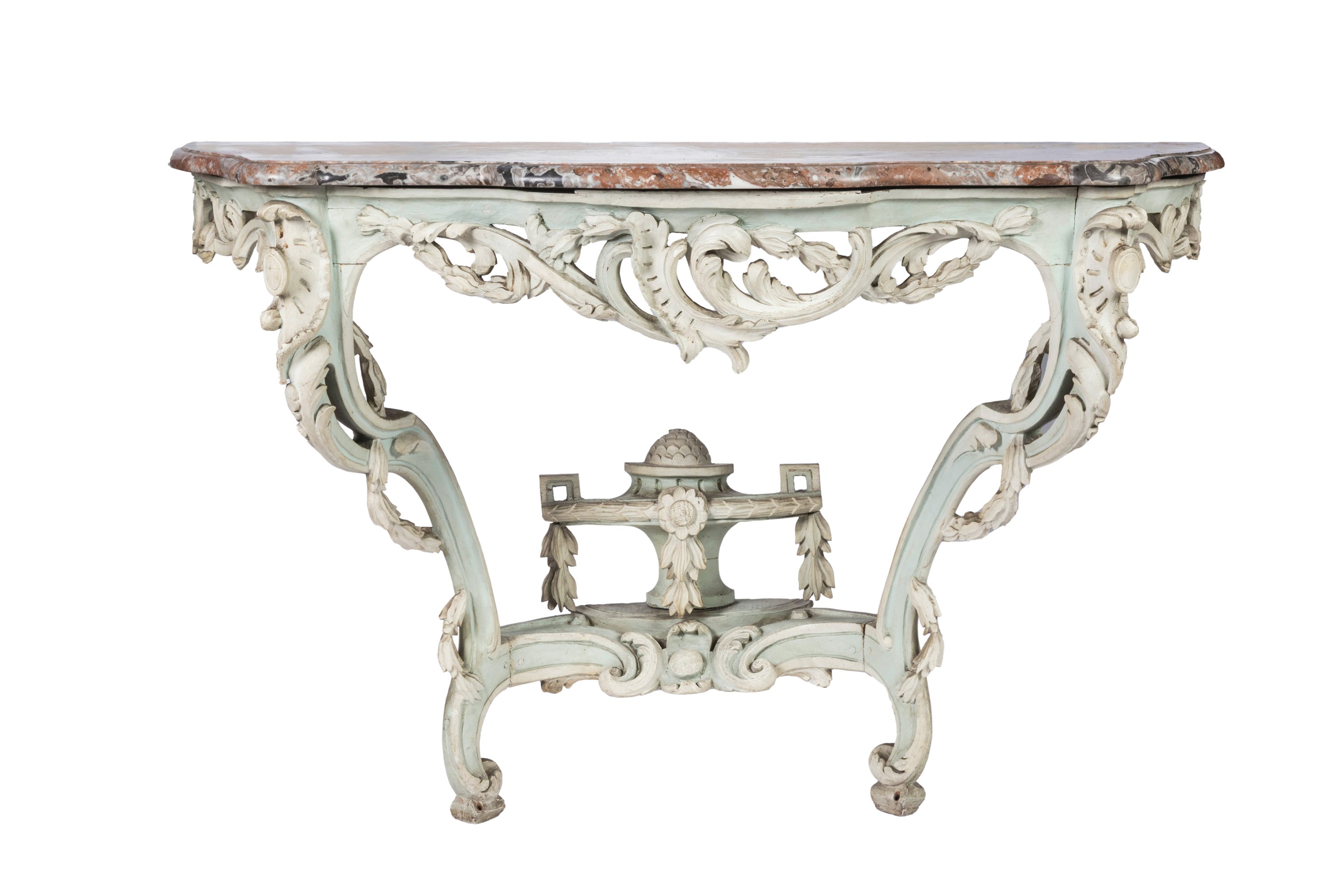Nos deux consoles formant fausse paire s'inscrivent dans la production du règne de Louis XV et notamment des dessins de l'architecte Pierre Contant d'Ivry. Les enroulements de guirlande sont à rapprocher d’un dessin pour une console de la Salle de Jeu du Palais Royal (in Bill Pallot, "L'art du siège au XVIIIe siècle en France", Paris, Gismondi, 1987, p. 156). Ce type de console à montants ajouré se retrouve parmi les plus importantes collections, à l’instar de celle du financier Jean Pâris de Montmartel comme en témoigne son portrait dessiné par Cochin fils (ibid., reproduit p. 256). Nicolas Heurtault livre quant à lui une console de lambris à Charles-Jean-Baptiste du Tillet vers 1758 pour le château de Villarceaux, où l’on observe « une puissante symétrie ».