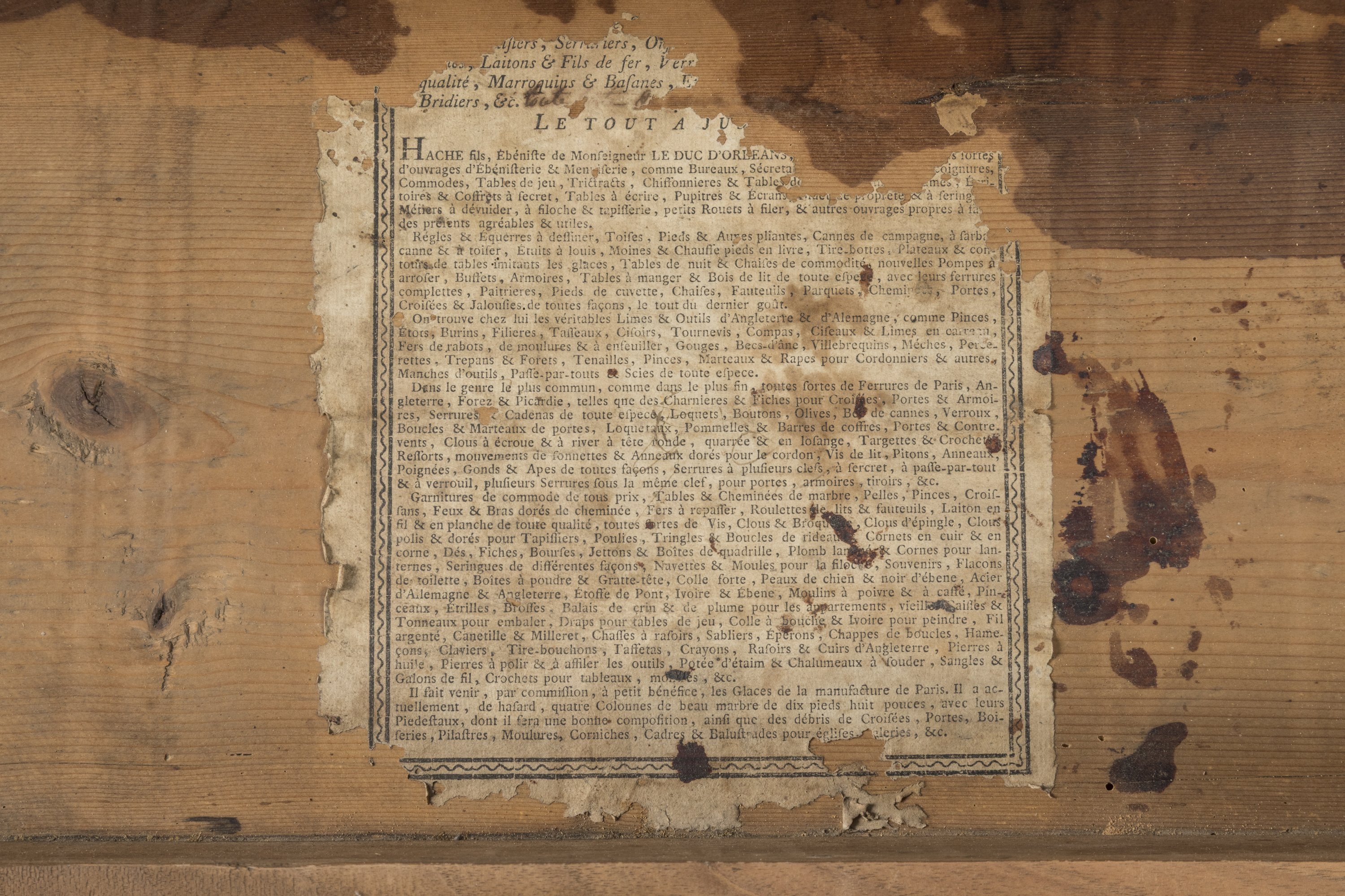 A l'intérieur du tiroir, partie de l'étiquette de type IX (1774-1777) ou X (1776-1777).