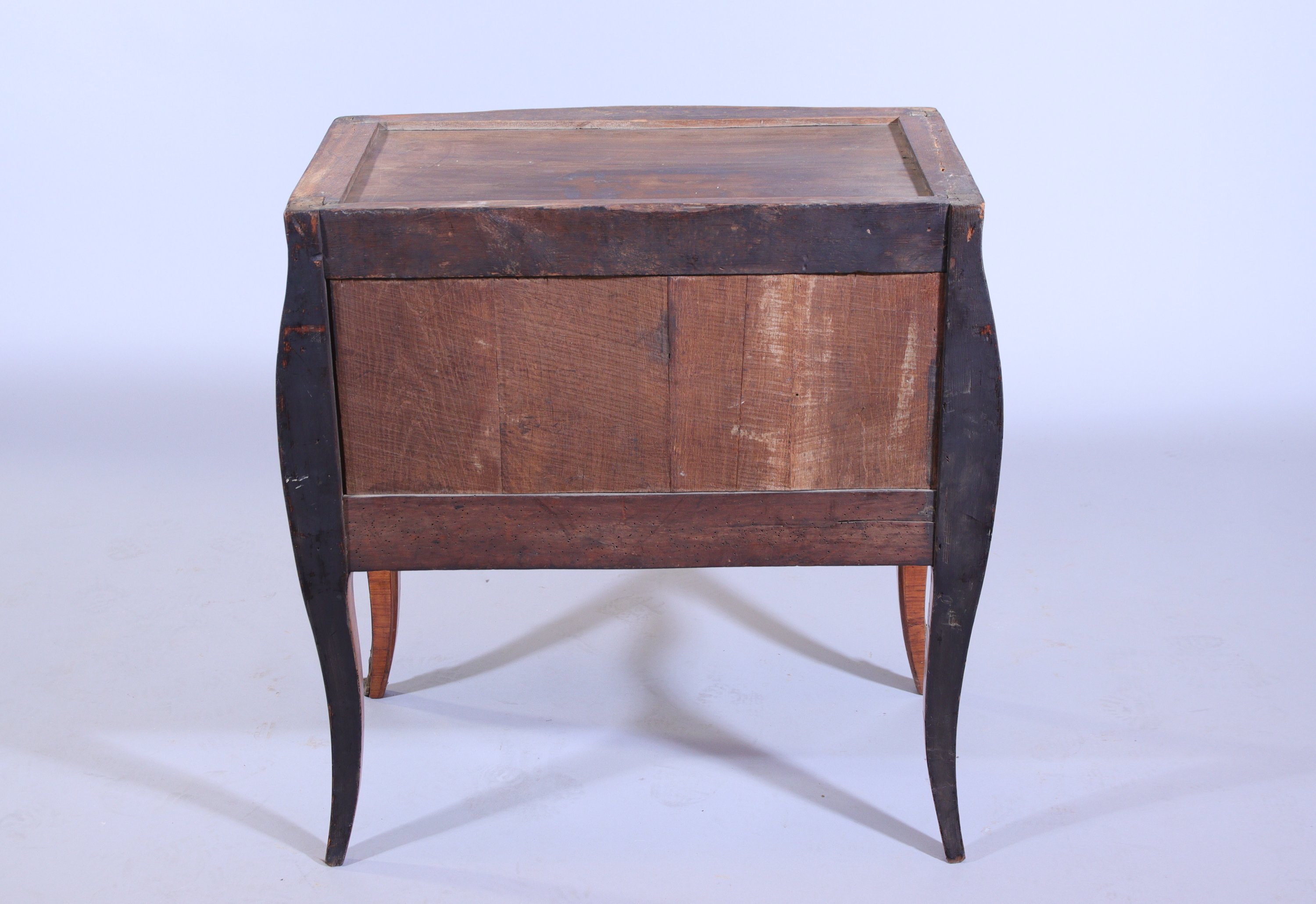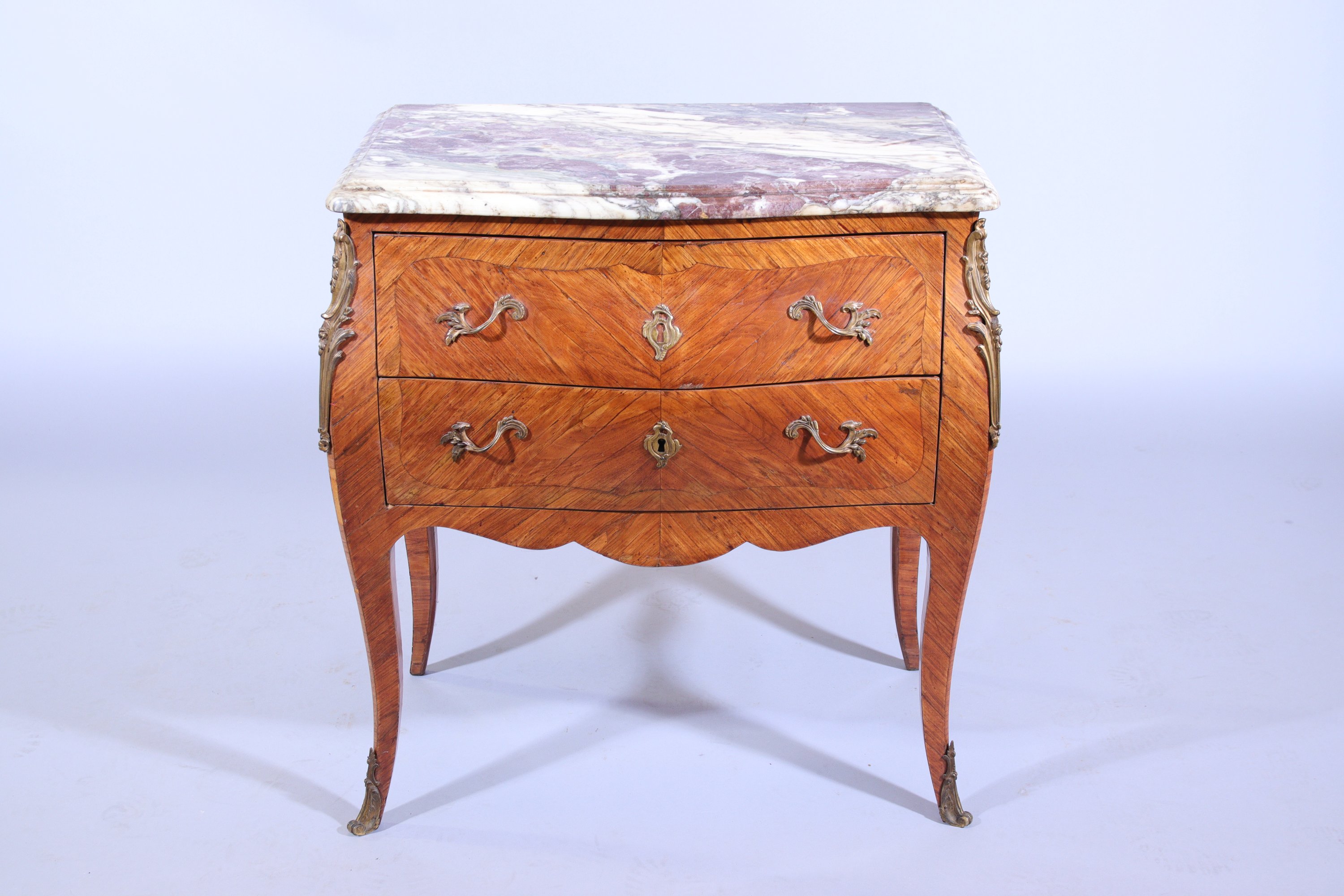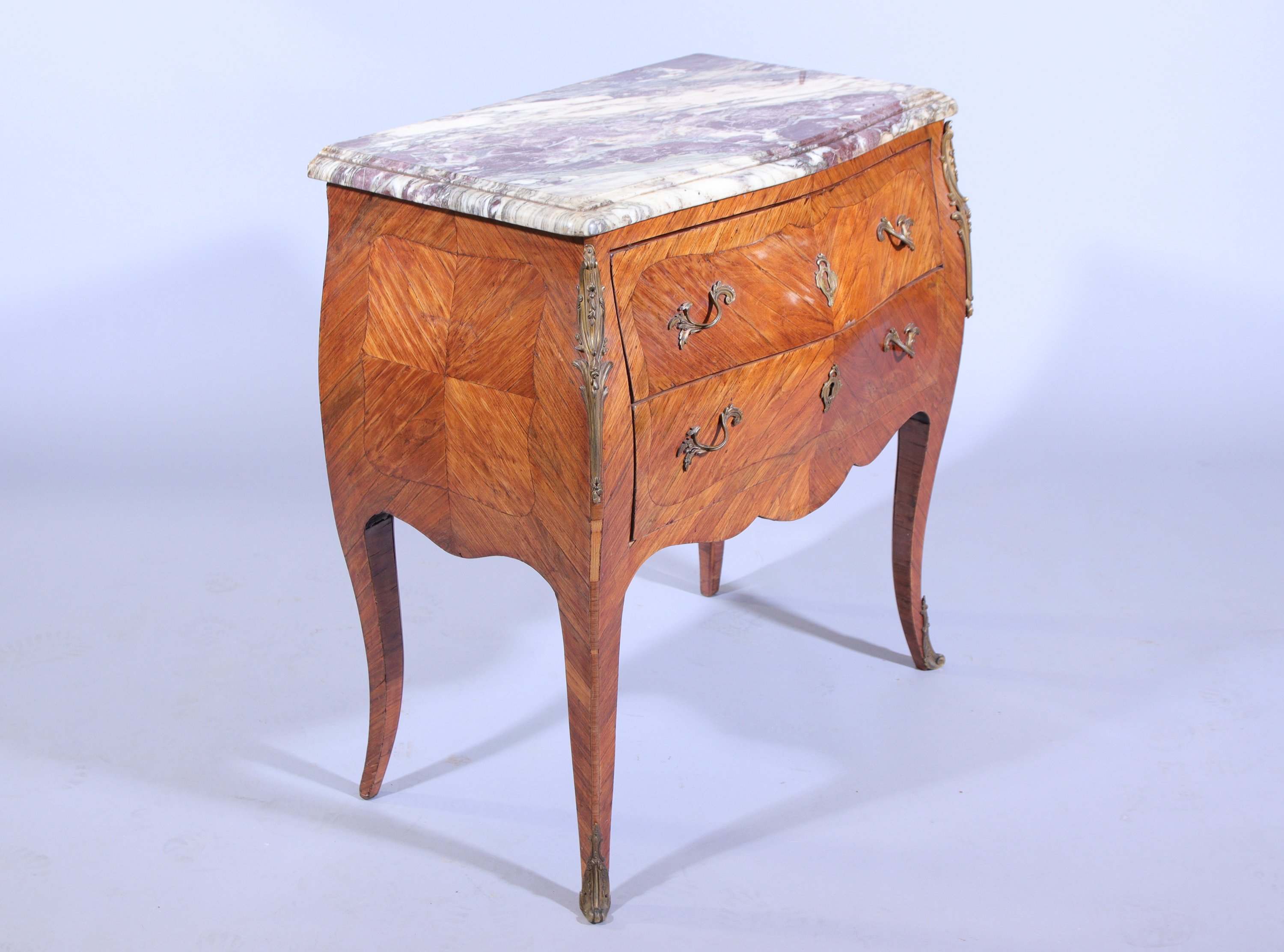 Elle ouvre par deux tiroirs sans traverse décorés d’une marqueterie en X. La ceinture chantournée, les montants pincés terminés par des pieds cambrés. Ornementation de bronzes comme entrées de serrures, poignées de tirage fixes, chutes et sabots.