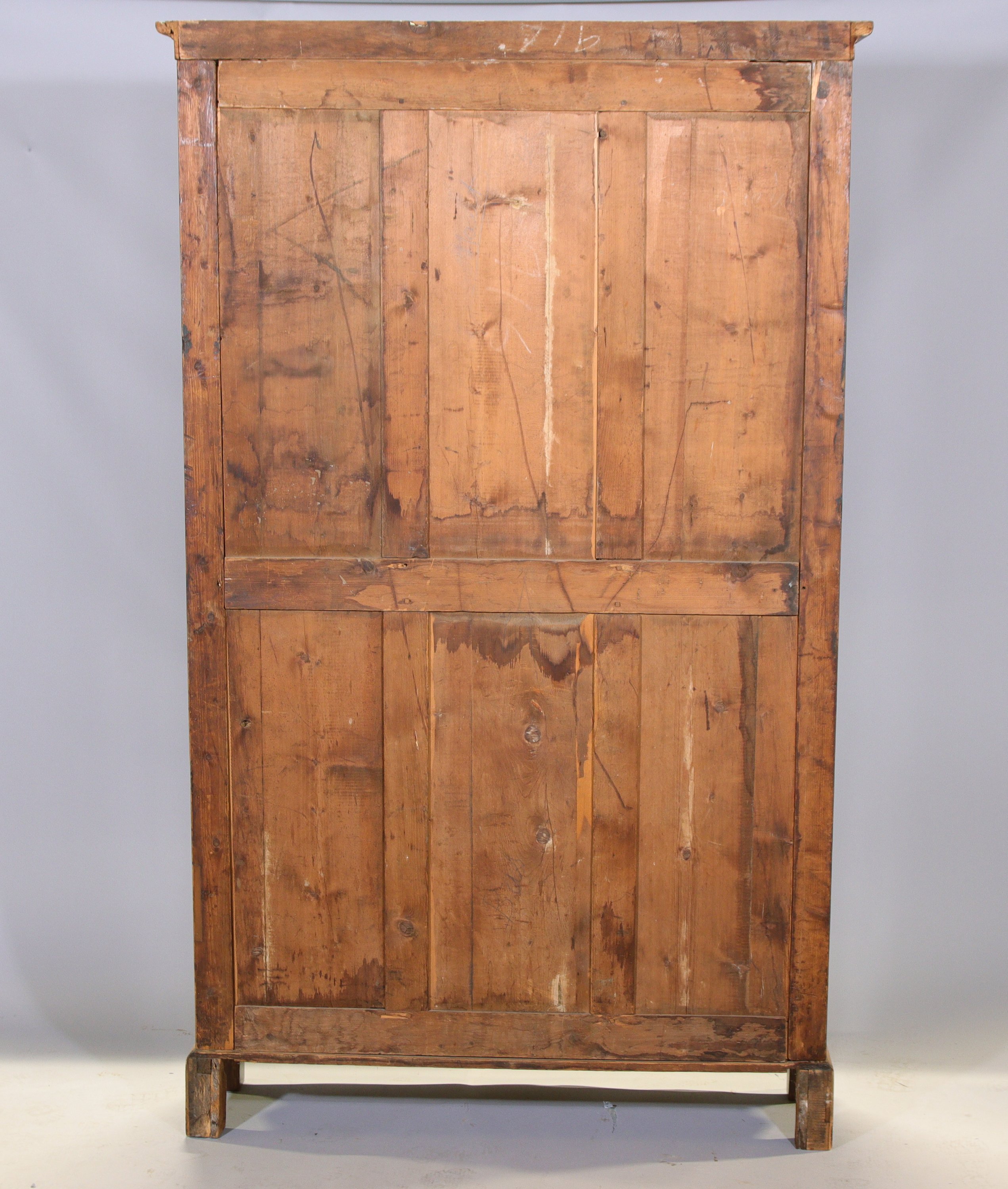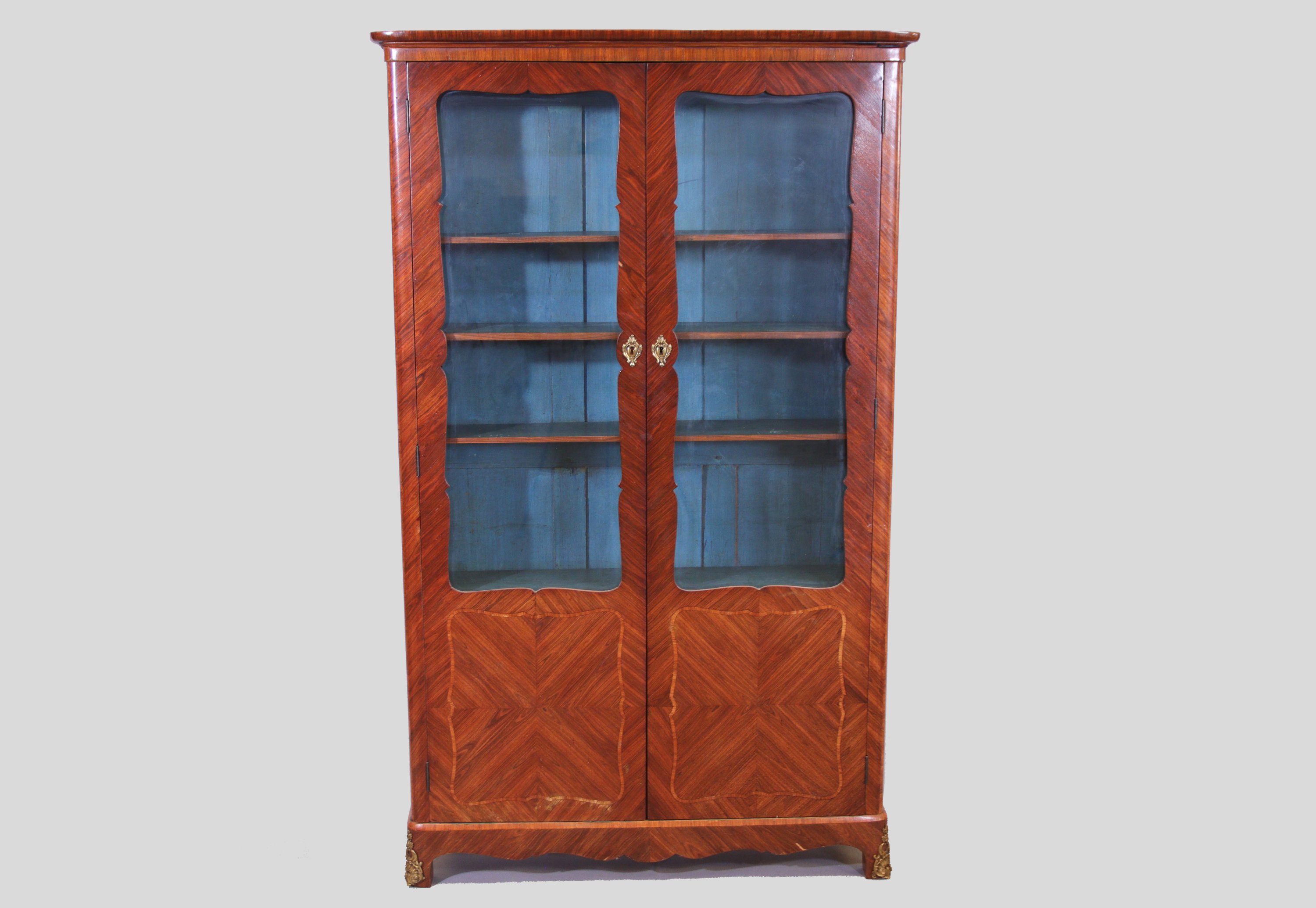 Coiffée d’une corniche et ouvrant par deux portes vitrées à entourage chantourné dont la partie inférieure est soulignée d’un filet. L’intérieur peint en bleu. Les côtés marquetés en chevrons, le tablier mouvementé. Quatre pieds.