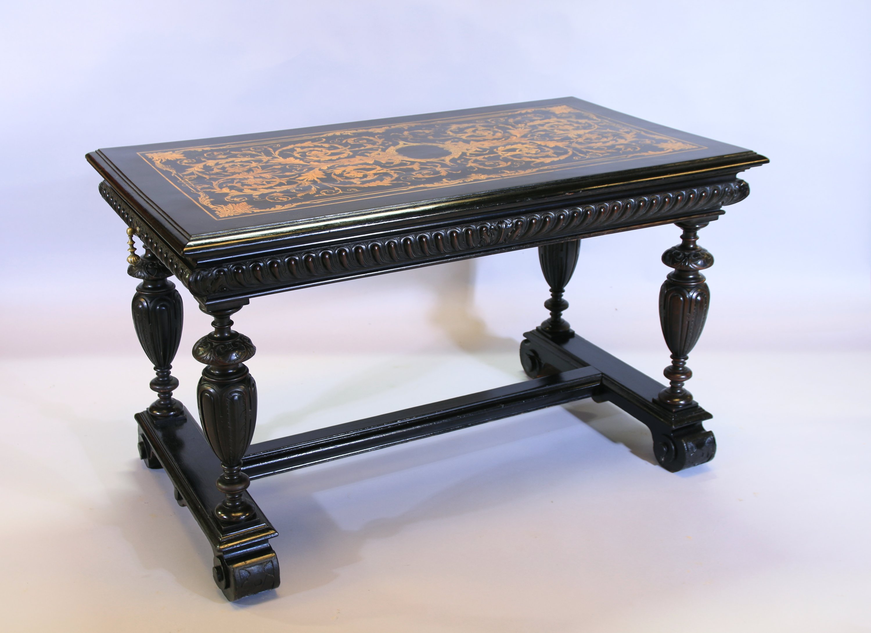 Le plateau marqueté à riche décor de rinceaux et feuilles d'acanthe. Il ouvre par deux tiroirs en ceinture dissimulés dans des godrons. Quatre pieds balustres réunis par une entretoise en H, il repose sur des pieds terminés par des volutues.