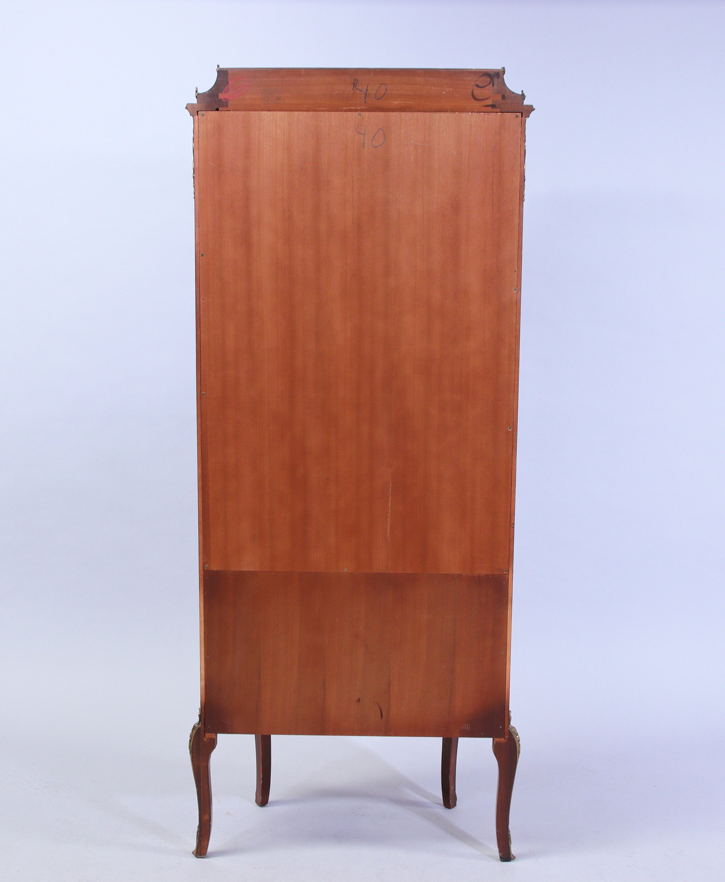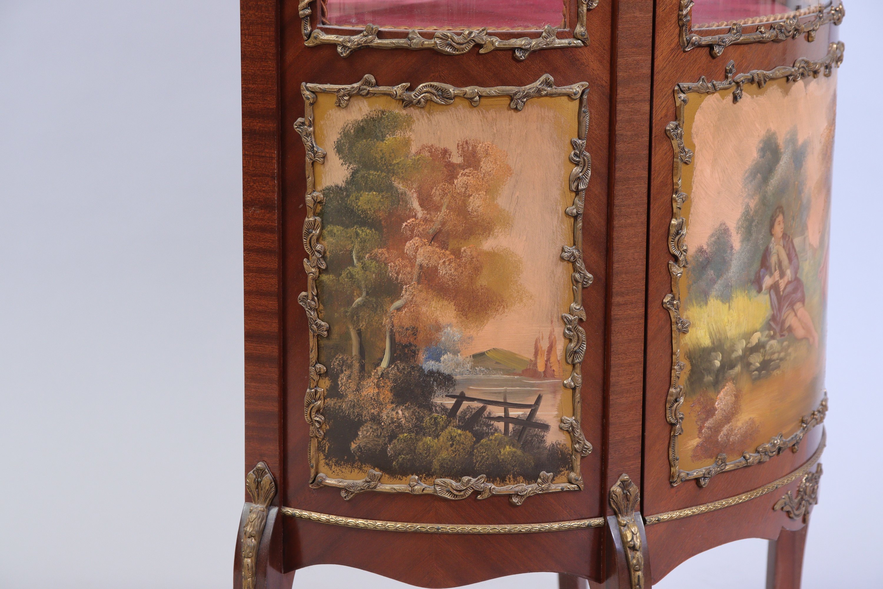 Coiffée d'une doucine, elle ouvre en façade par une porte vitrée découvrant deux étagères et terminée par un décor à l'imitation du vernis Martin figurant une scène galante encadrée de deux paysages lacustres. Quatre pieds cambrés. Ornementation en bronze.
