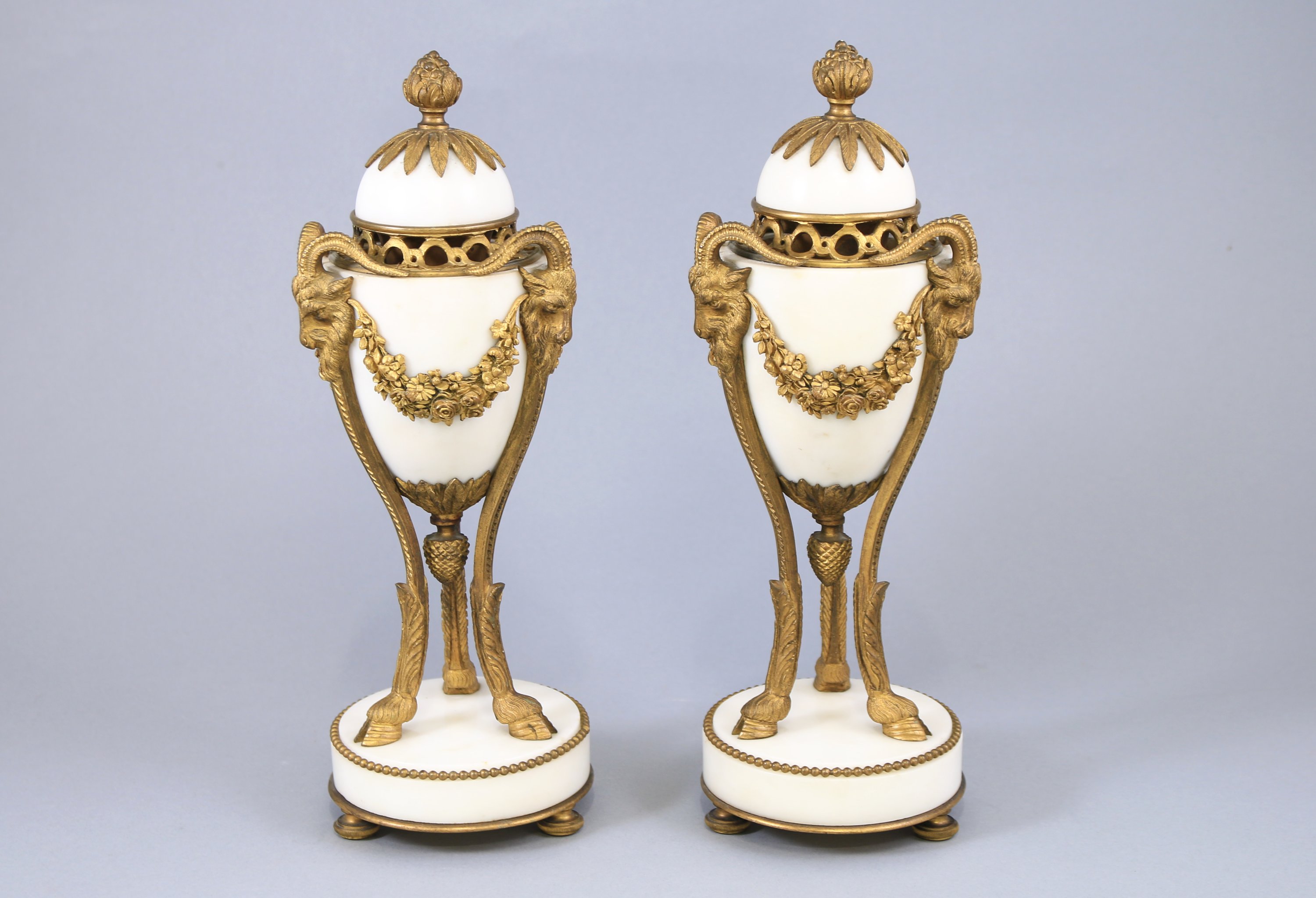 De forme ovoïde, elles présentent un fretel en grappe de raisin prolongé par des palmes. Le piètement tripode terminé par des sabots est orné de têtes de béliers reliées par des guirlandes de fleurs. La base décorée d'une frise de perles repose sur trois pieds patins.
