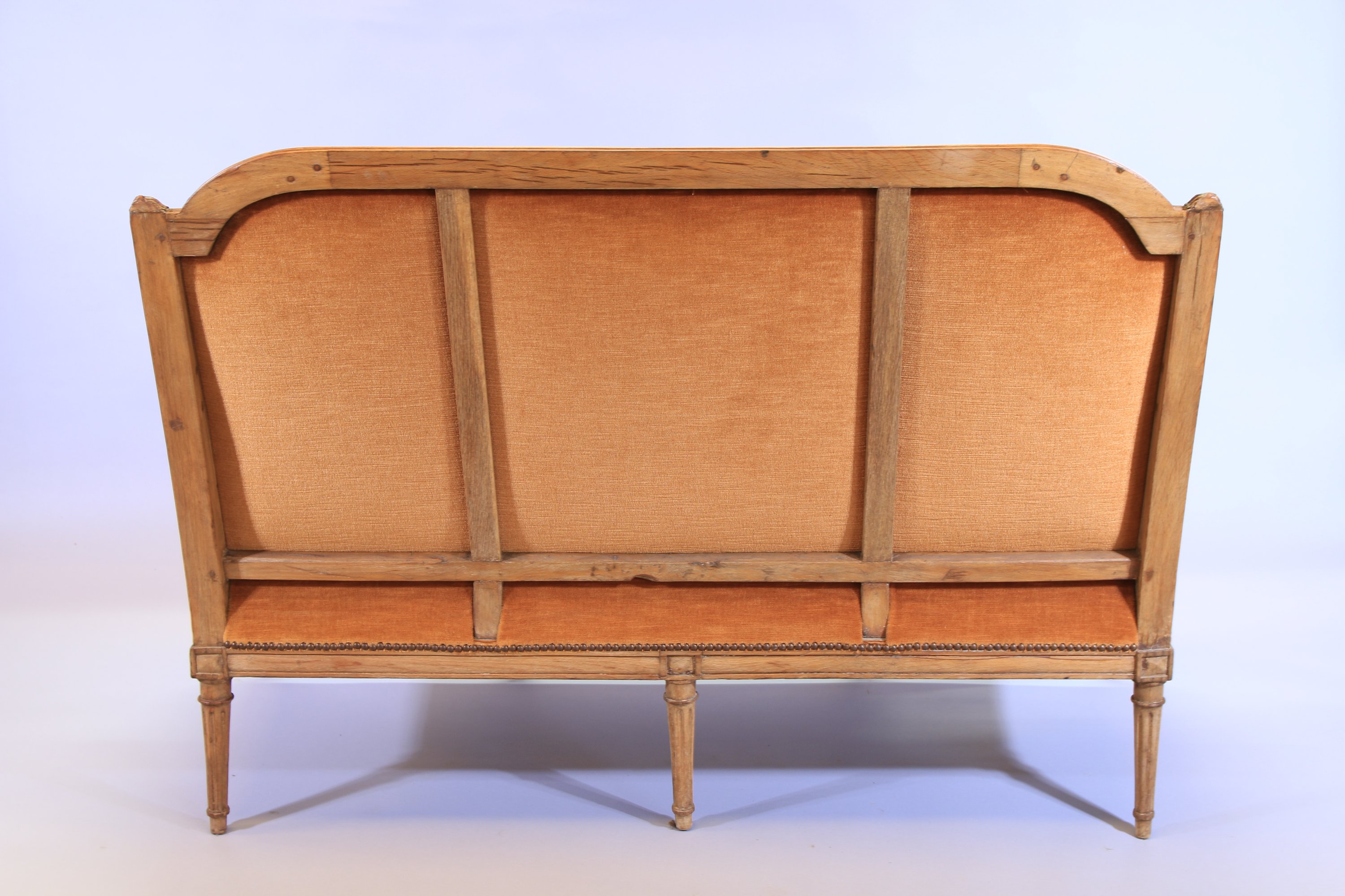 Dossier en chapeau de gendarme, accoudoirs à manchettes terminés par des enroulements, montants cannelés et rudentés. Ils reposent sur huit pieds fuselés, cannelés et rudentés, fleurettes aux dés de raccordement.