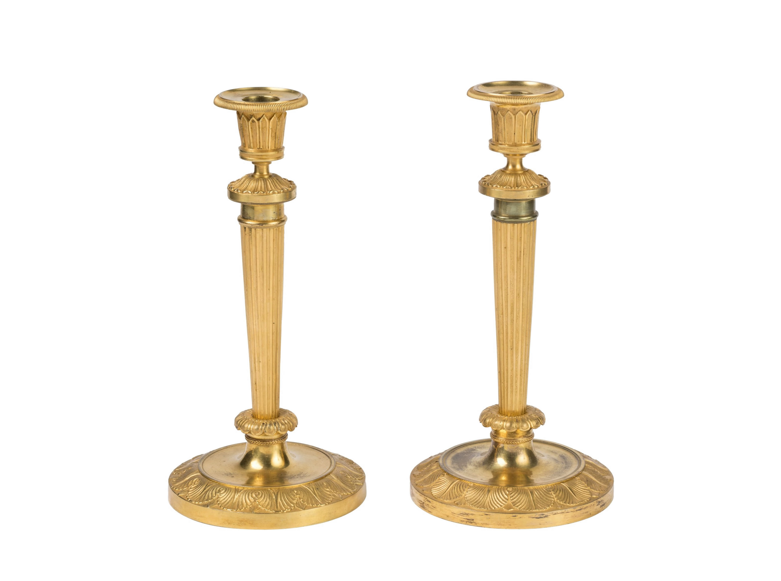 Le fût tronconique cannelé et répertoire décoratif de feuillage réniforme pour la base.