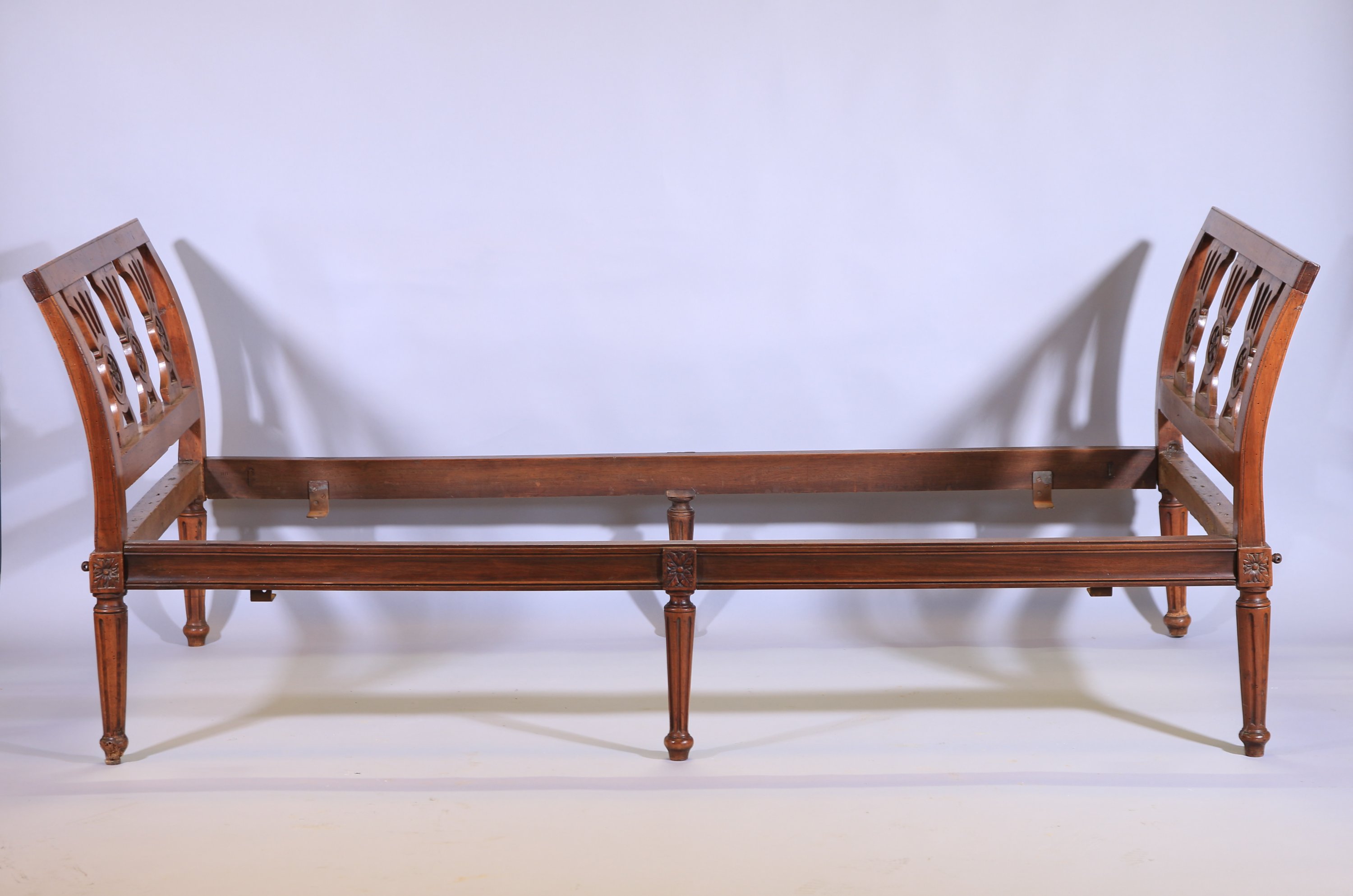 Les montants renversés sont ajourés de motifs de fleurs et de mongolfières. Ils reposes sur six pieds fuselés et cannelés, fleurettes aux dés de raccordement.