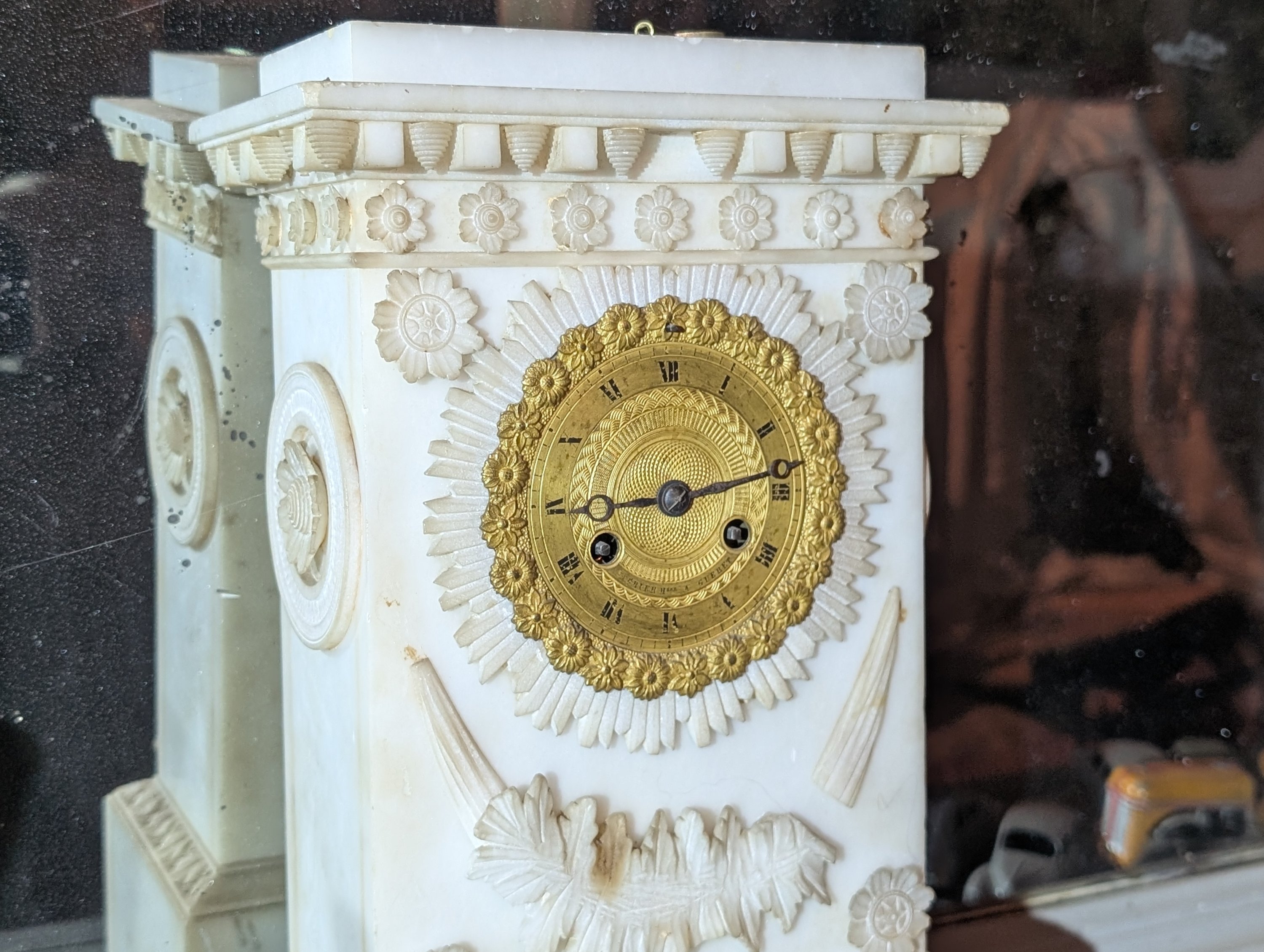 Le cadran en bronze s'inscrit dans un cercle rayonnant, décor de rosette, guirlande et corniche à créneaux.