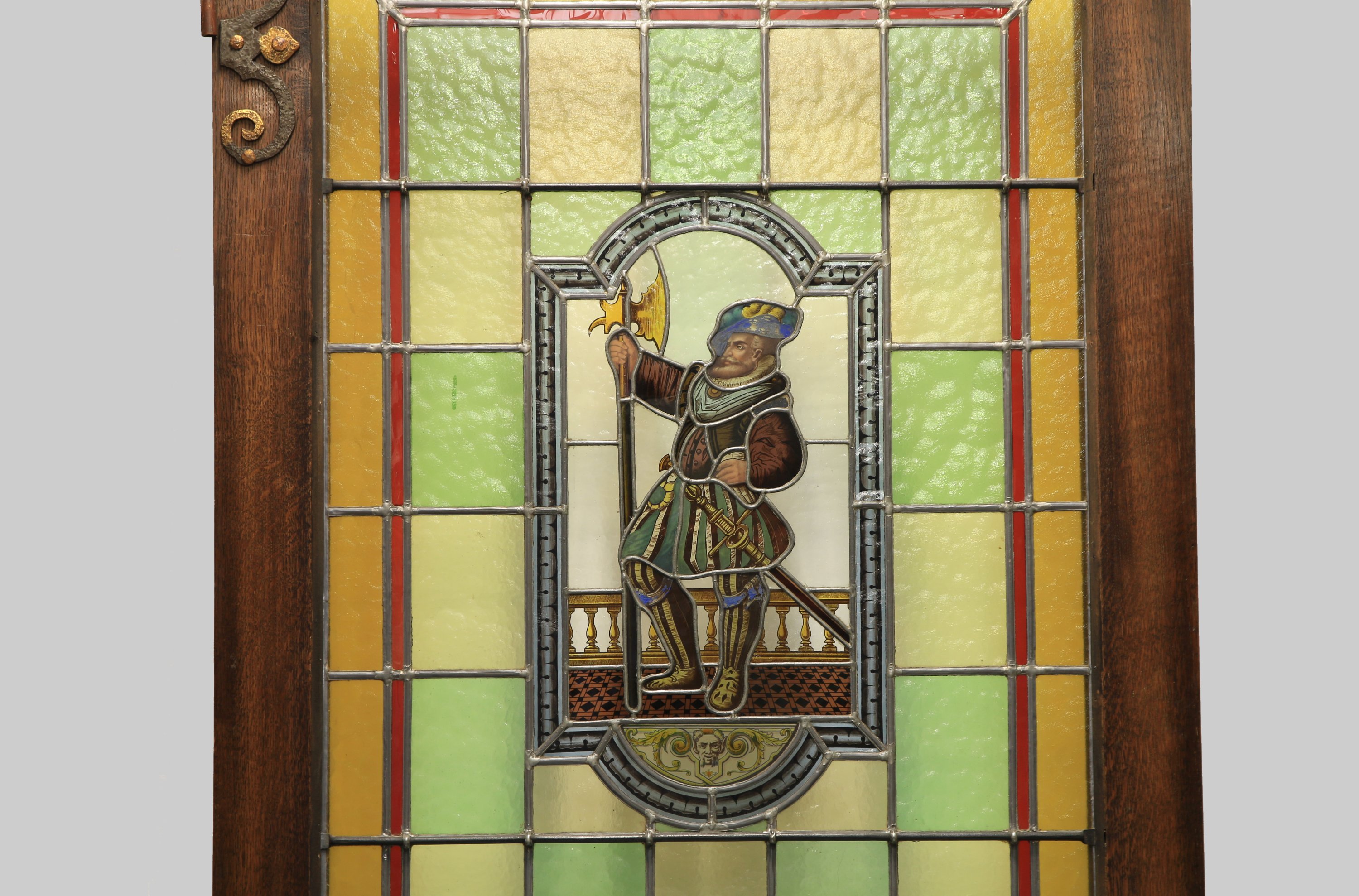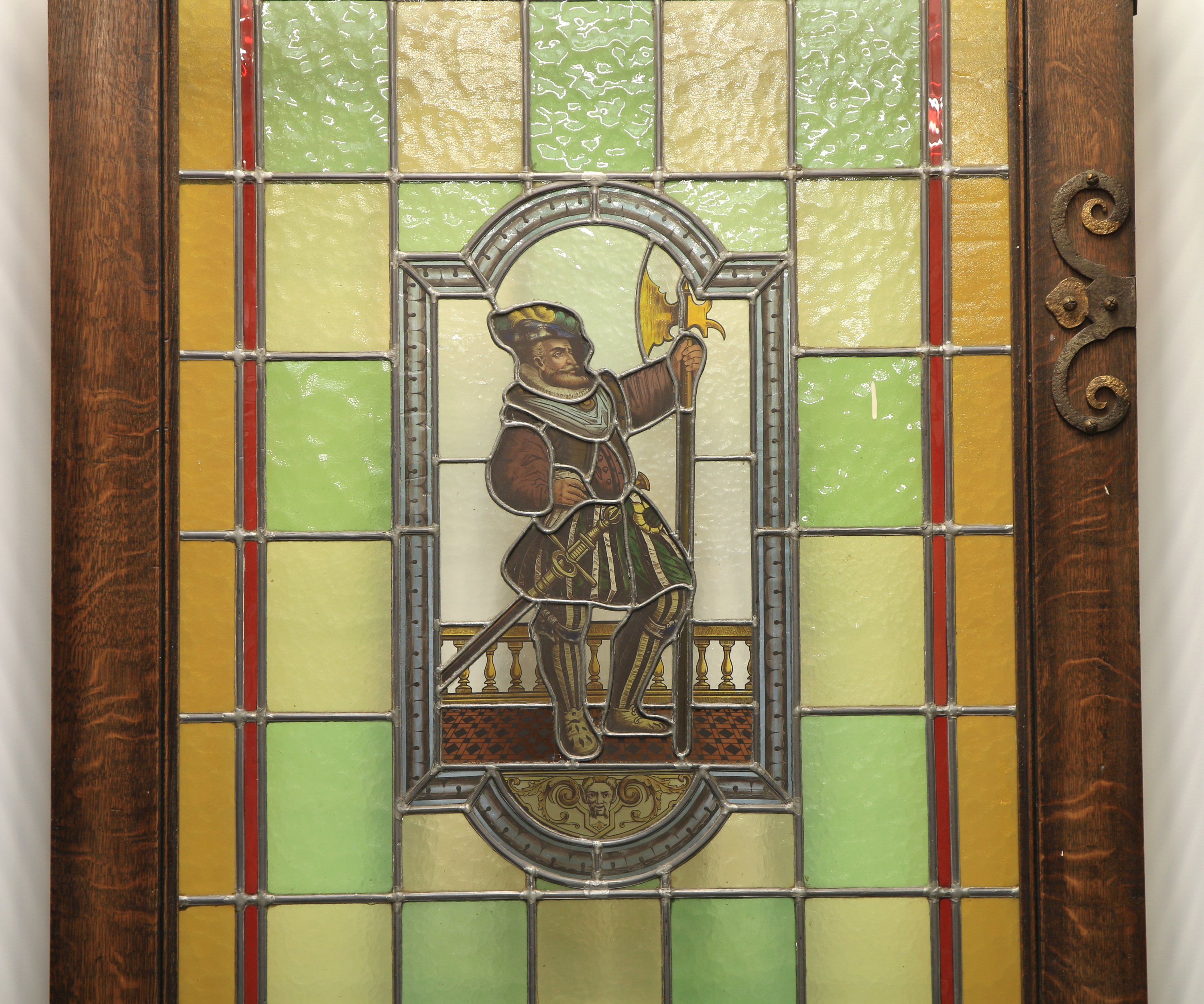 Le vitrail arborant un médaillon avec un lansquenet devant une balustrade, dans un entourage de carreaux jaunes et verts.
