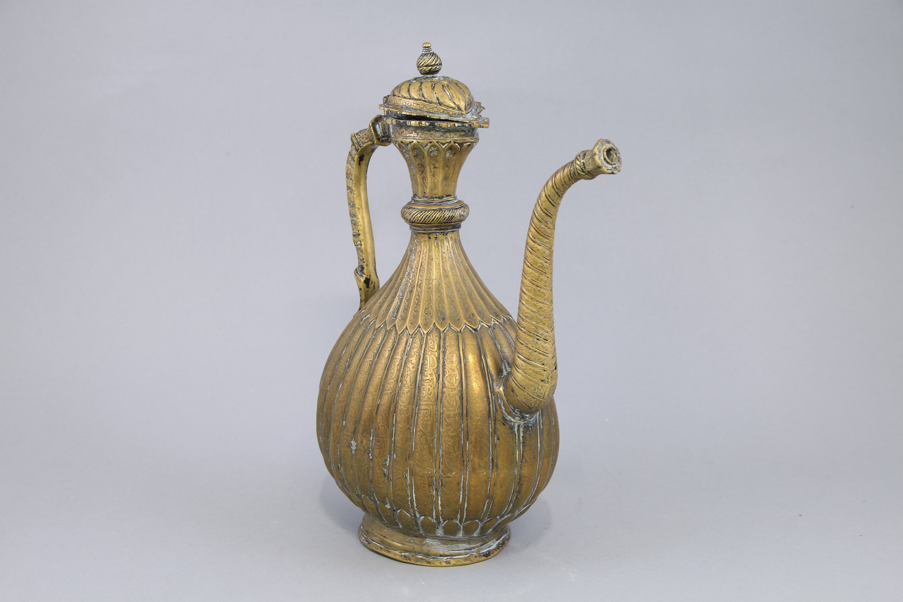 A décor de godrons rehaussés de calligraphies et de rinceaux, bec et anse torsadés, le fretel en forme de coupole bulbeuse.