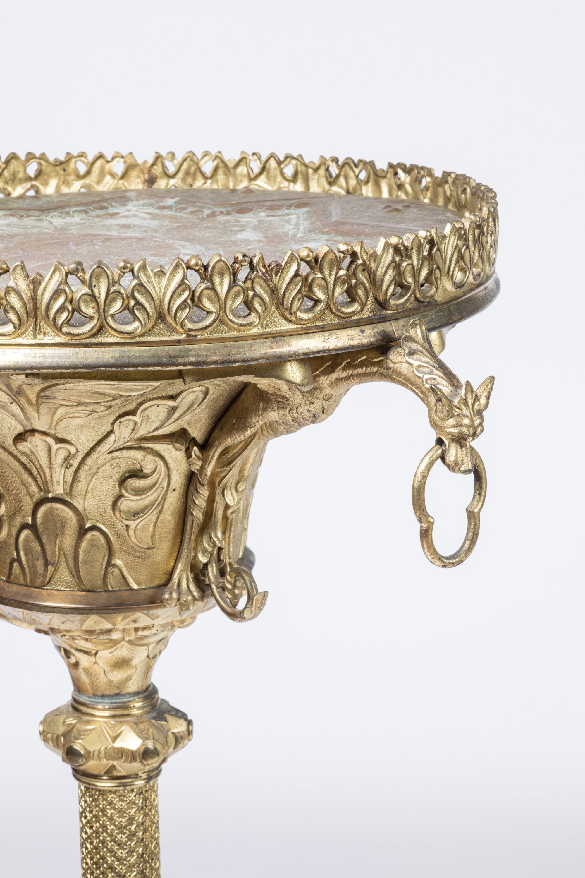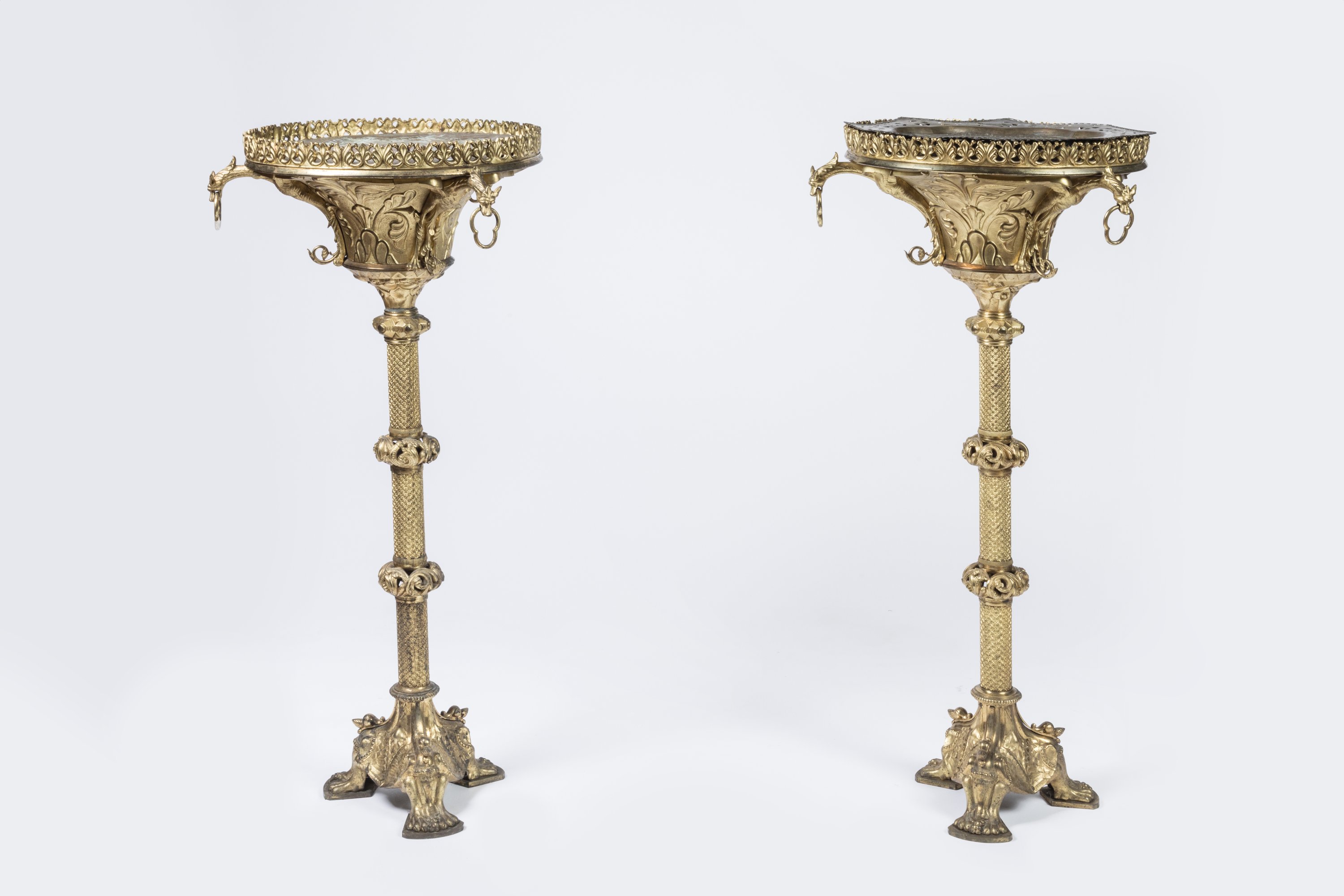 France, Second Empire. A pair of ormolu stands decorated with fabulous beasts and topped with oriental-style pierced vases.