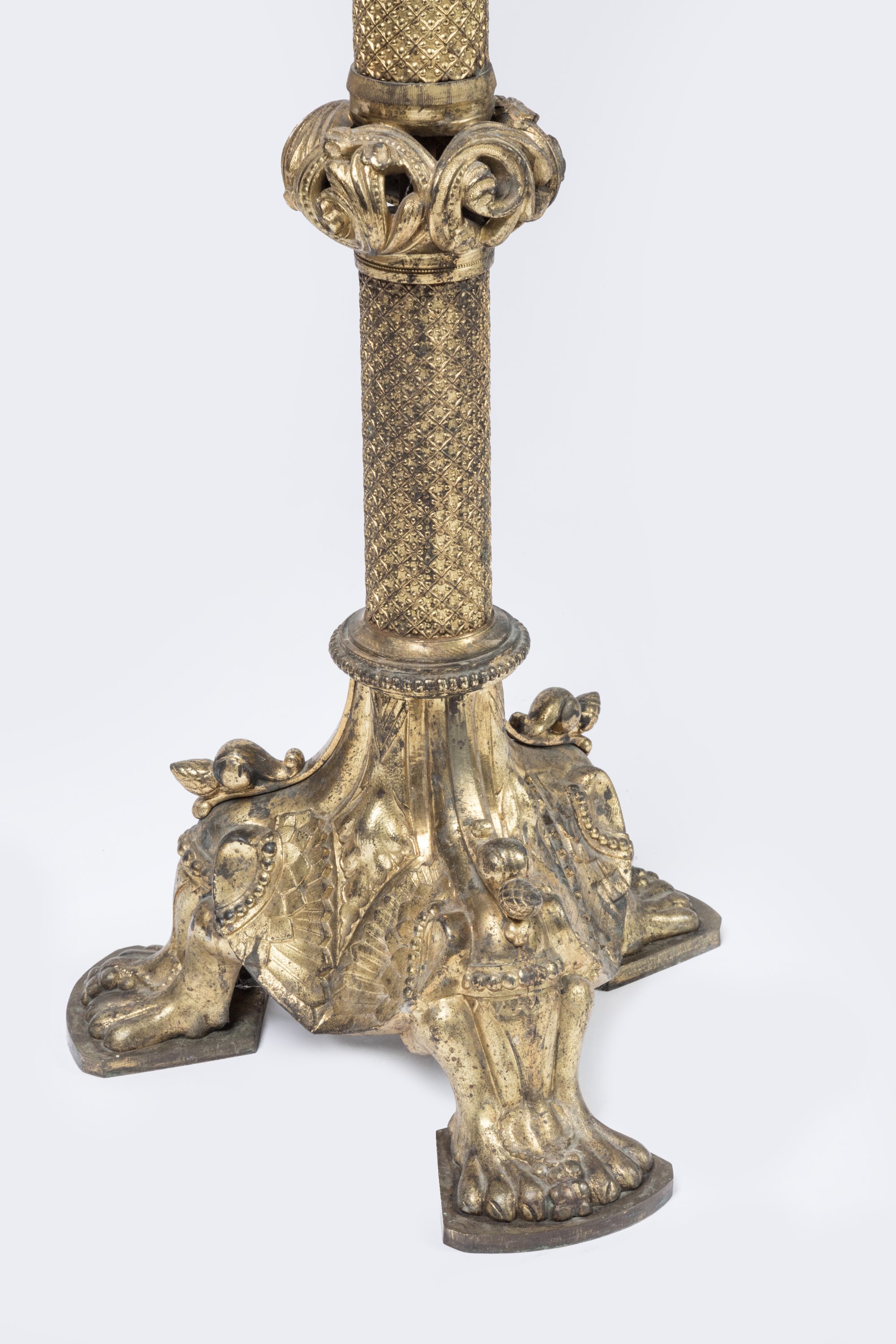 Surmontées d'un vase orientaliste repercé, ornées de trois têtes de dragons retenant des anneaux sur un fût central reposant sur trois pieds en griffes de lion.