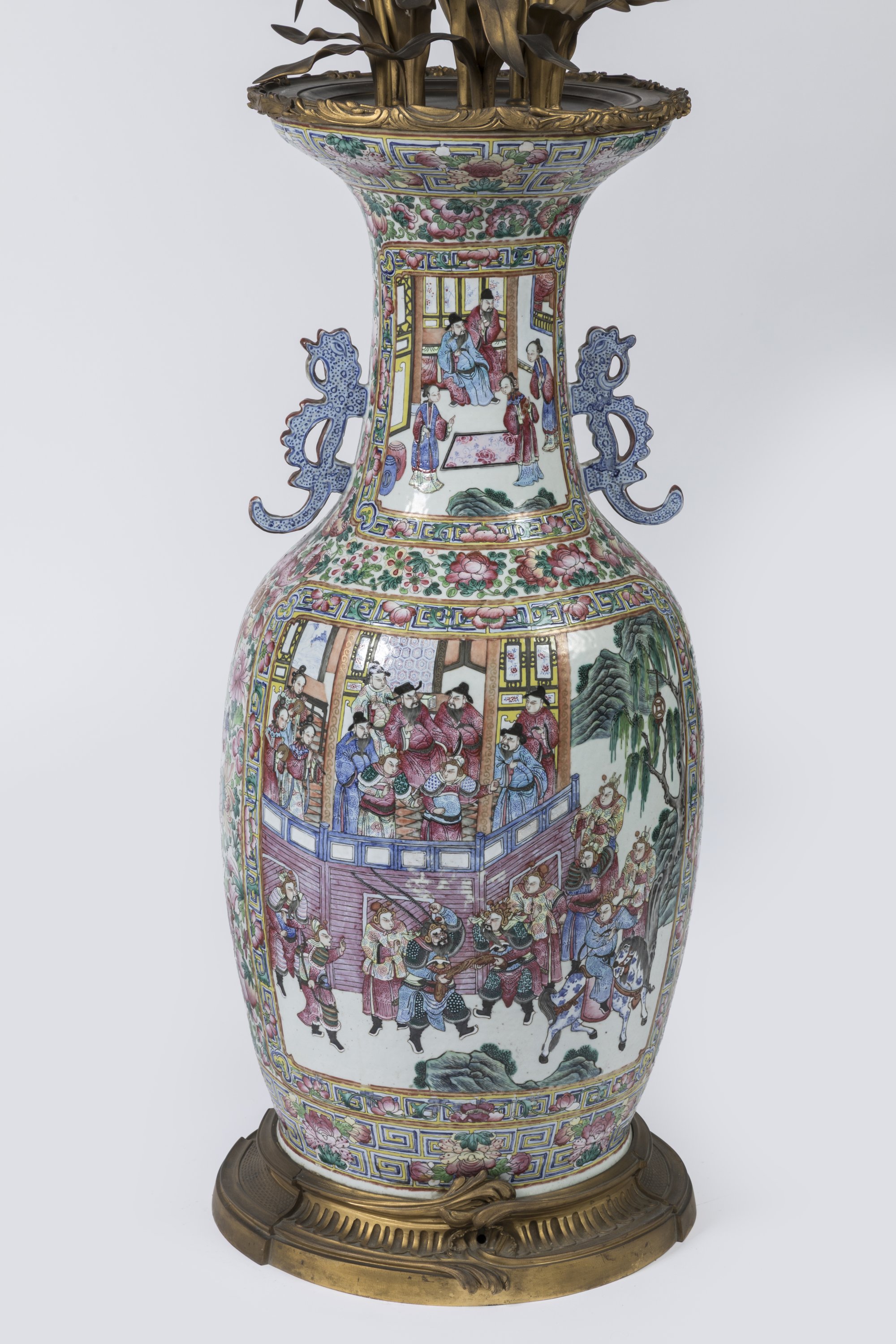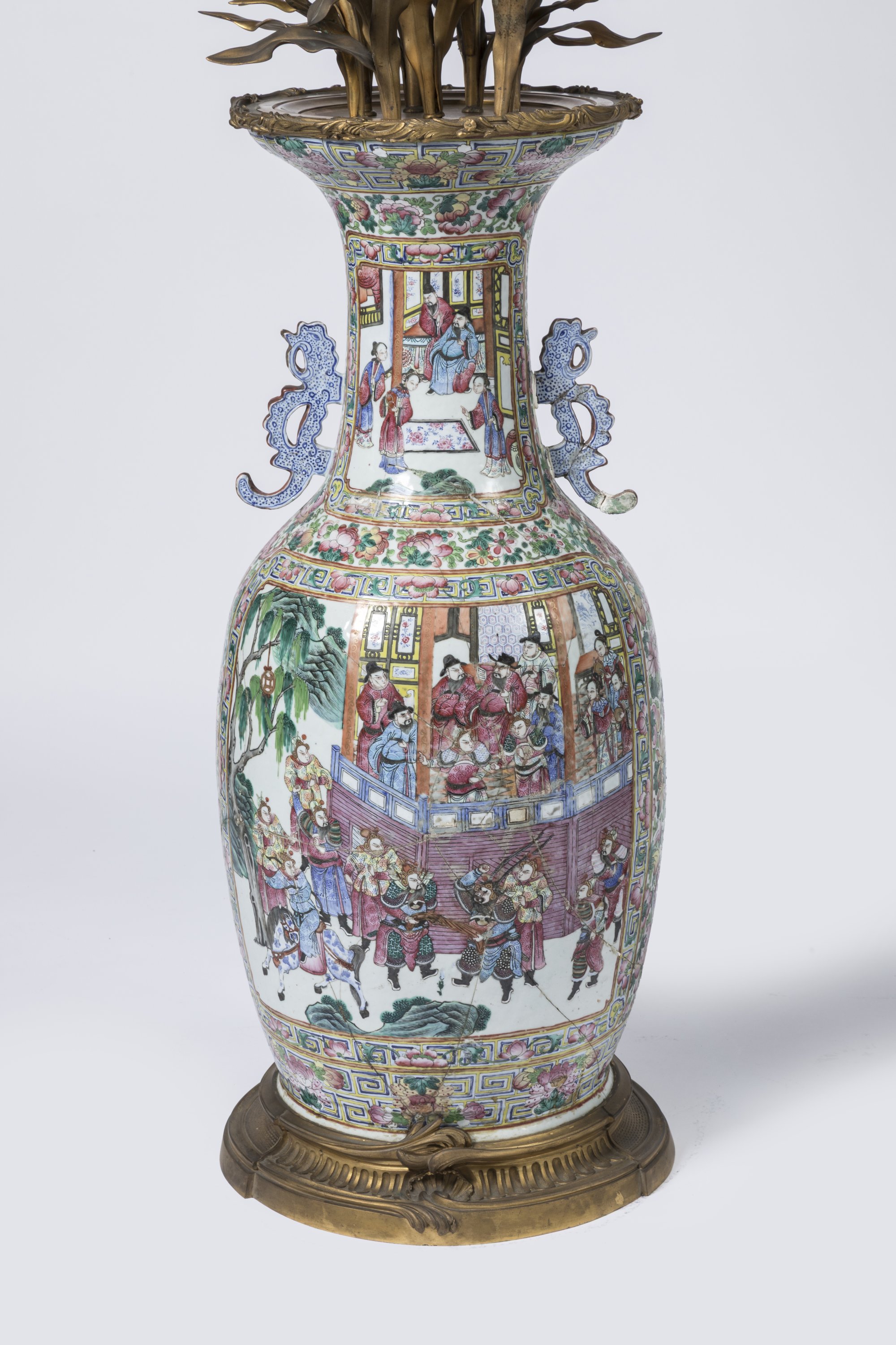 De forme balustre à décor émaillé de scènes de palais. La monture en bronze doré sous la base et à la lèvre retient en partie supérieure huit branches fleuries en bronze doré terminées par des fleurs de lys formant flambeaux.