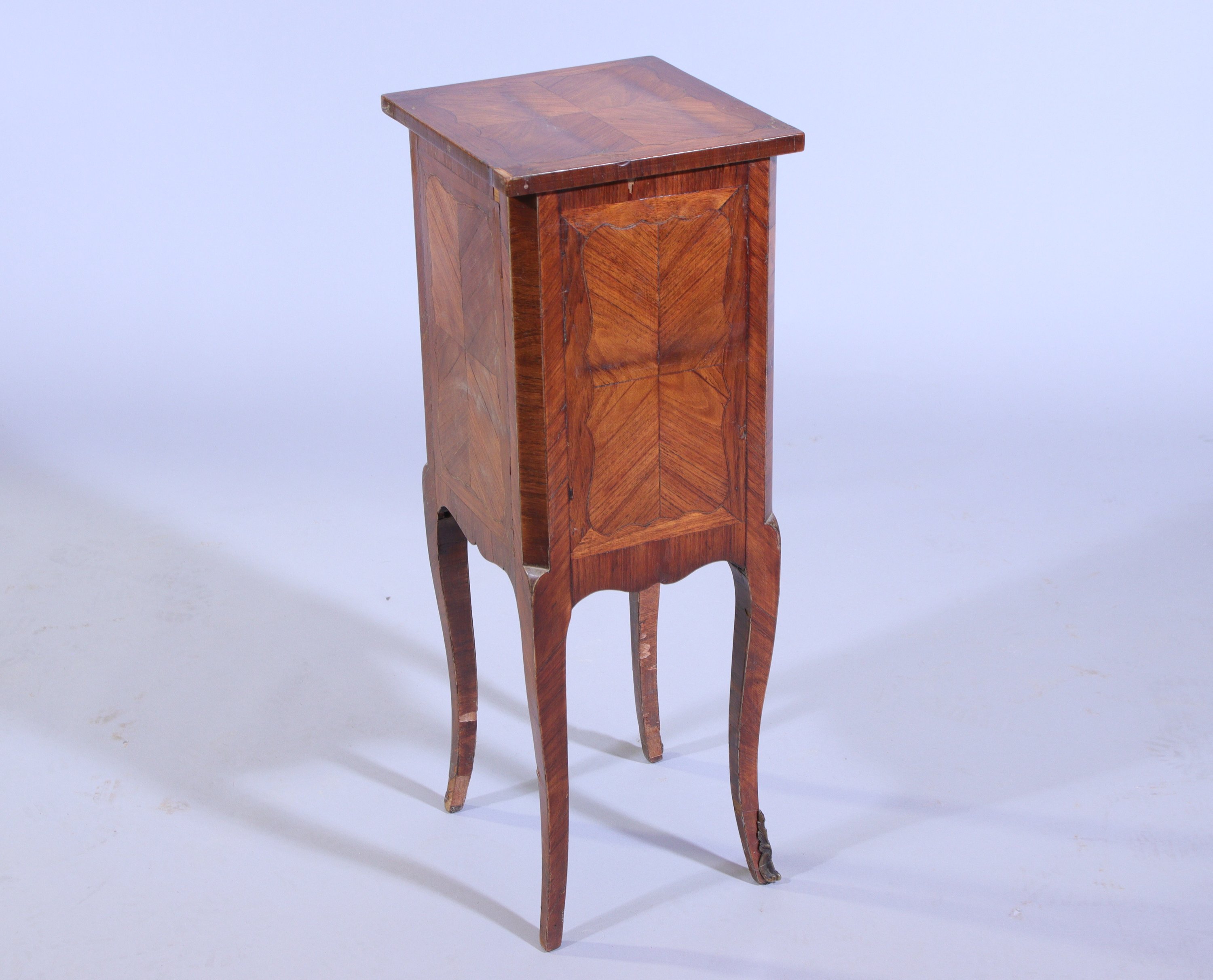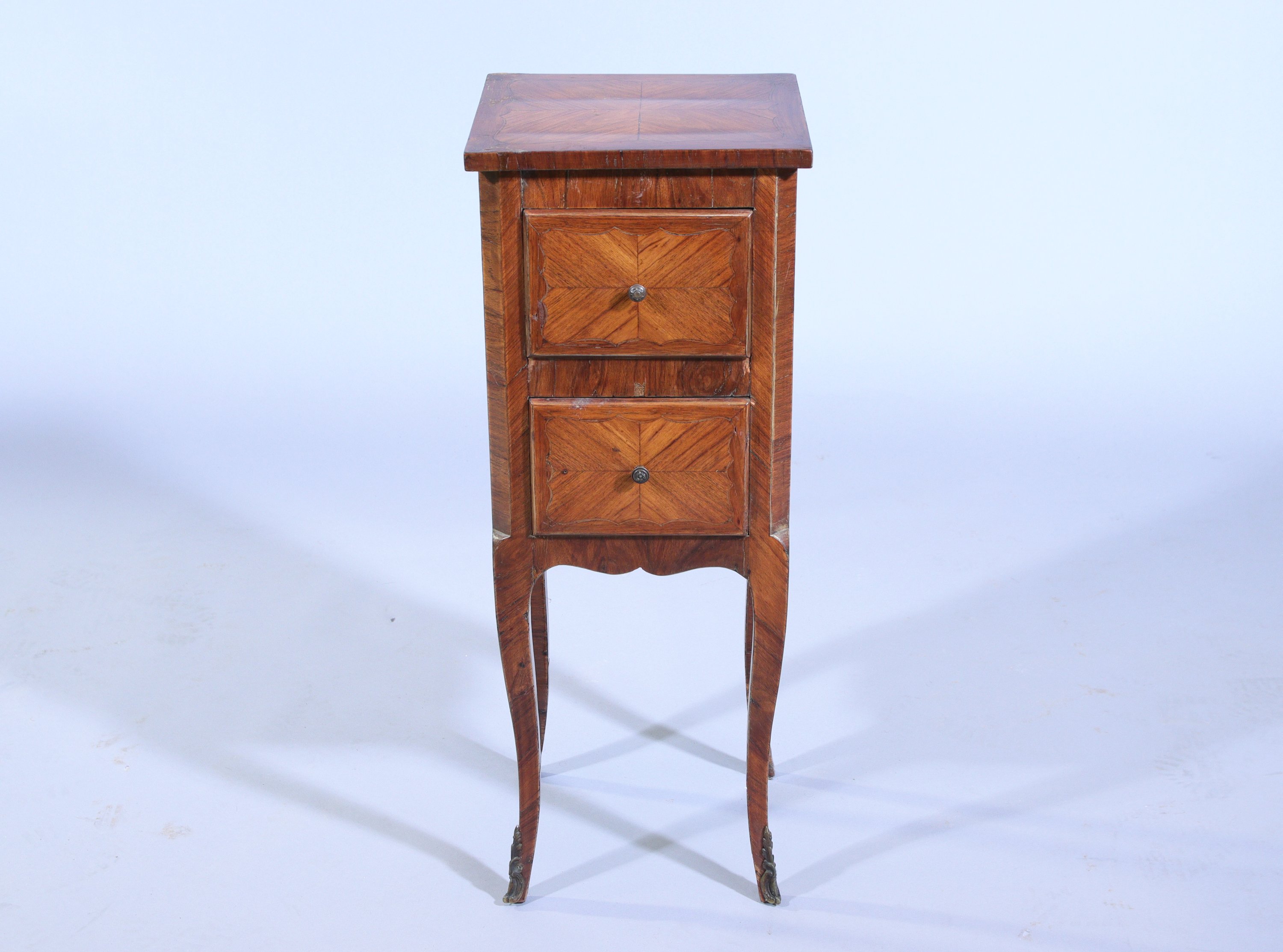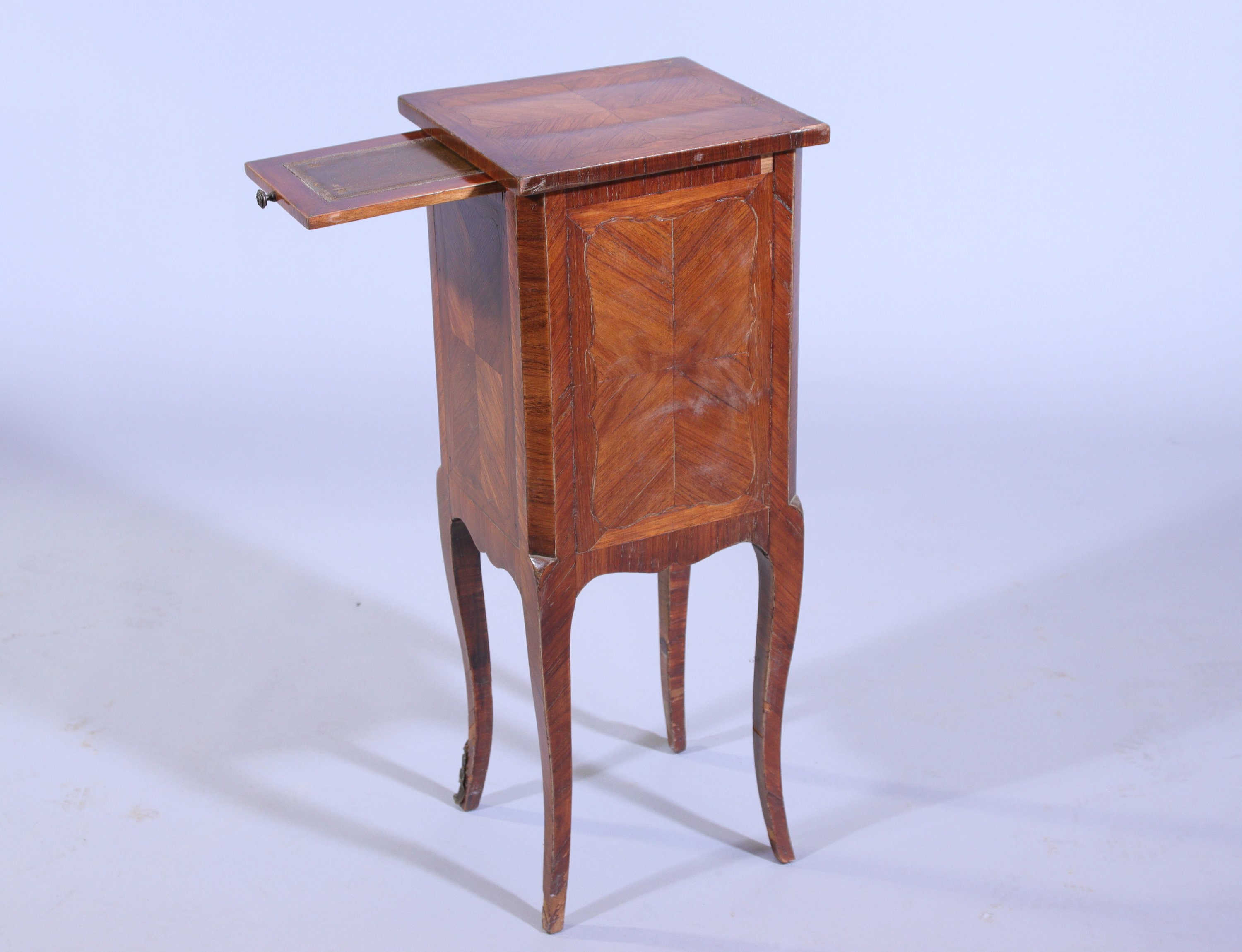Jointe: Jolie table volante en placage de bois de rose. Le plateau carré surmontant deux tiroirs séparés par une traverse. Un côté présentant une tablette gainée d’un cuir. Quatre pieds cambrés. Style Louis XV de qualité. Haut. 70,5 Larg. 27 Prof. 25 cm. (sauts de placage)