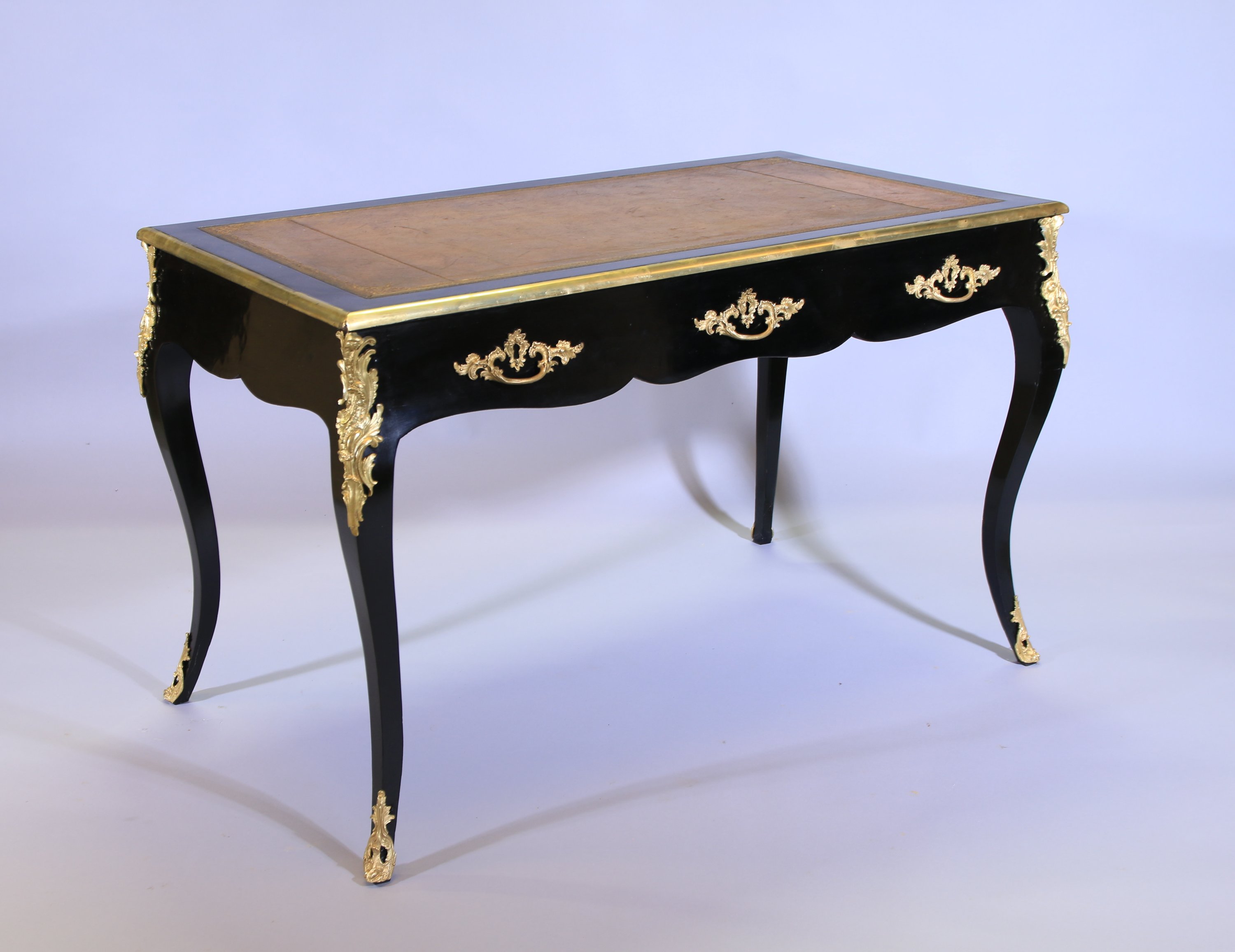 Il ouvre par trois tiroirs en ceinture. Plateau ceint d'une lingotière et foncé d'un cuir havane doré au petits fers de motifs d'acanthes et de rinceaux, trois tiroirs simulés en façade. Il repose sur quatre pieds cambrés.