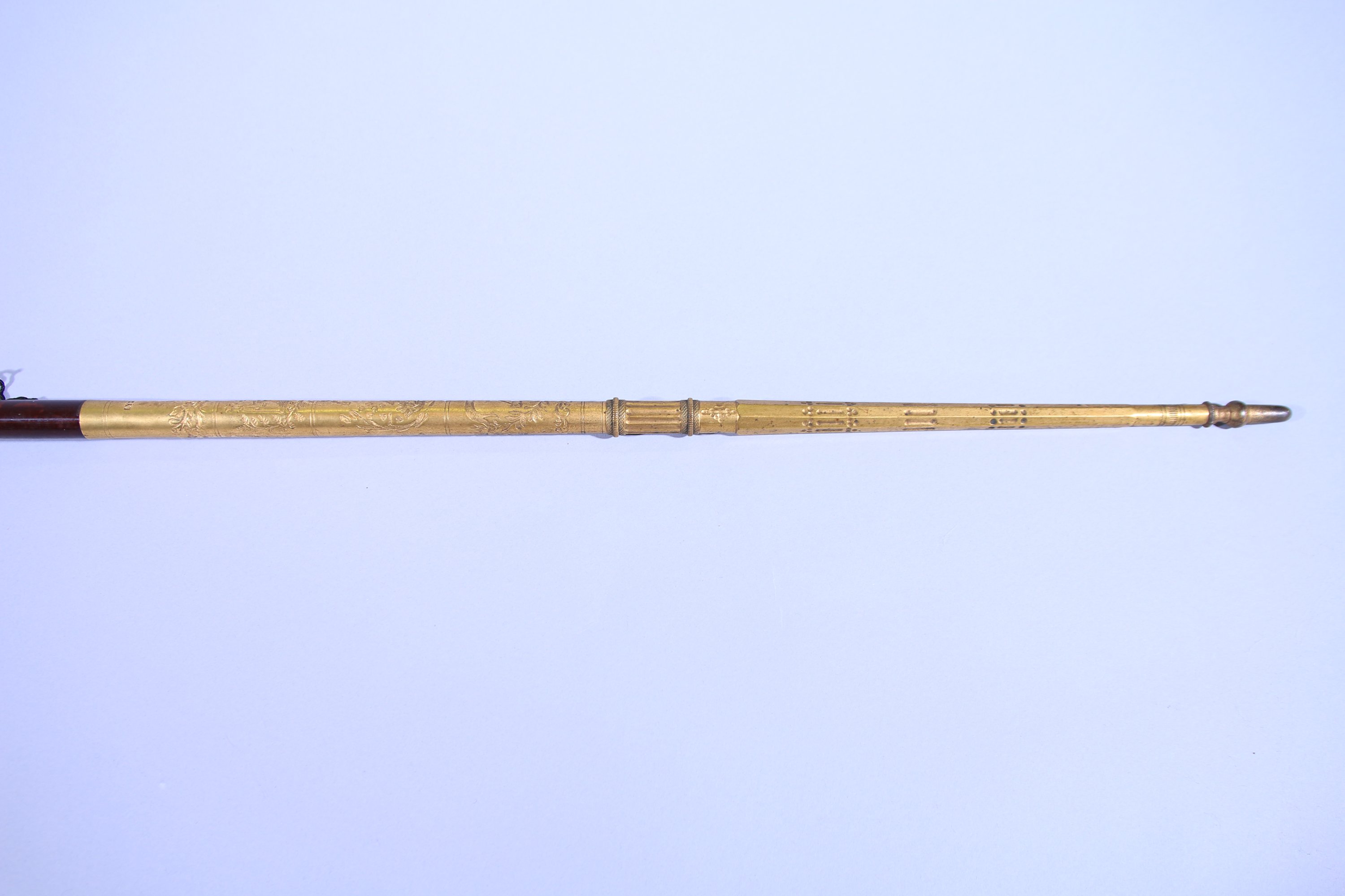 Pommeau octogonal en corne orné d'une pastille en laiton inscrite " E.R. Angoumois le Bien Aimé / R.A. Nantes St Eloi d'été 1897" ainsi que les lettres "G.A.D.H.A.C / D.D.E.D.M.J". férule en laiton dévissable à décor de symboles initiatiques portant une inscription "Lyon 1893 déposé /645".