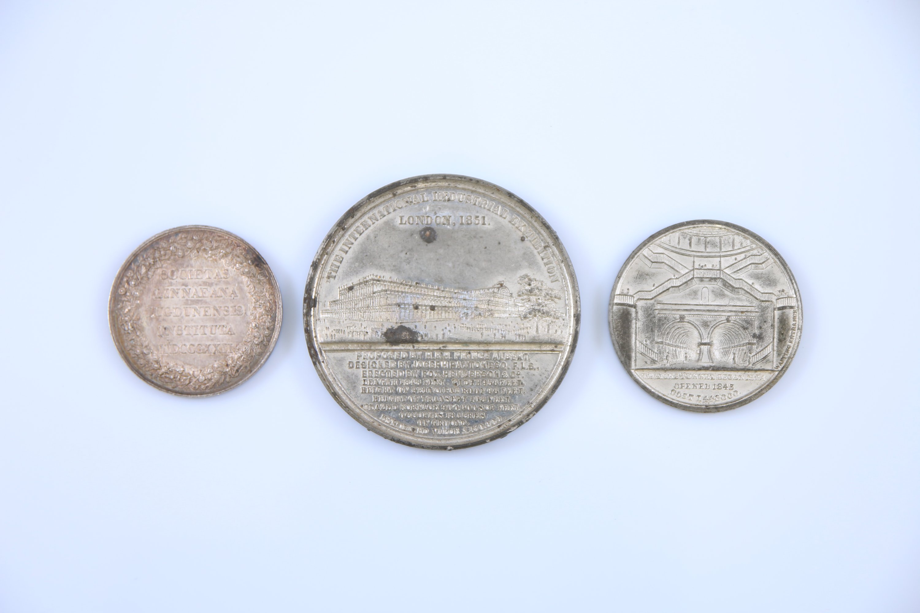- Médaille en étain de l'Exposition Universelle de Londres de 1851 portant à l'avers la figure de profil du Prince Albert et au revers le Pavillon de cristal et de son histoire. Diam.: 36 mm.